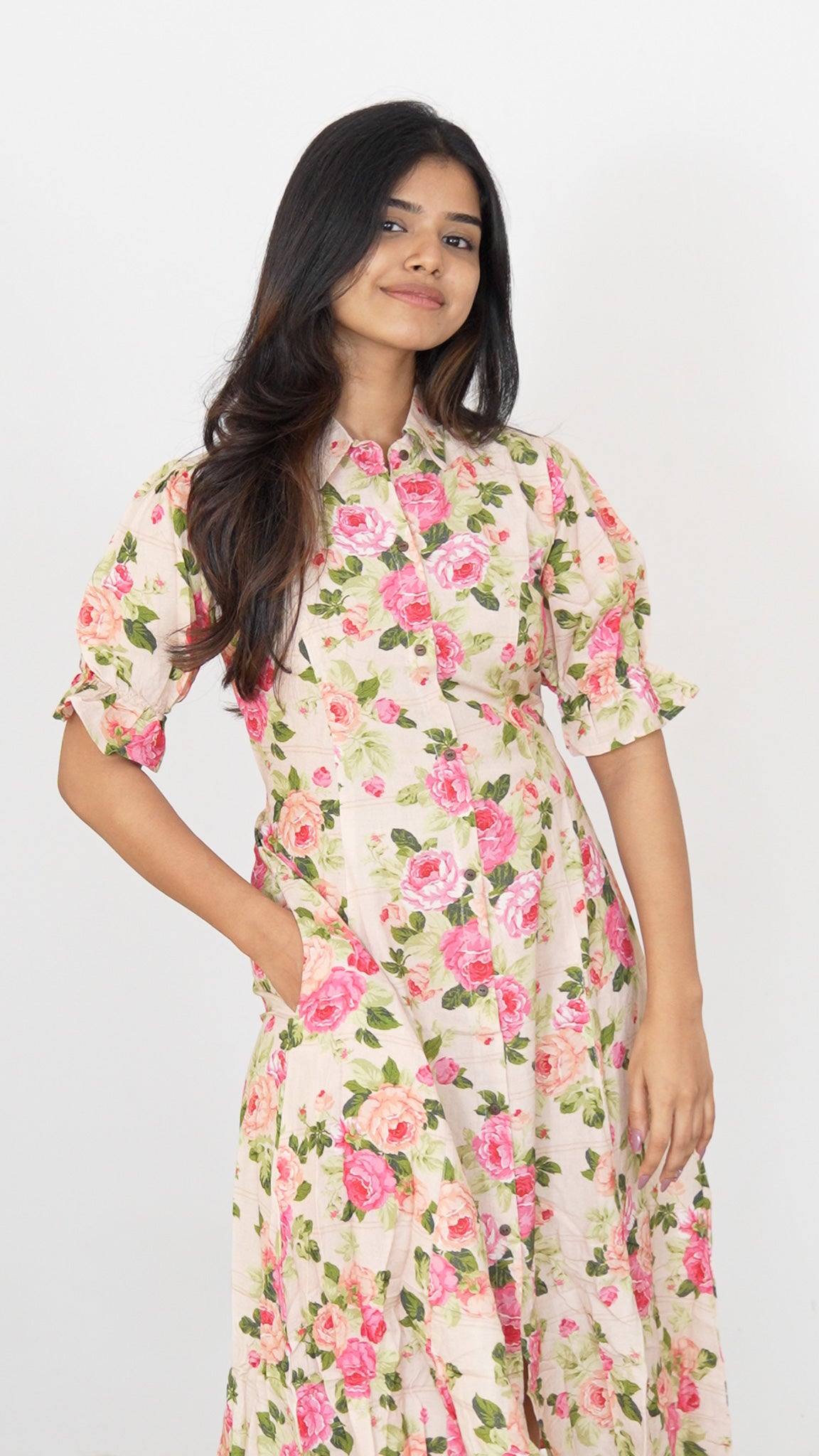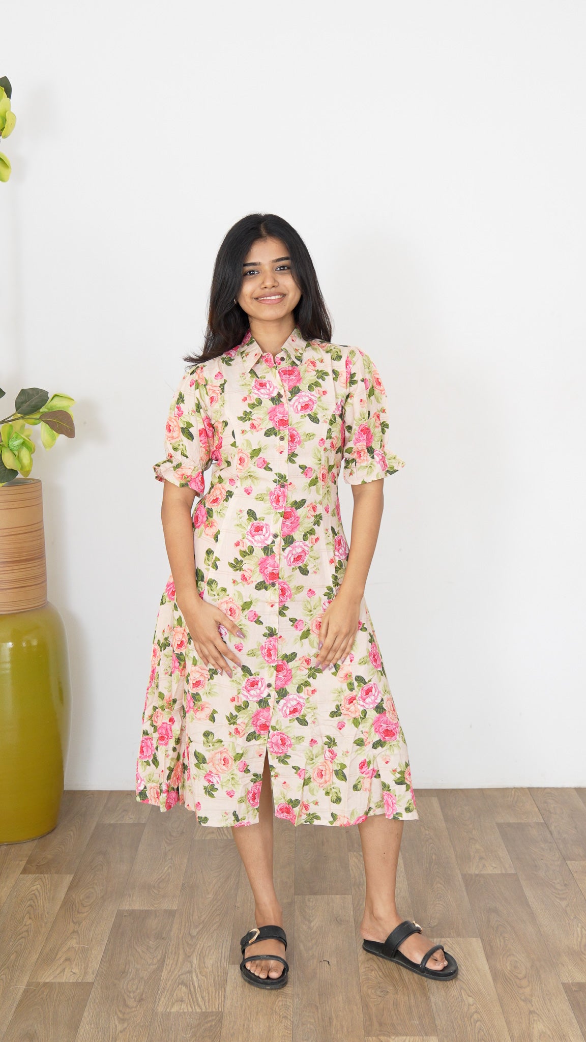 Off white shirt dress that exudes elegance and sophistication. It has buttons running down. Buttons cannot be opened.