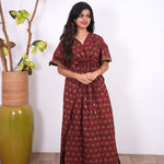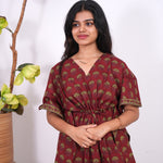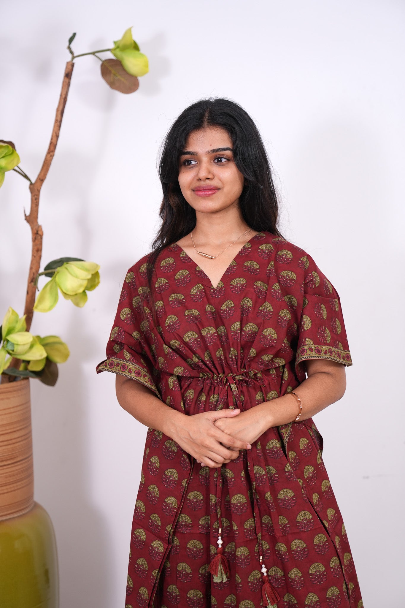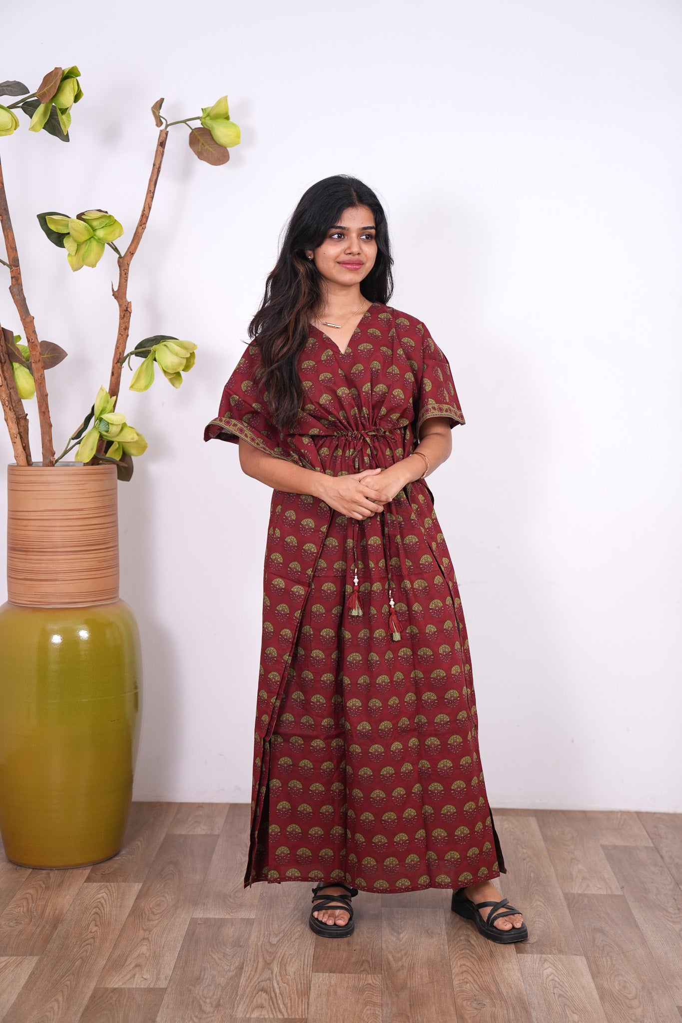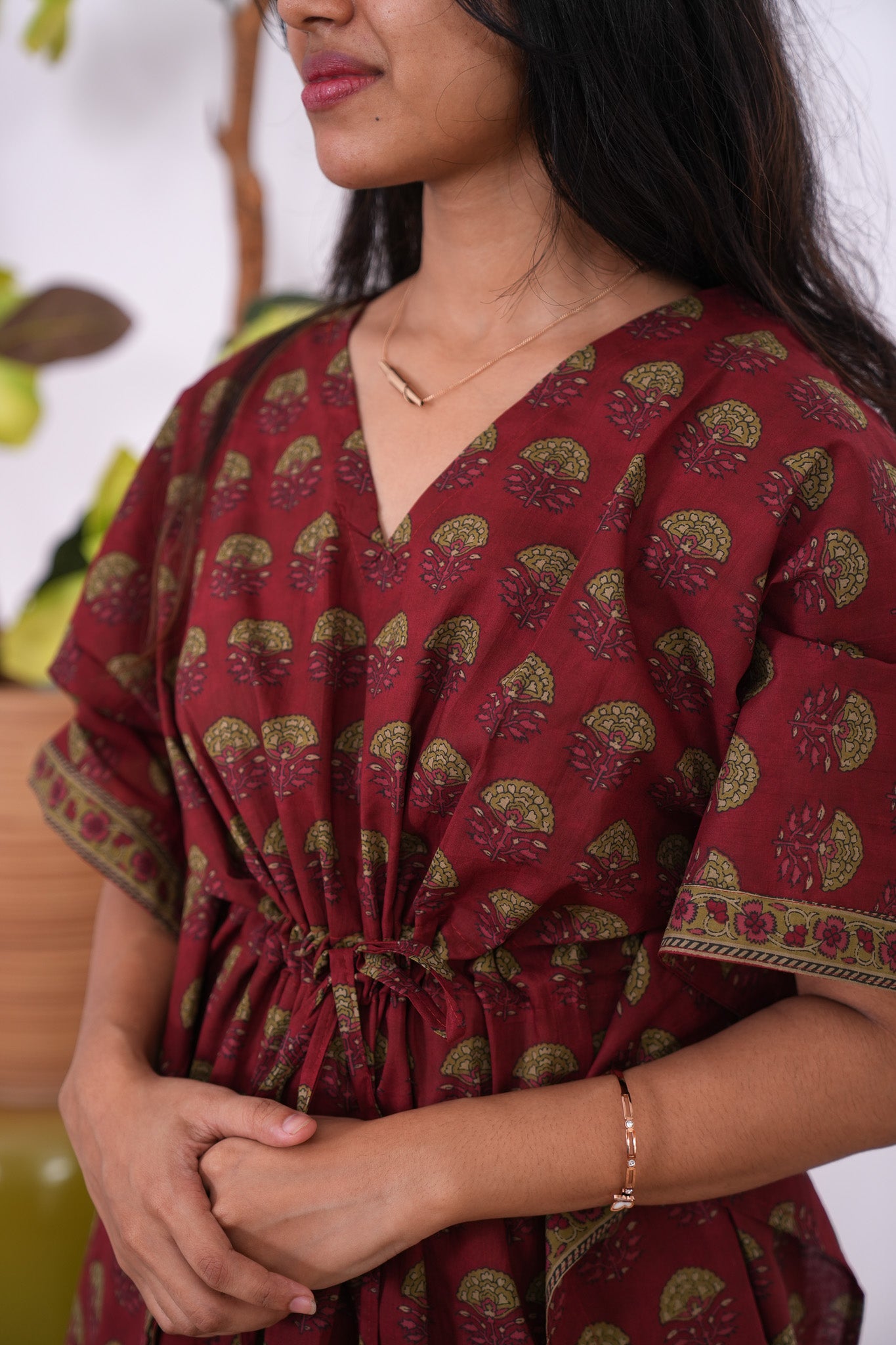 Easy breezy cotton kaftan made for you to feel absolute comfort, elegance and a total stunner at the same time. It comes V neck and tie in the centre with flowy silhouette and floral prints all over.
