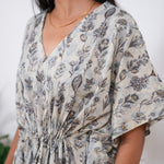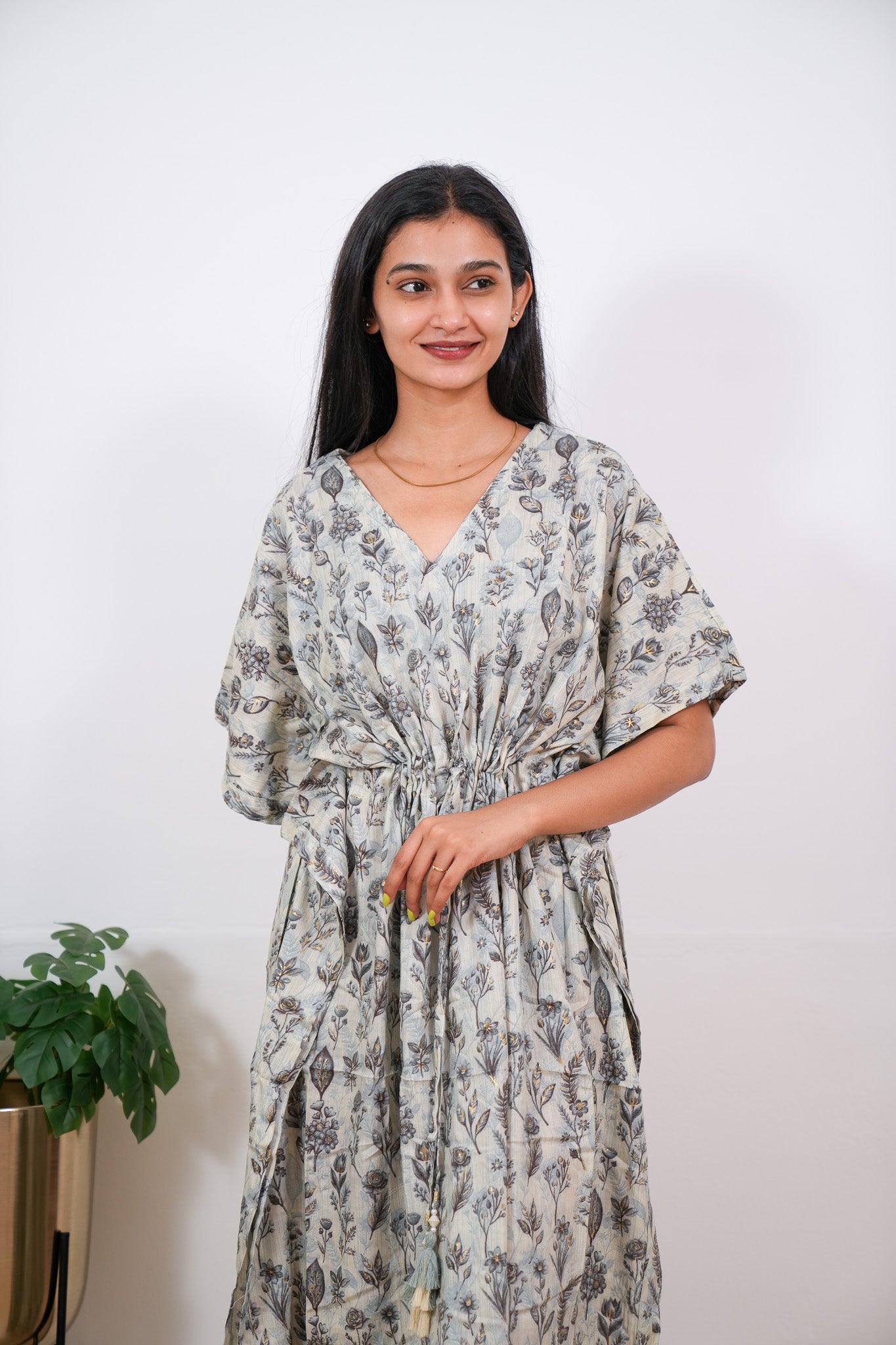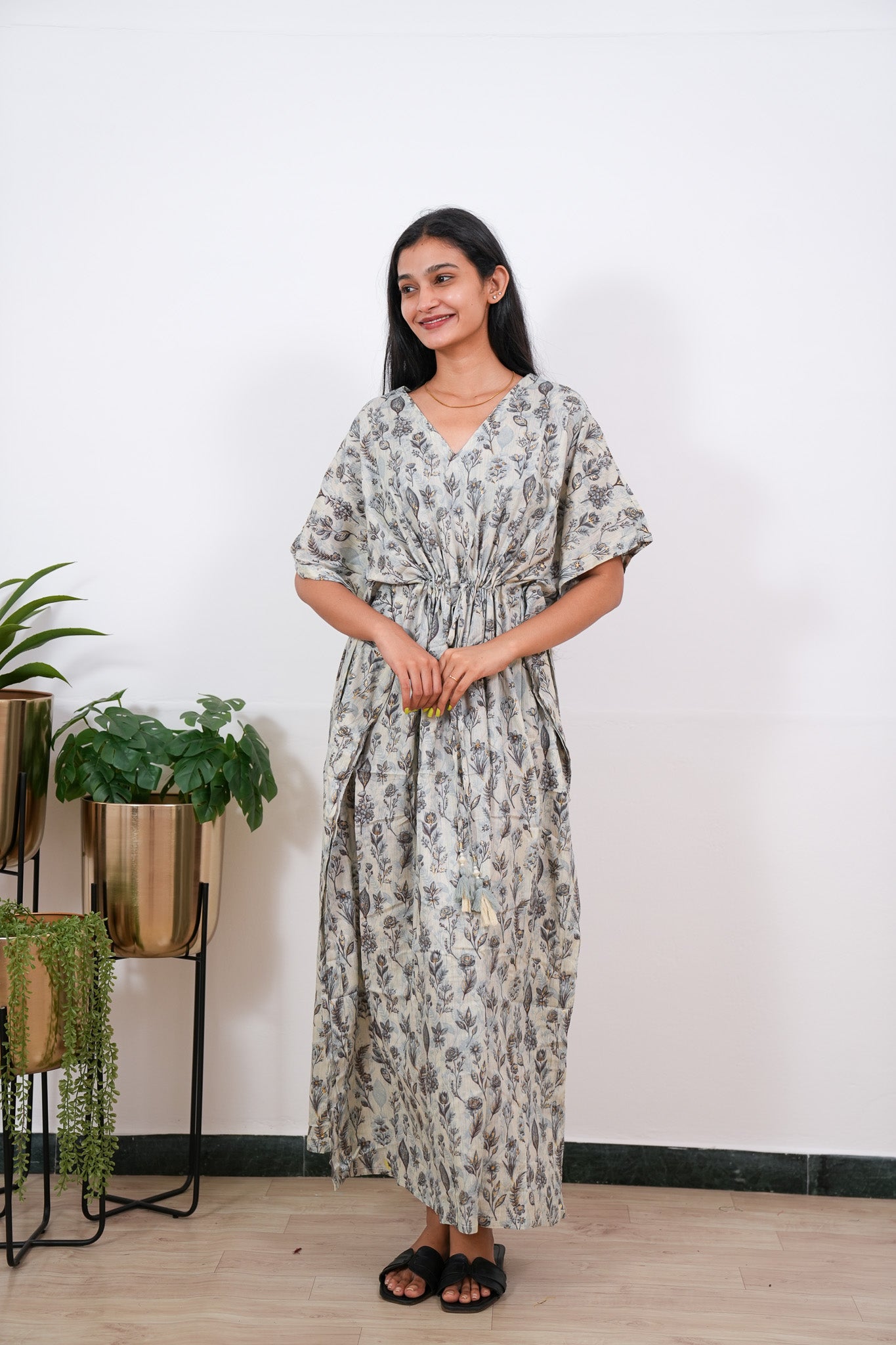 Easy breezy cotton kaftan made for you to feel absolute comfort, elegance and a total stunner at the same time. It comes V neck and tie in the centre with flowy silhouette and floral prints all over.