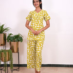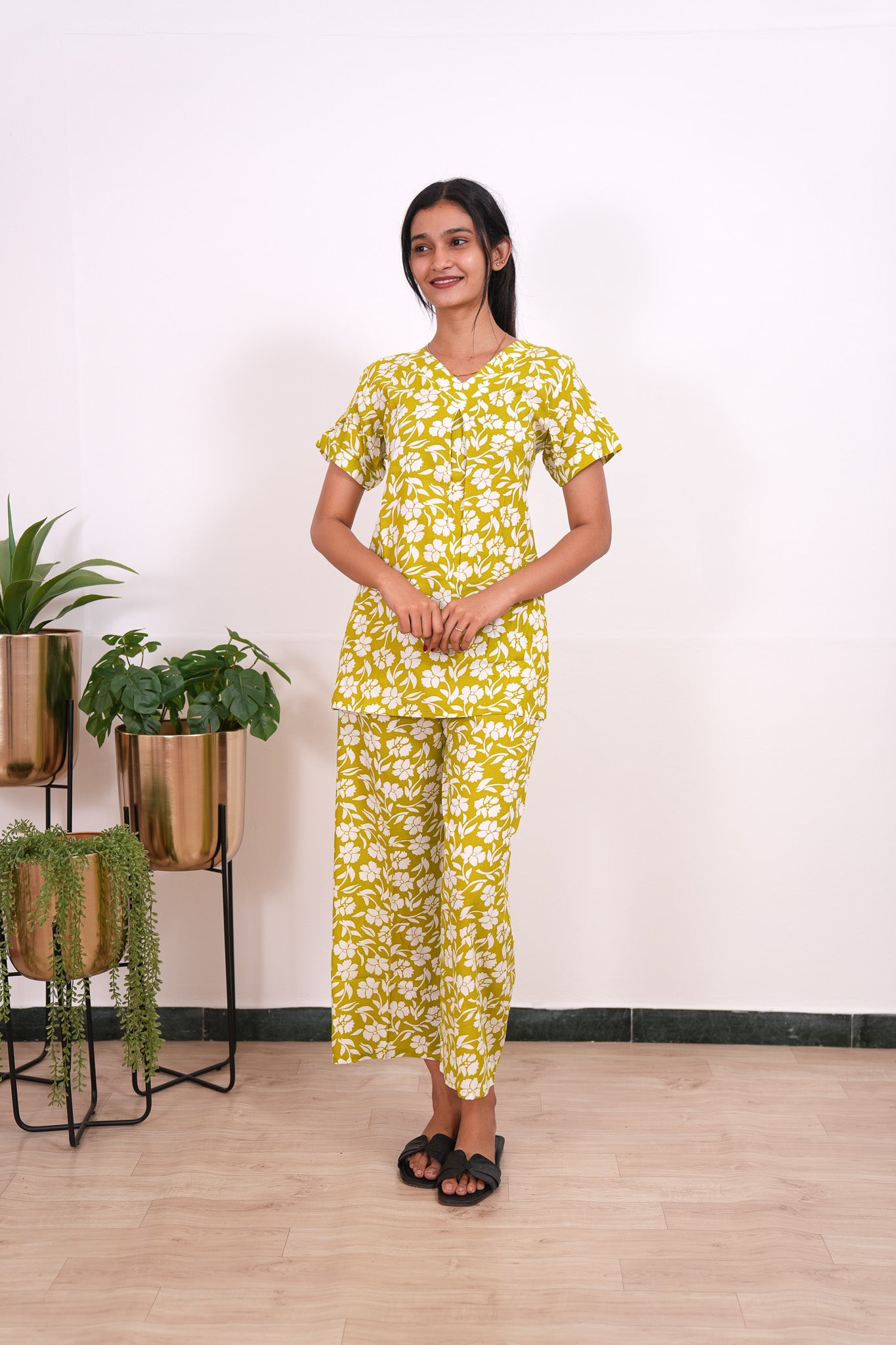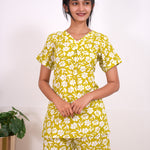 These Co-ords are so cozy, comfortable and chic making it perfect to relax at home or sleep in them. The top has a V neck with short length sleeves. Pant comes with elastic and it has a straight fit.