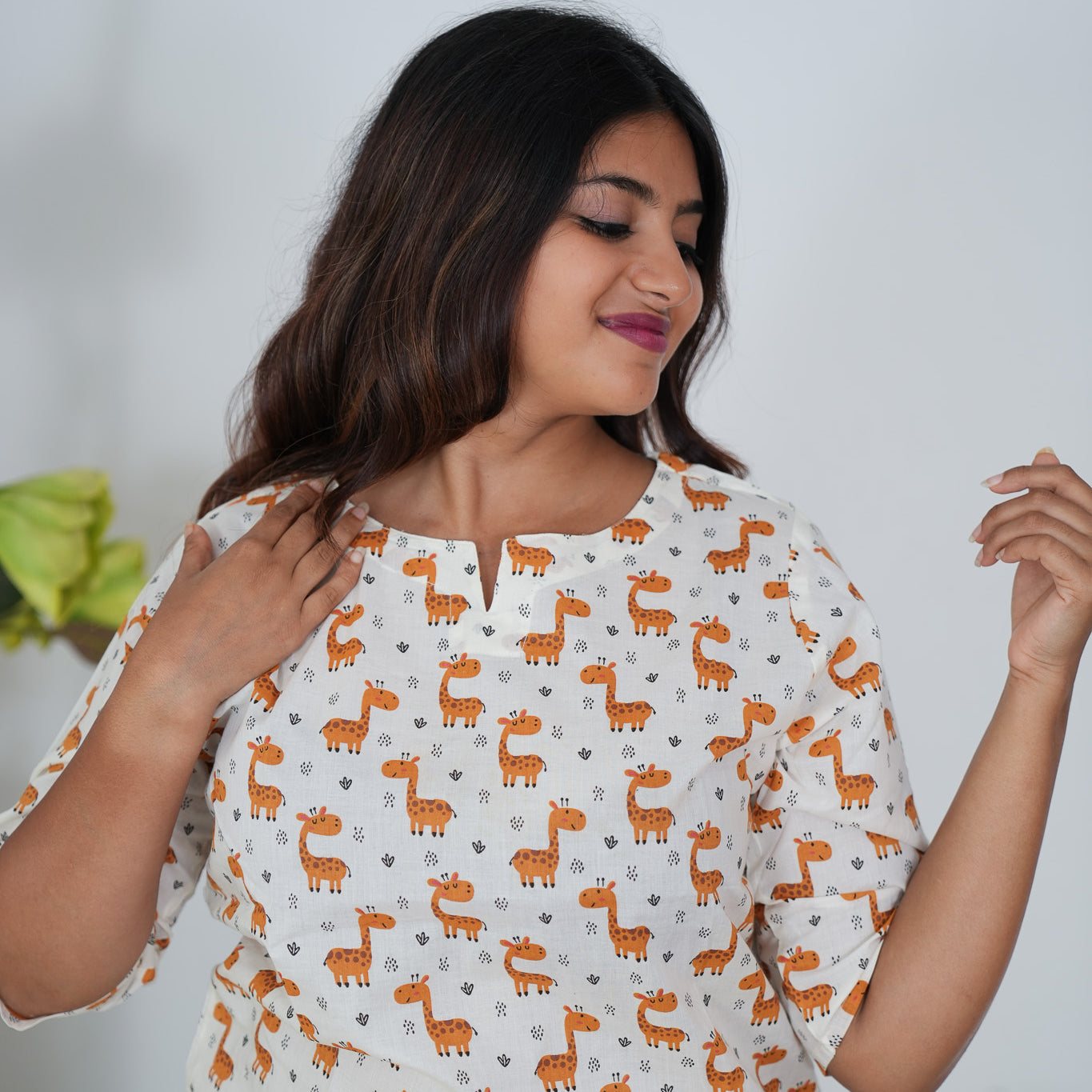 These Co-ords are so cozy, comfortable and chic making it perfect to relax at home or sleep in them. The top has a round neck with elbow length sleeves. Pant comes with elastic and has pockets.