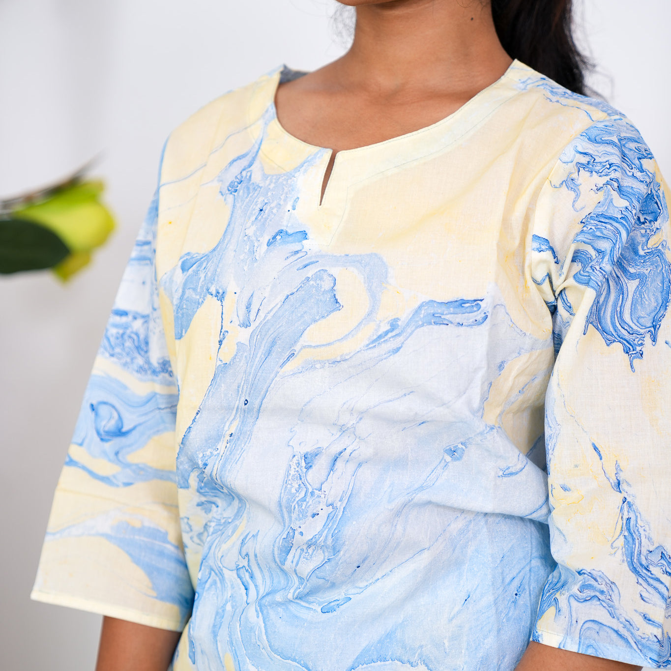 These Co-ords are so cozy, comfortable and chic making it perfect to relax at home or sleep in them. The top has a round neck with elbow length sleeves. Pant comes with elastic and has pockets.