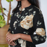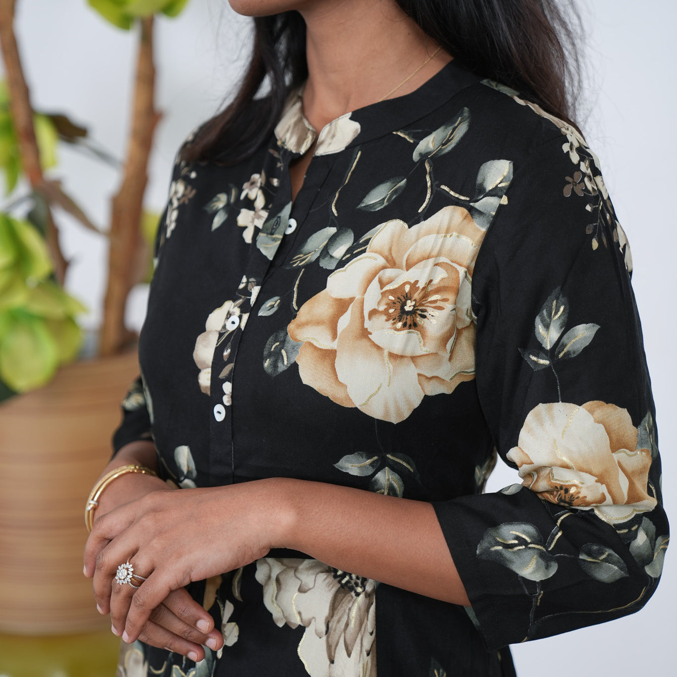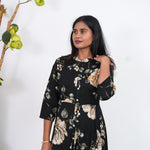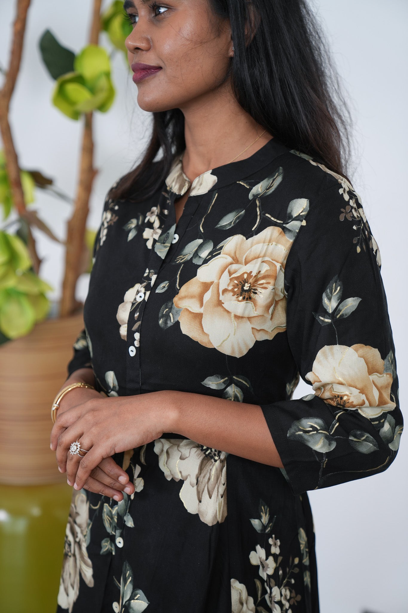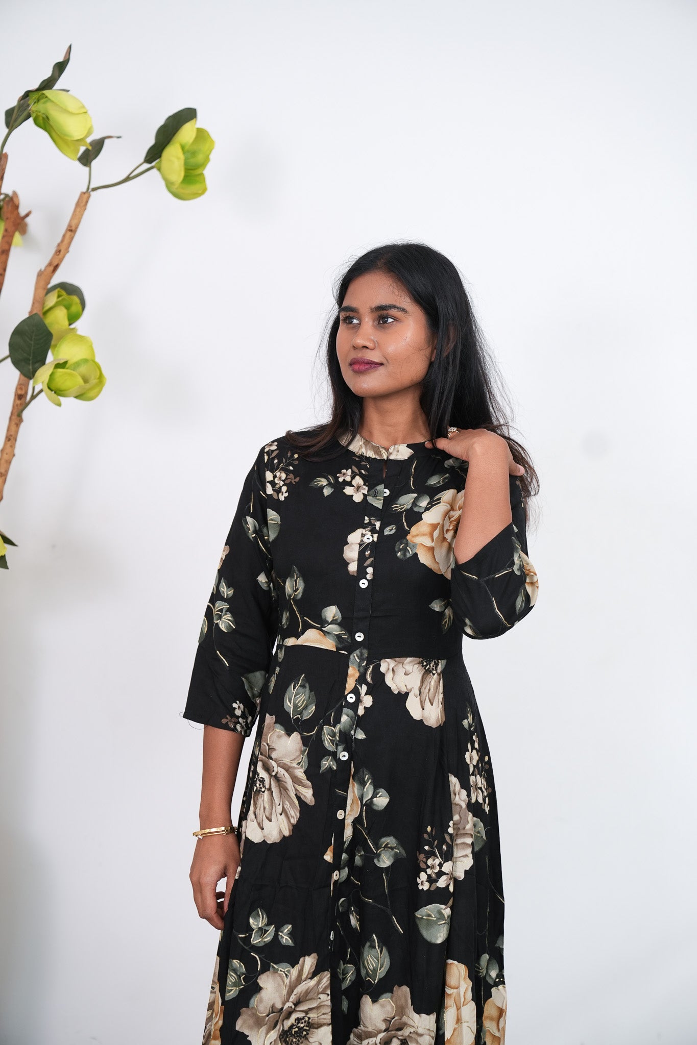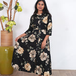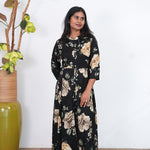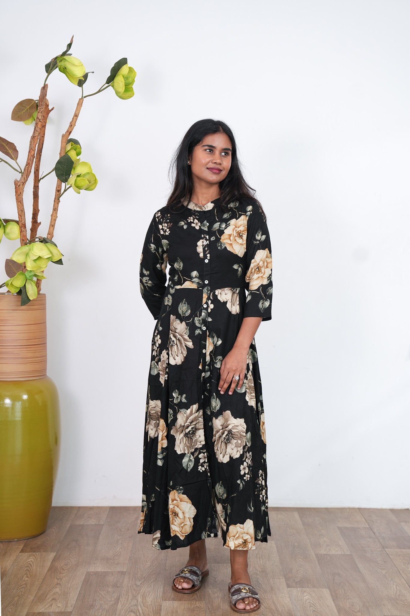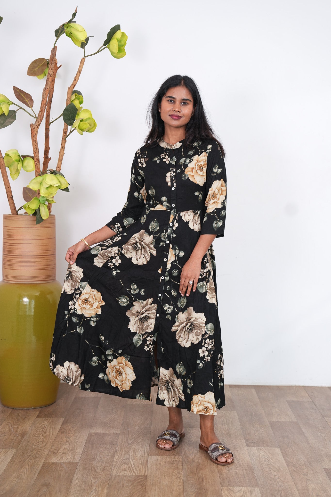 Pitch black mandarin cotton A-line long gown that exudes elegance and sophistication. It has buttons running down which cannot be opened.