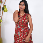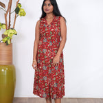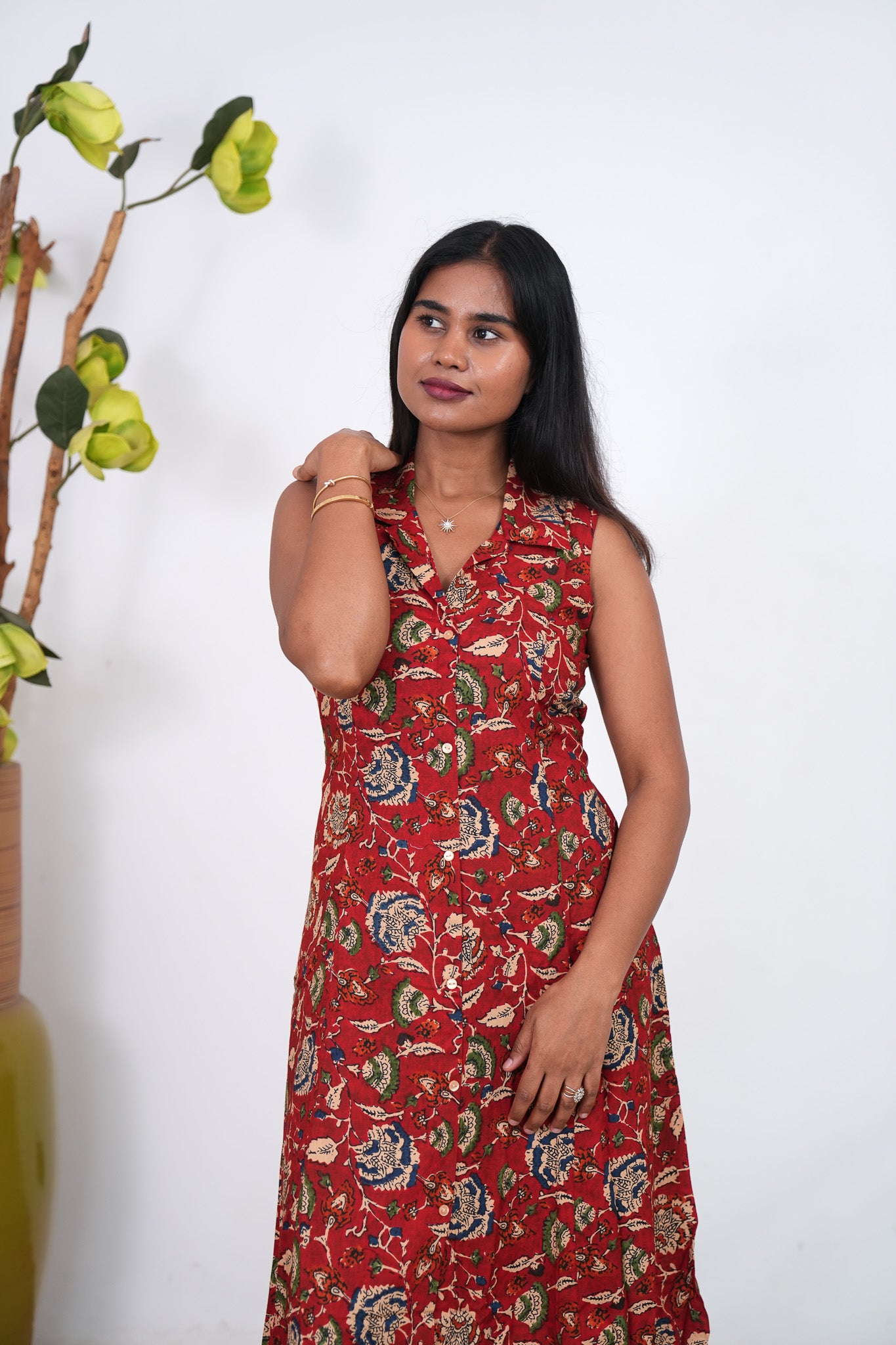 Crimson floral cotton shirt dress that exudes elegance and sophistication. It has buttons running down.