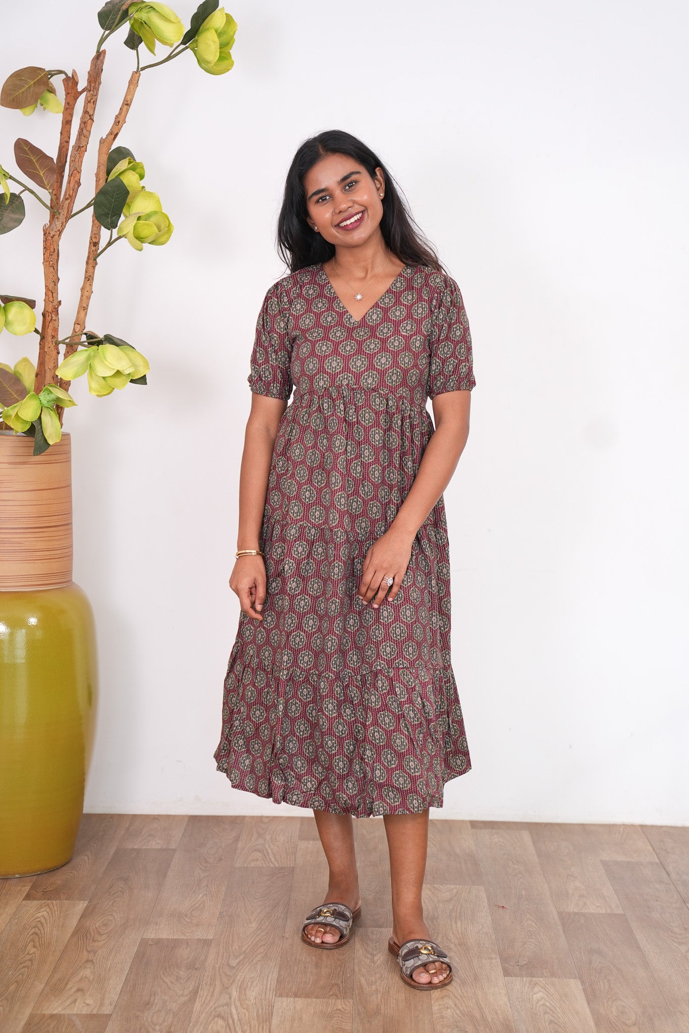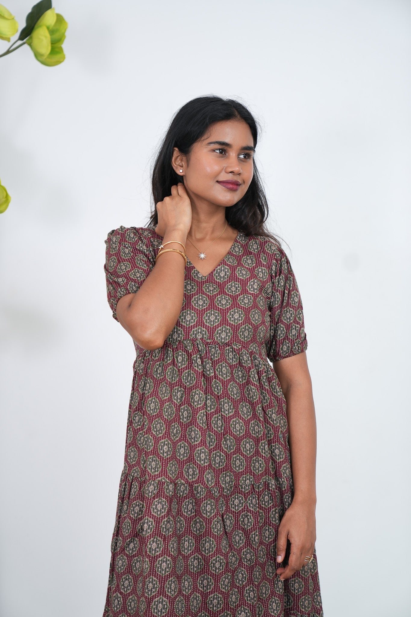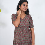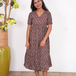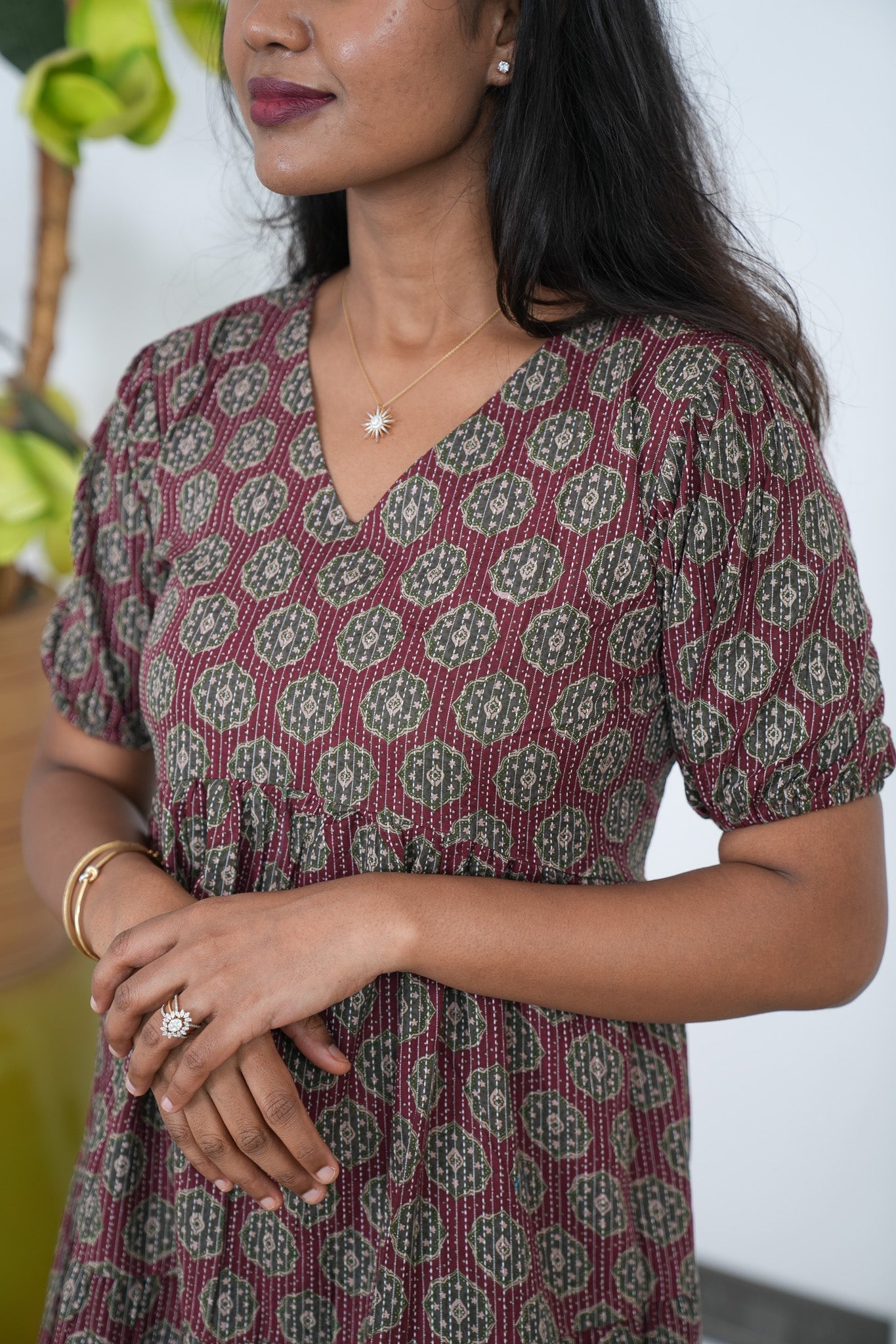 Plum katha cotton dress with V neck and balloon sleeves. It has floral print all over the dress.