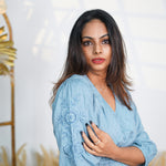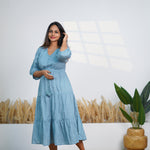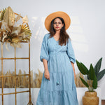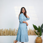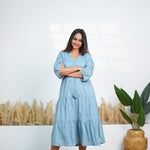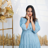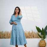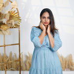 Powder blue midi dress with a buttons and tie in the centre to cinch waist. It has a self embroidery pattern in the hands and has self dobby pattern all over the dress.