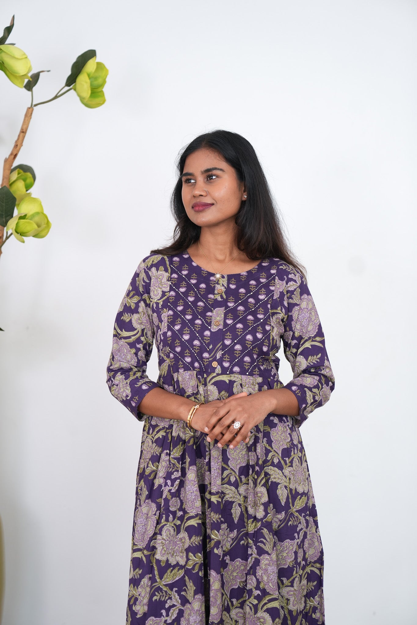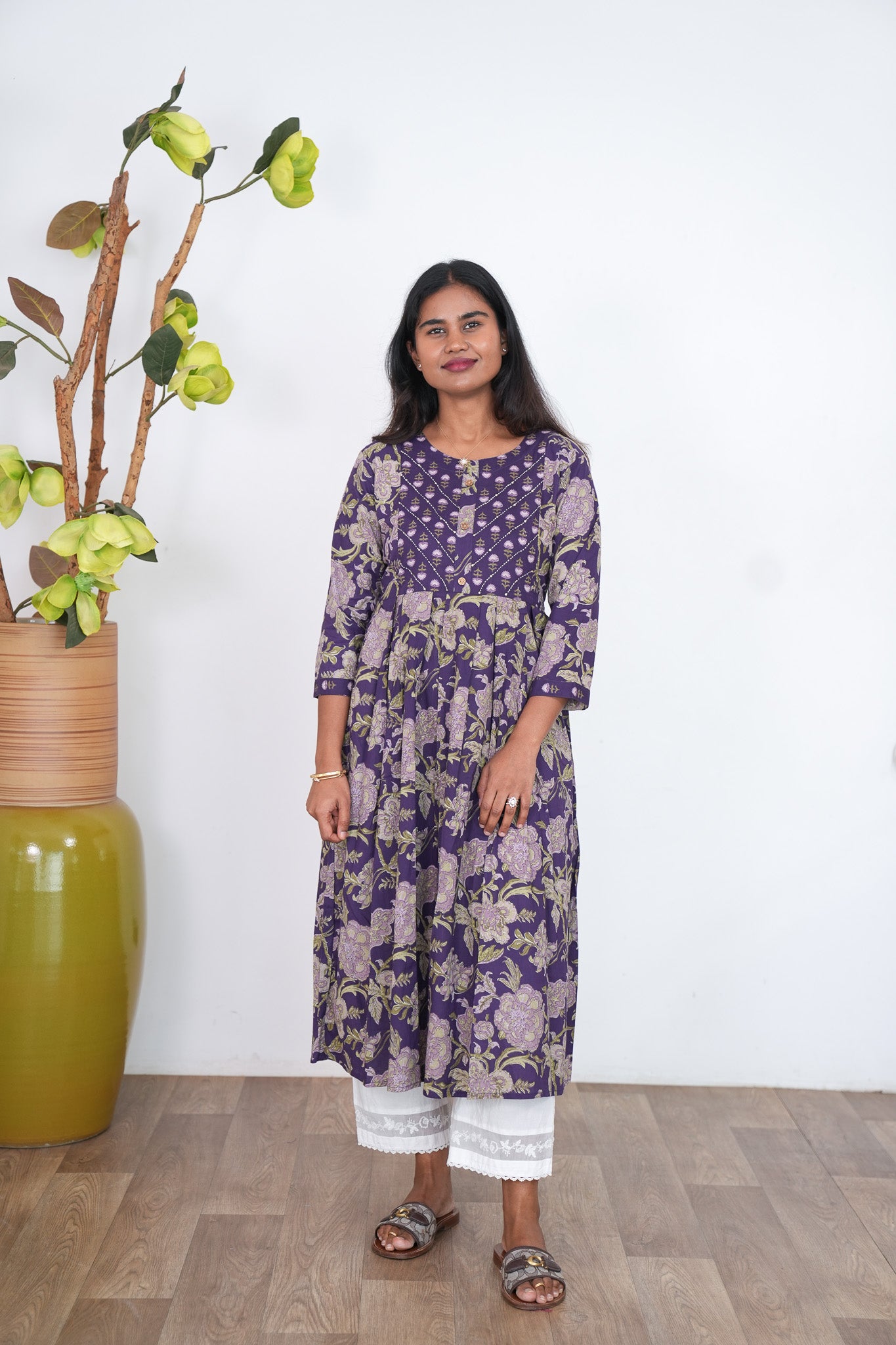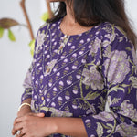 Purple anarkali kurti with round neck and with floral prints all over the dress. They can be paired with cotton pants to complete the look.