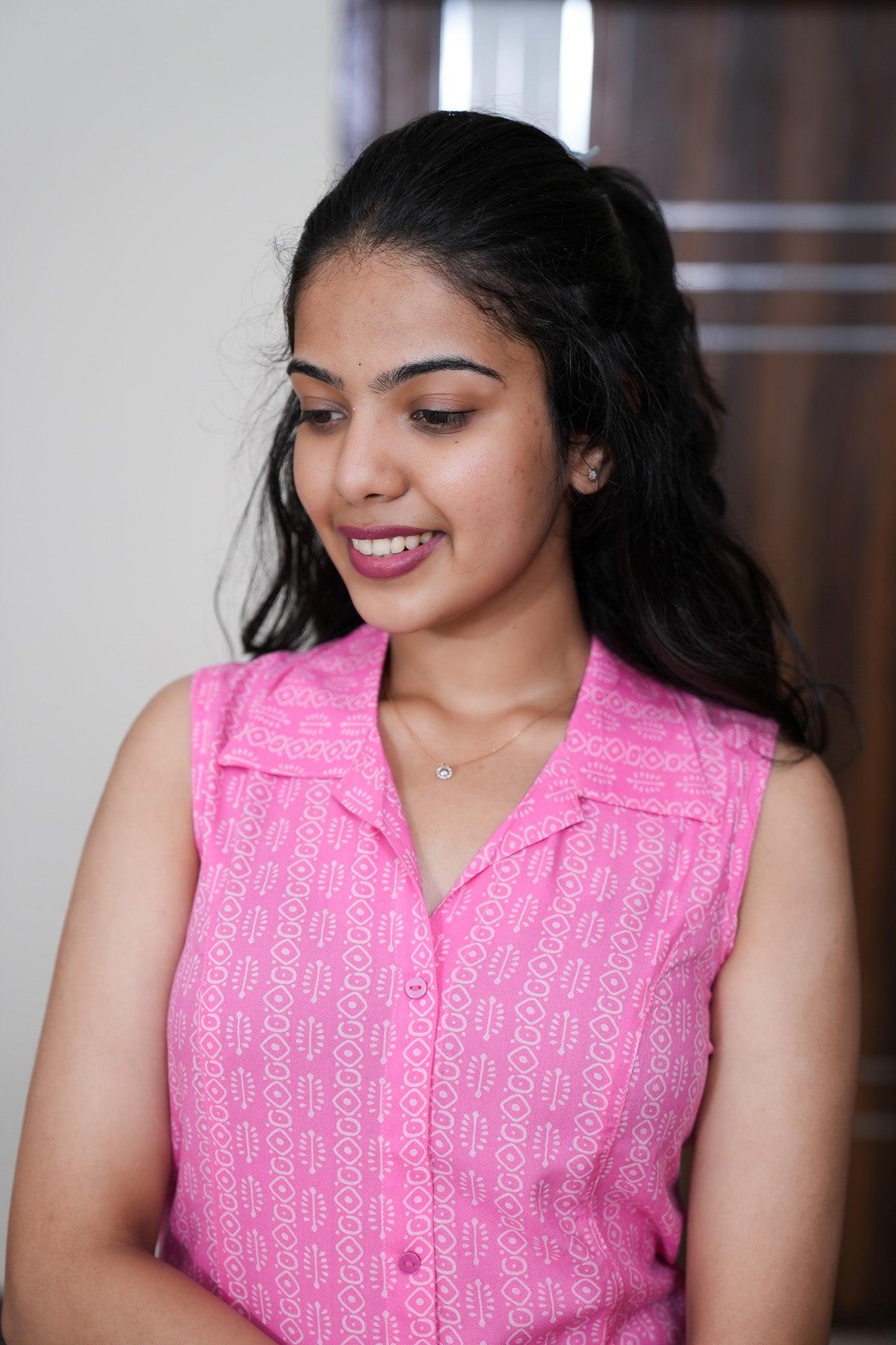 Pink cotton shirt dress that exudes elegance and sophistication. It has buttons running down.