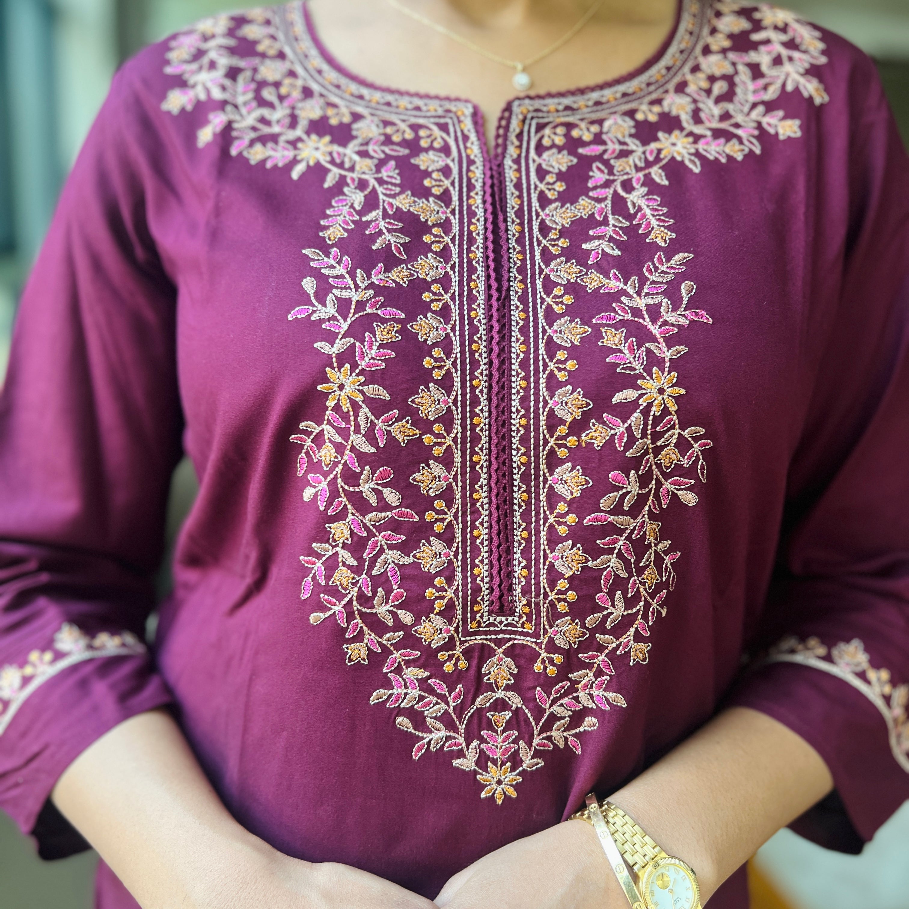 Purple hand embroidered top with elbow length sleeves. These tops are so versatile in nature . Pair them with denim or cotton pants to complete your everyday trendy look.