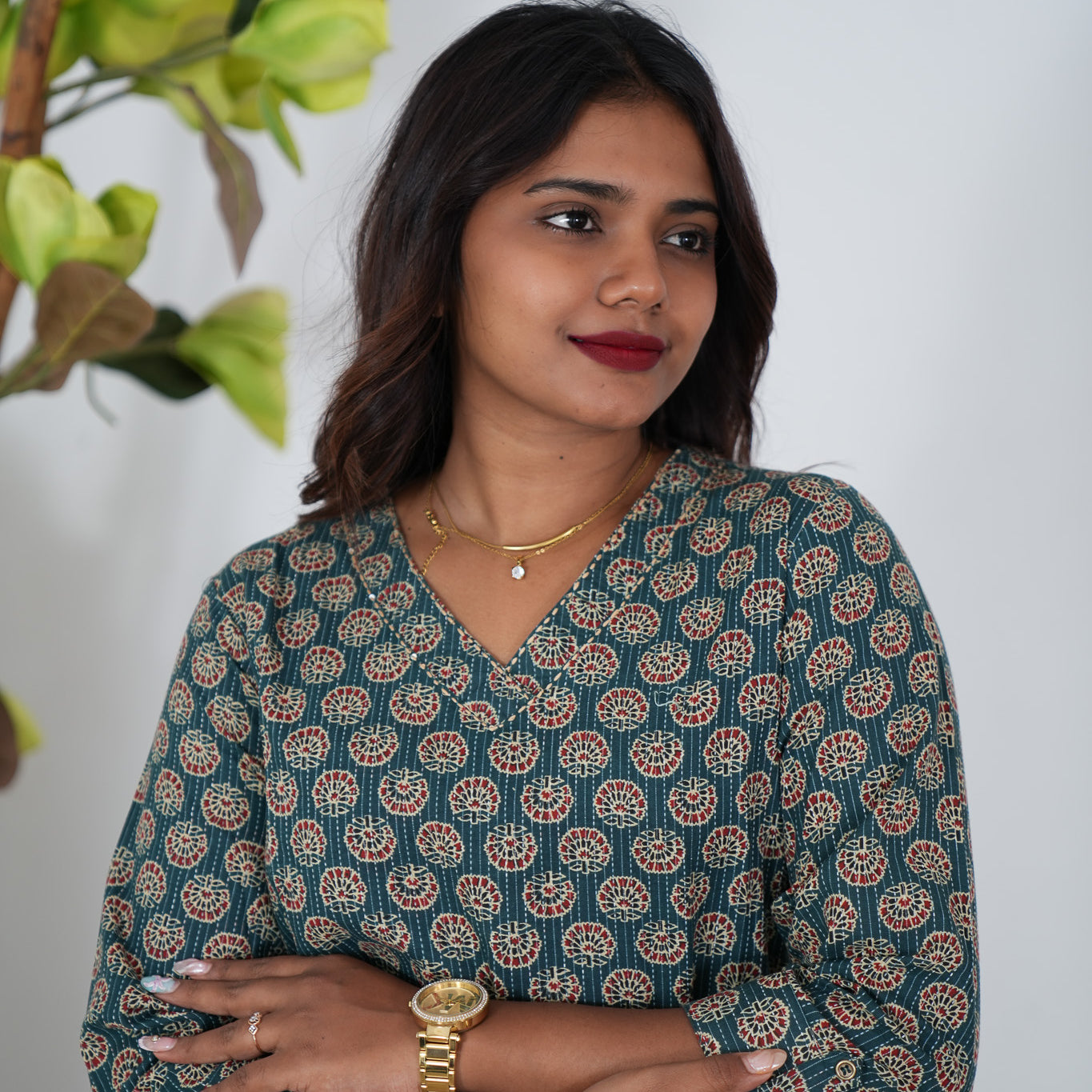 The kurti has a V neck and elbow length sleeves with floral print all over the kurta. It can be paired with cotton pants or jeans for a chic look.