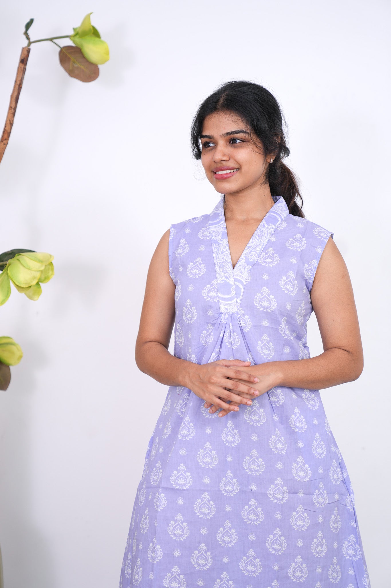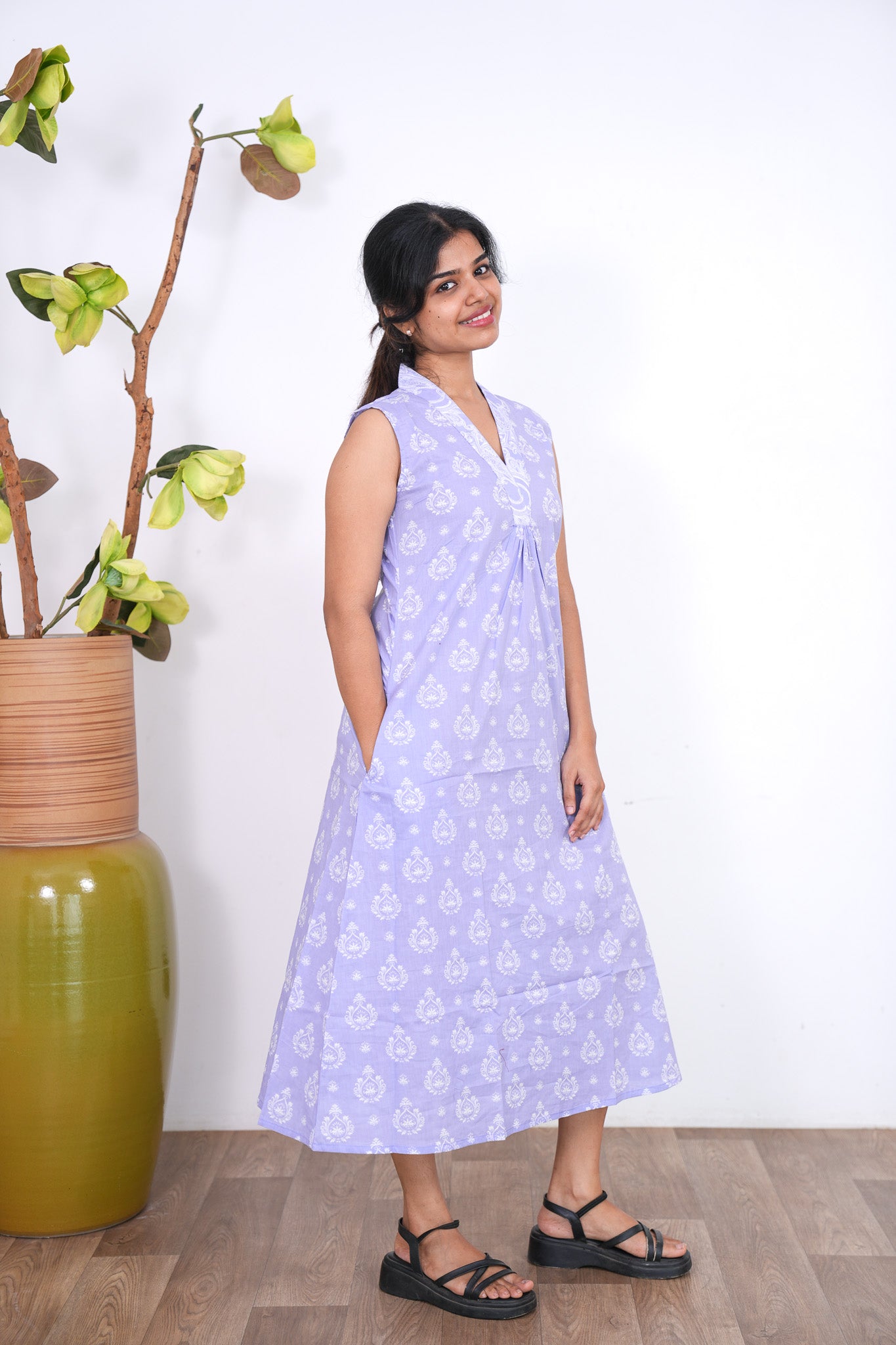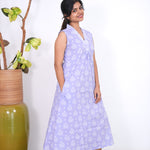 Ira cotton v neck gathered dress -Lavender(attached sleeves)