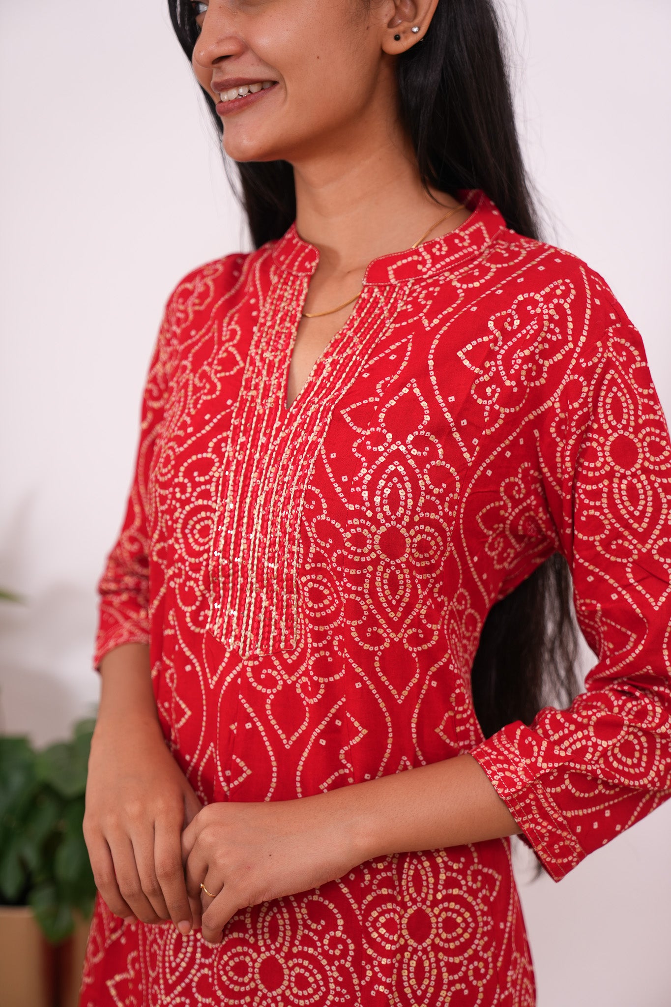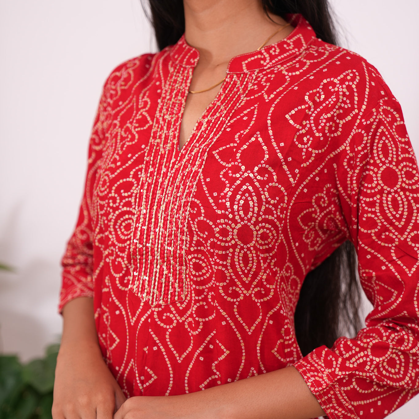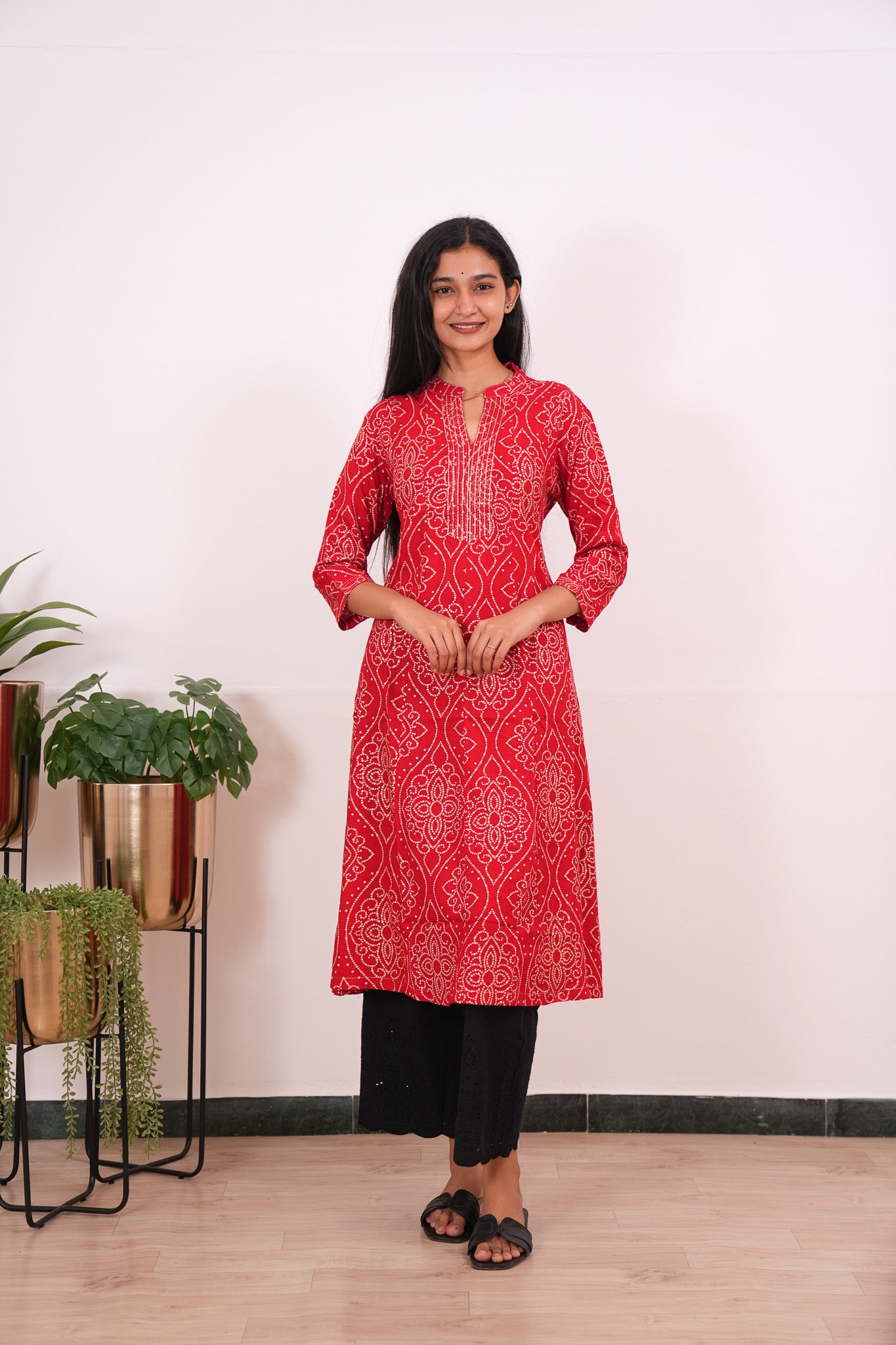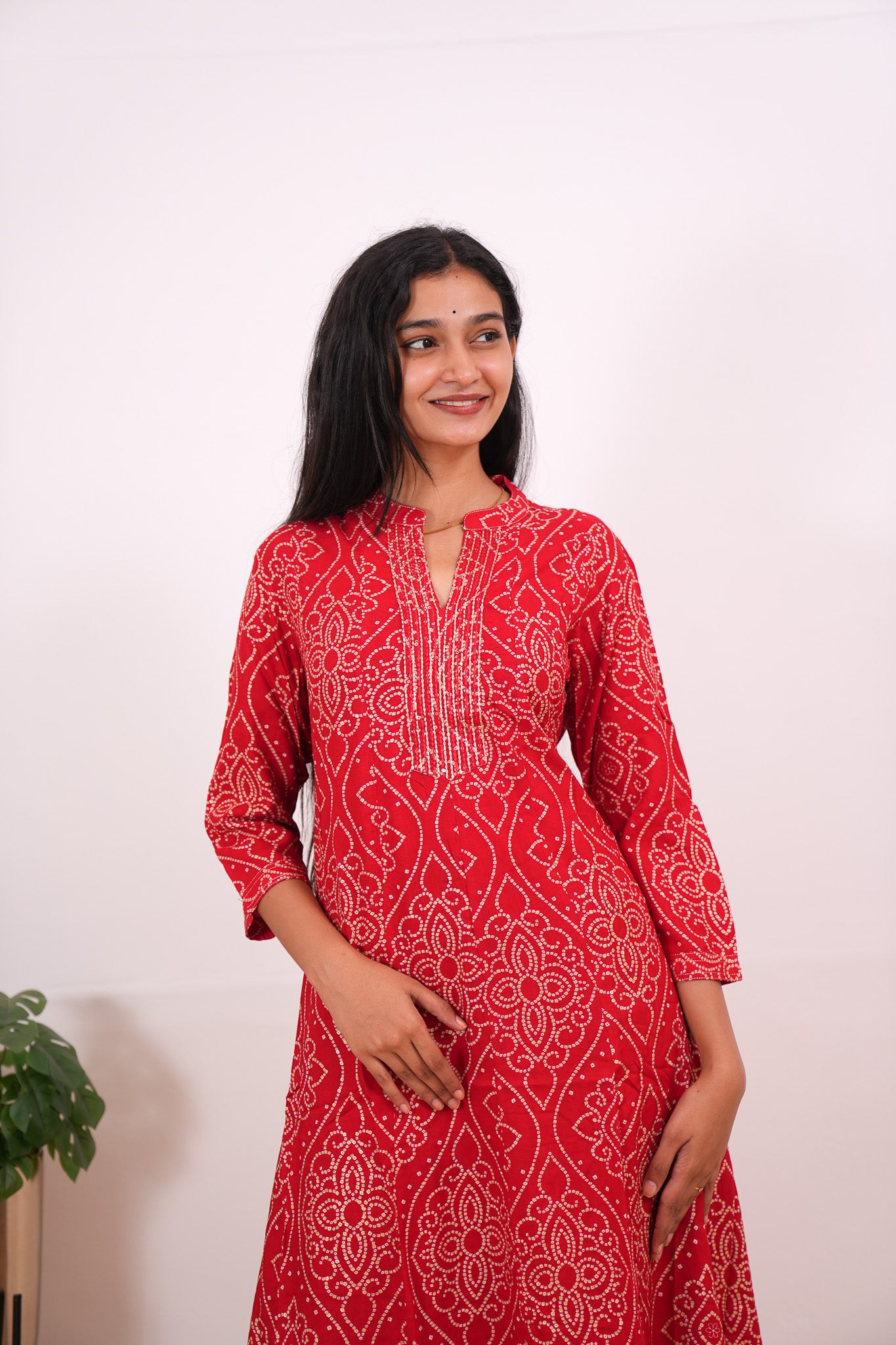Red bandhani mandarin anarkali kurti with mandarin collar and with floral prints all over the dress. They can be paired with cotton pants to complete the look.