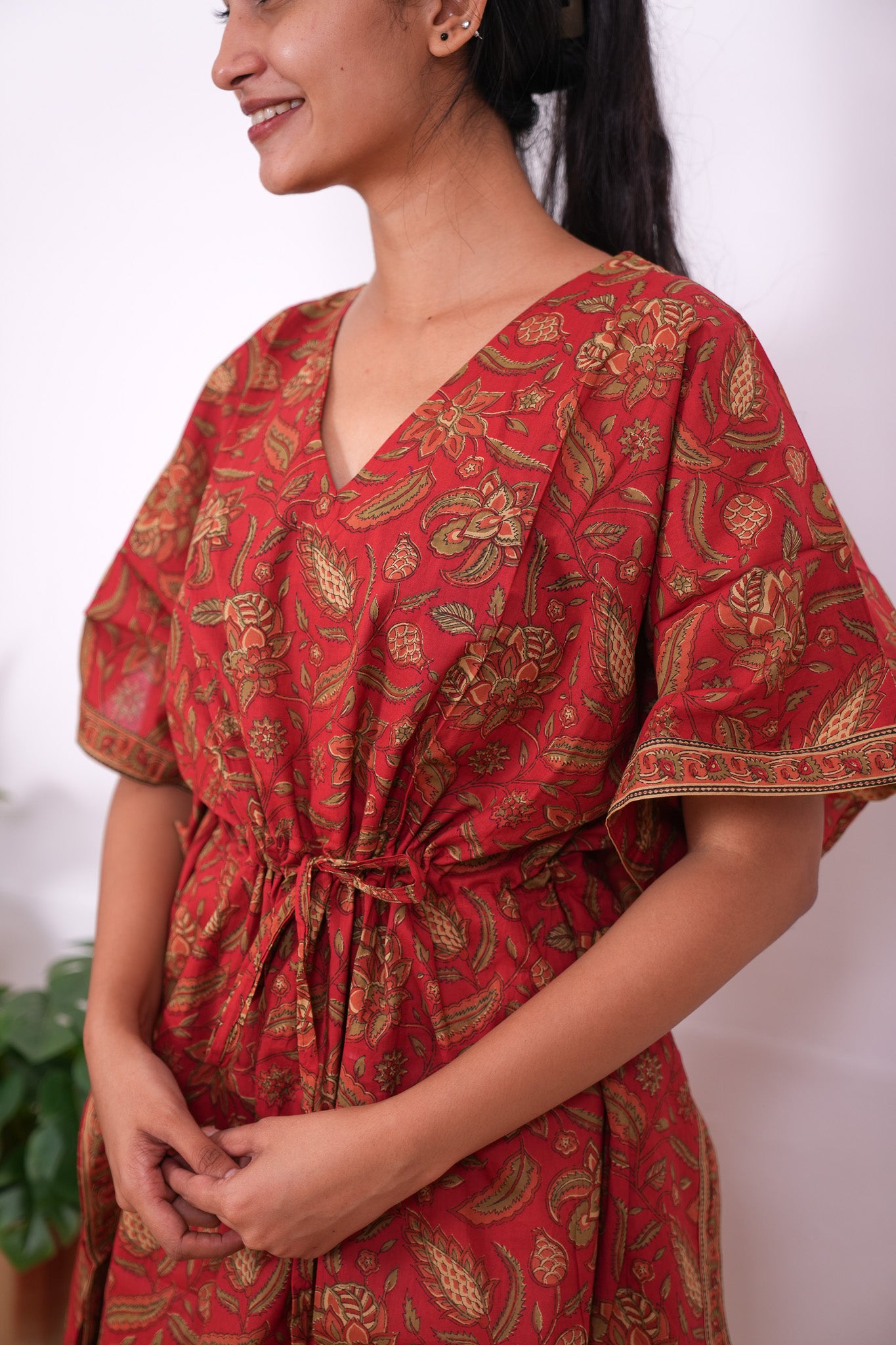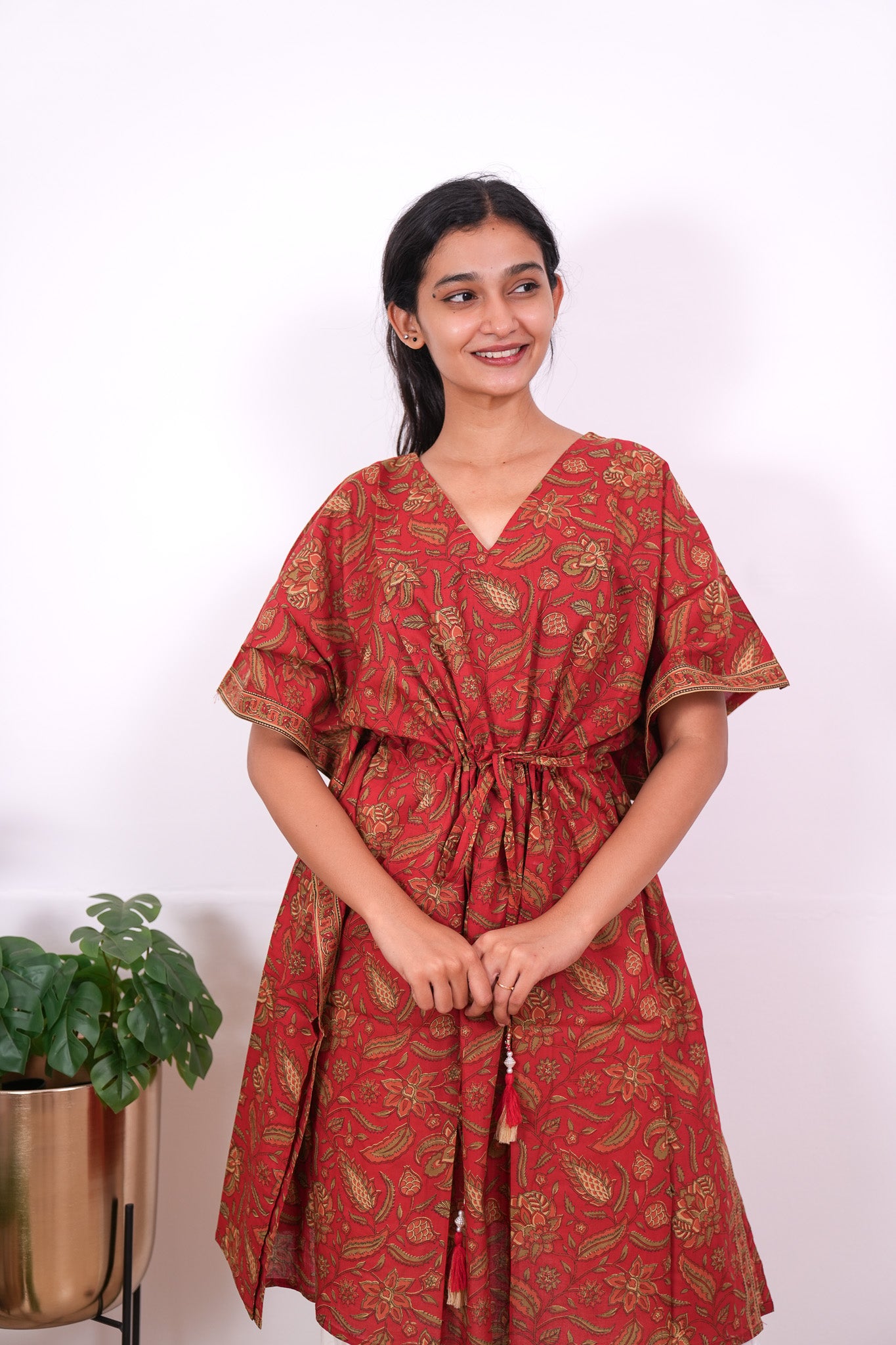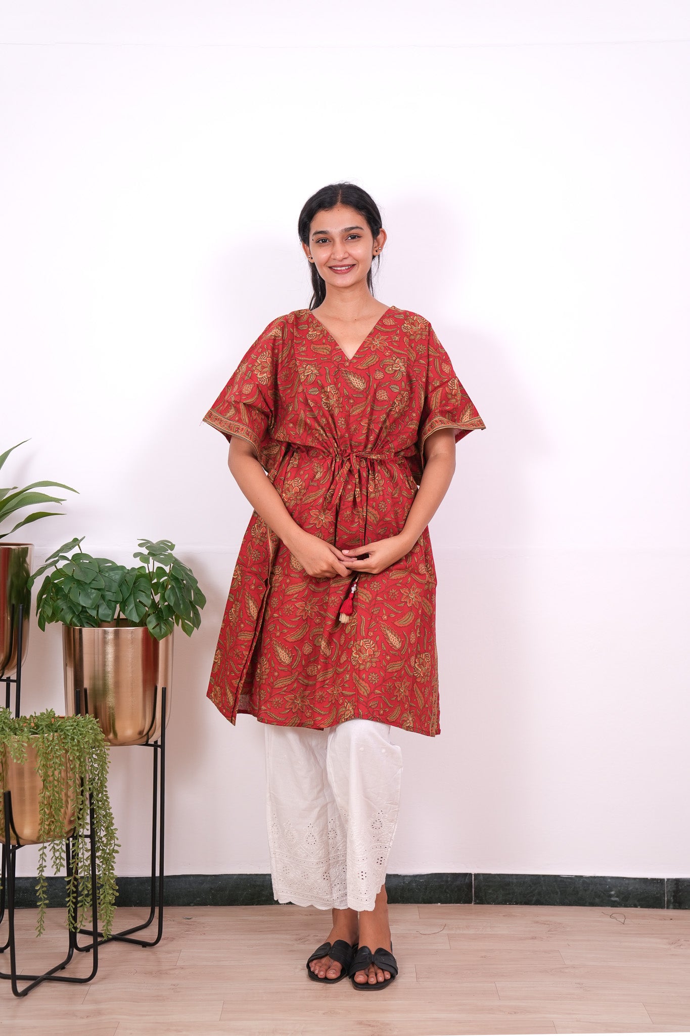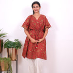 Easy breezy cotton kaftan made for you to feel absolute comfort, elegance and a total stunner at the same time. It comes V neck and tie in the centre with flowy silhouette and floral prints all over.