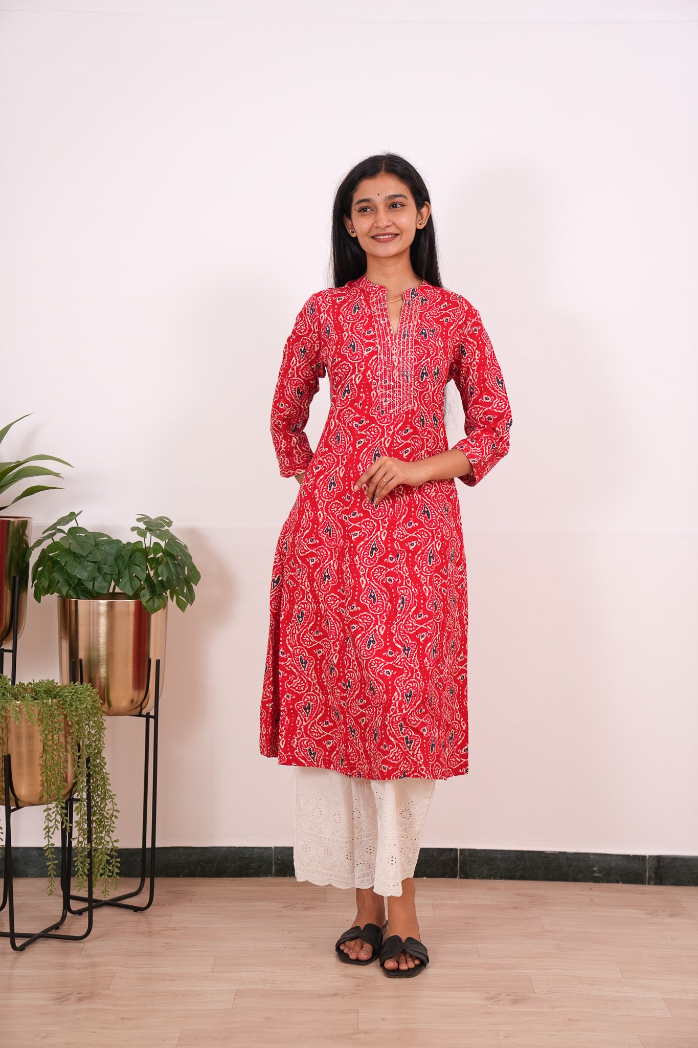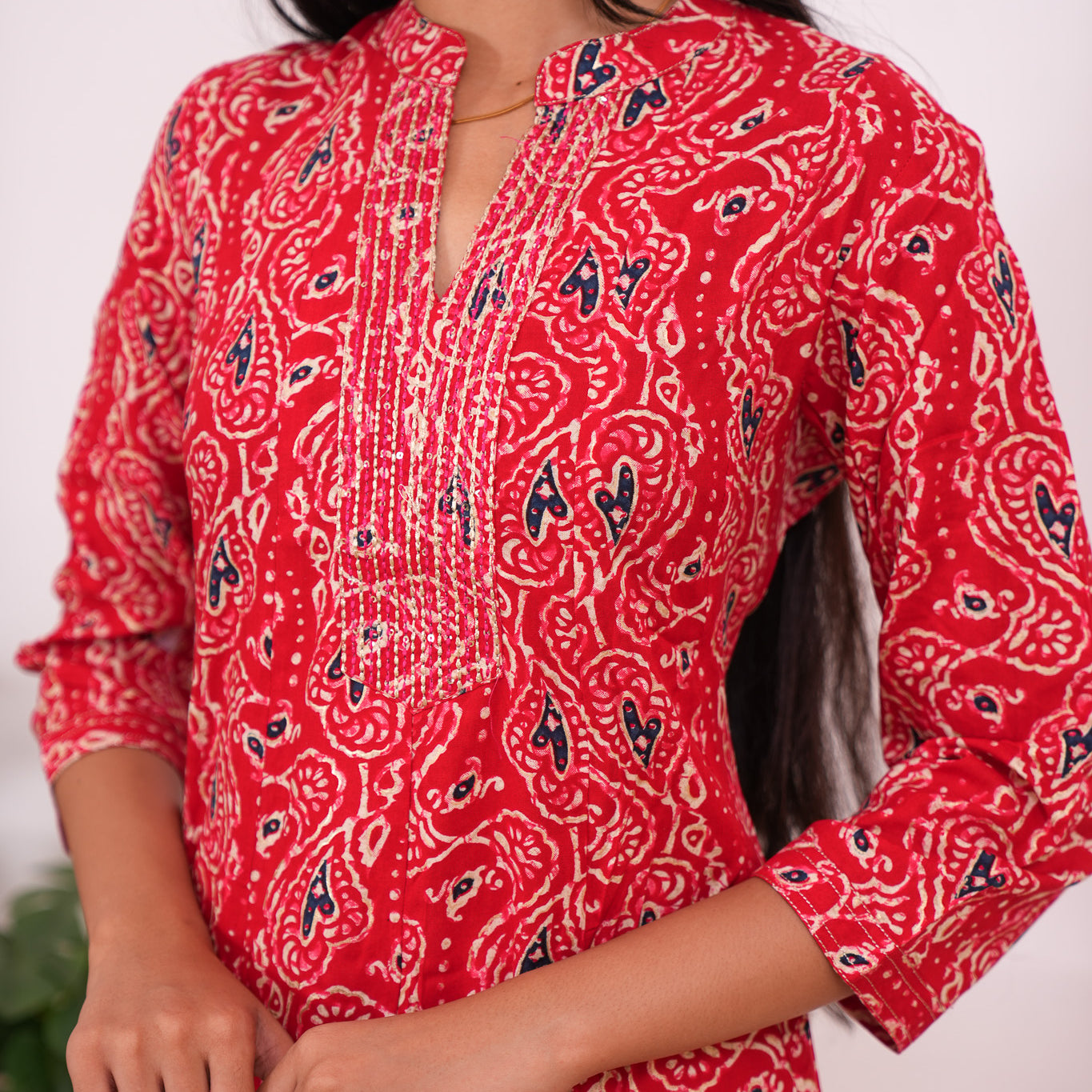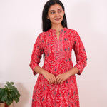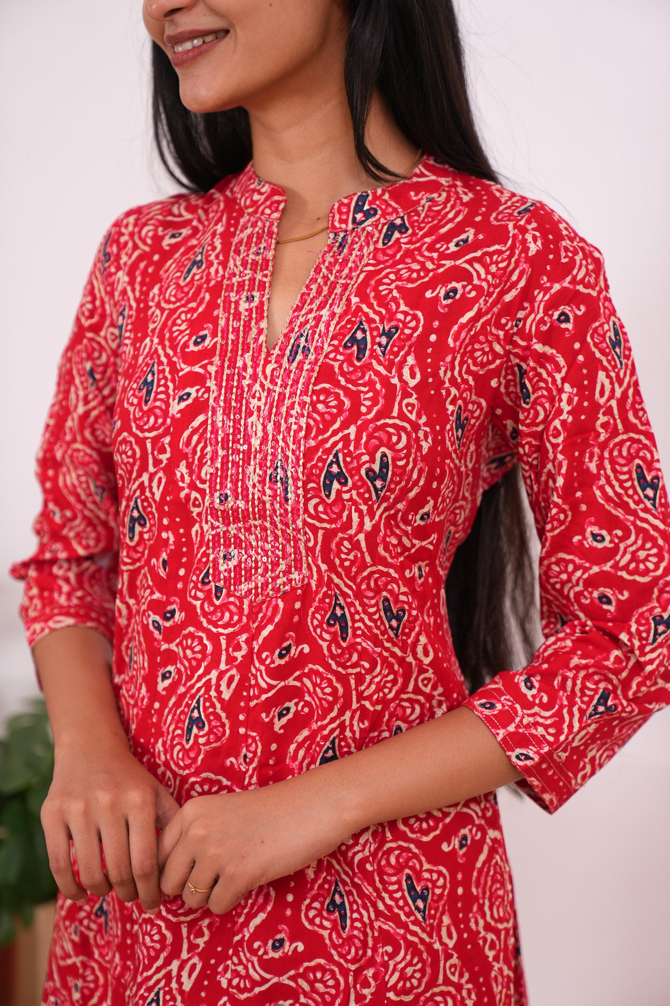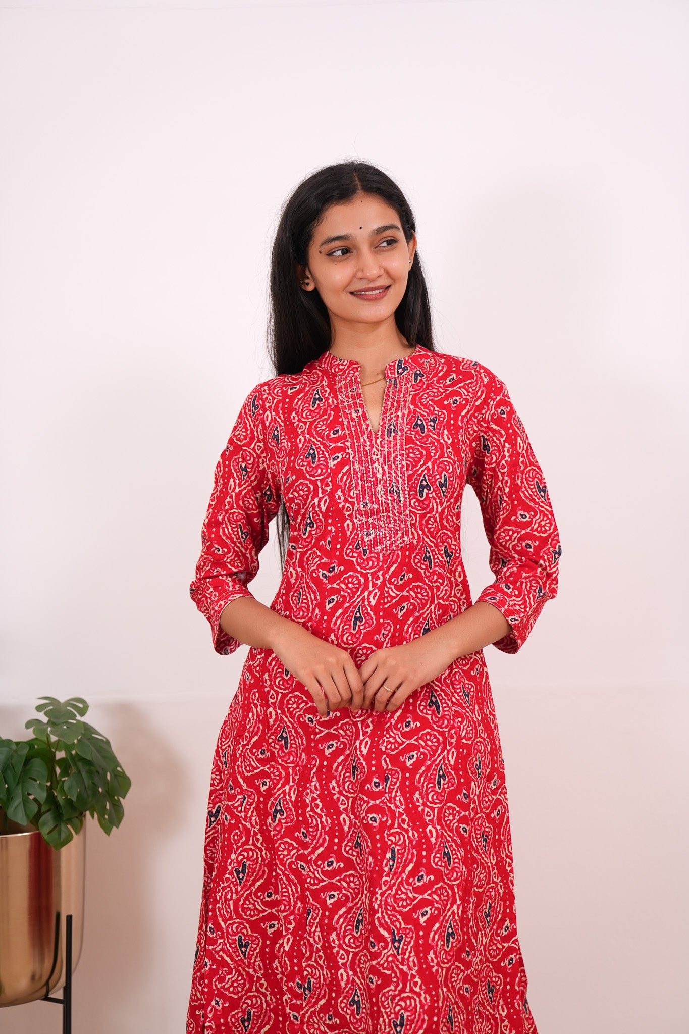 Red floral mandarin anarkali kurti with mandarin collar and with floral prints all over the dress. They can be paired with cotton pants to complete the look.