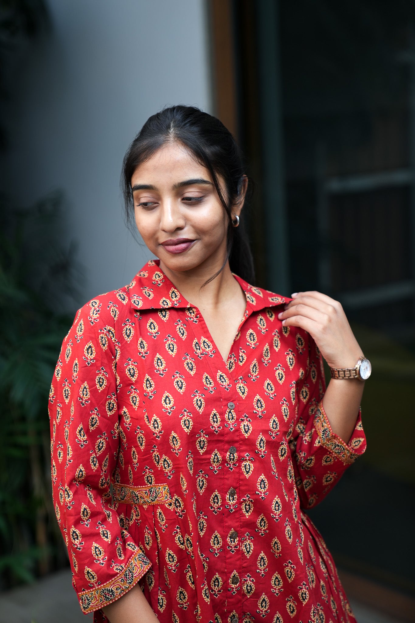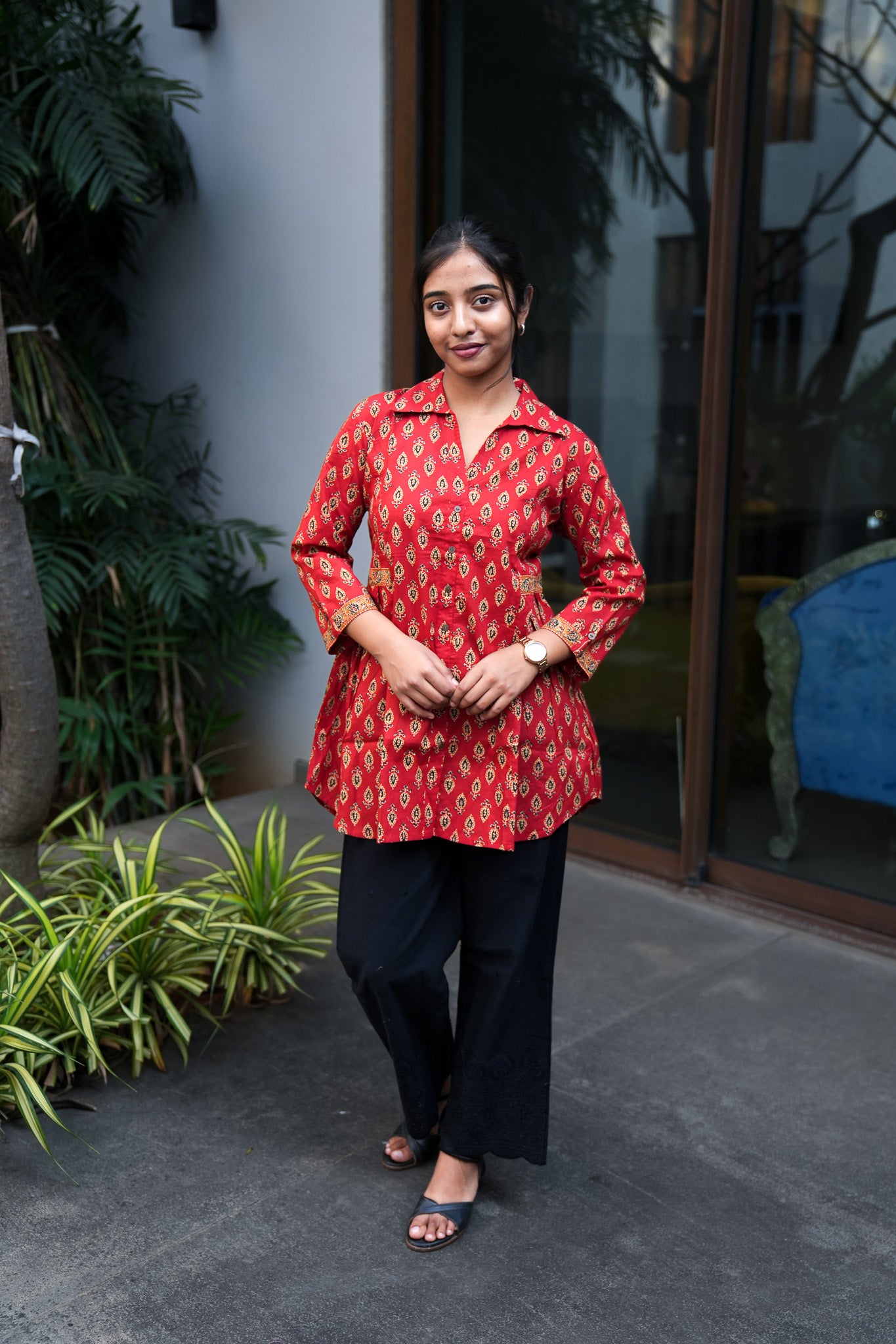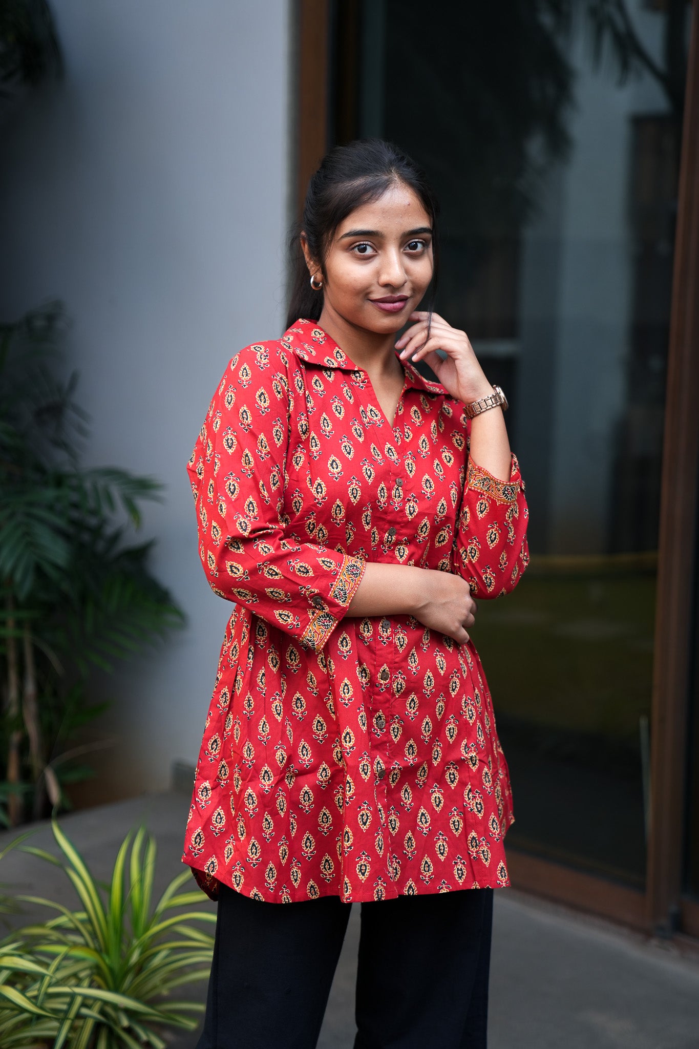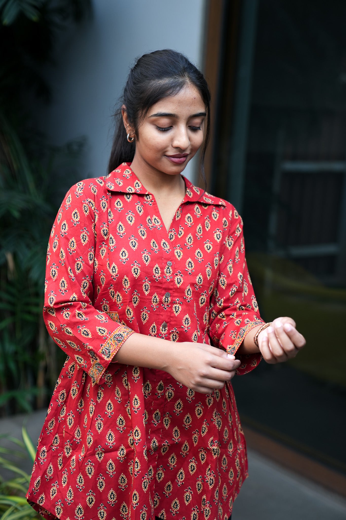 Red coloured peplum style cotton short kurti with collar and elbow length sleeves they are extremely breathable and light weight making it perfect for all day comfort.