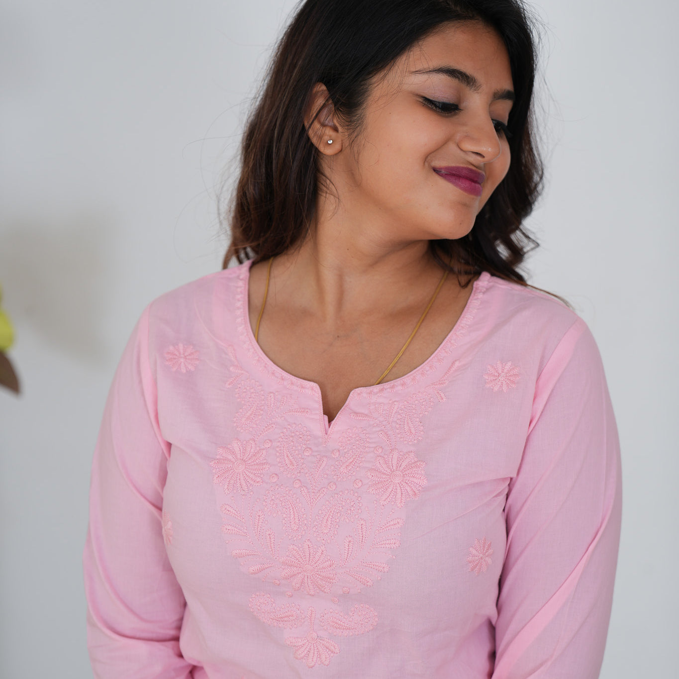 Pink coloured cotton short kurti with round neck and elbow length sleeves, they are extremely breathable and light weight making it perfect for all day comfort.