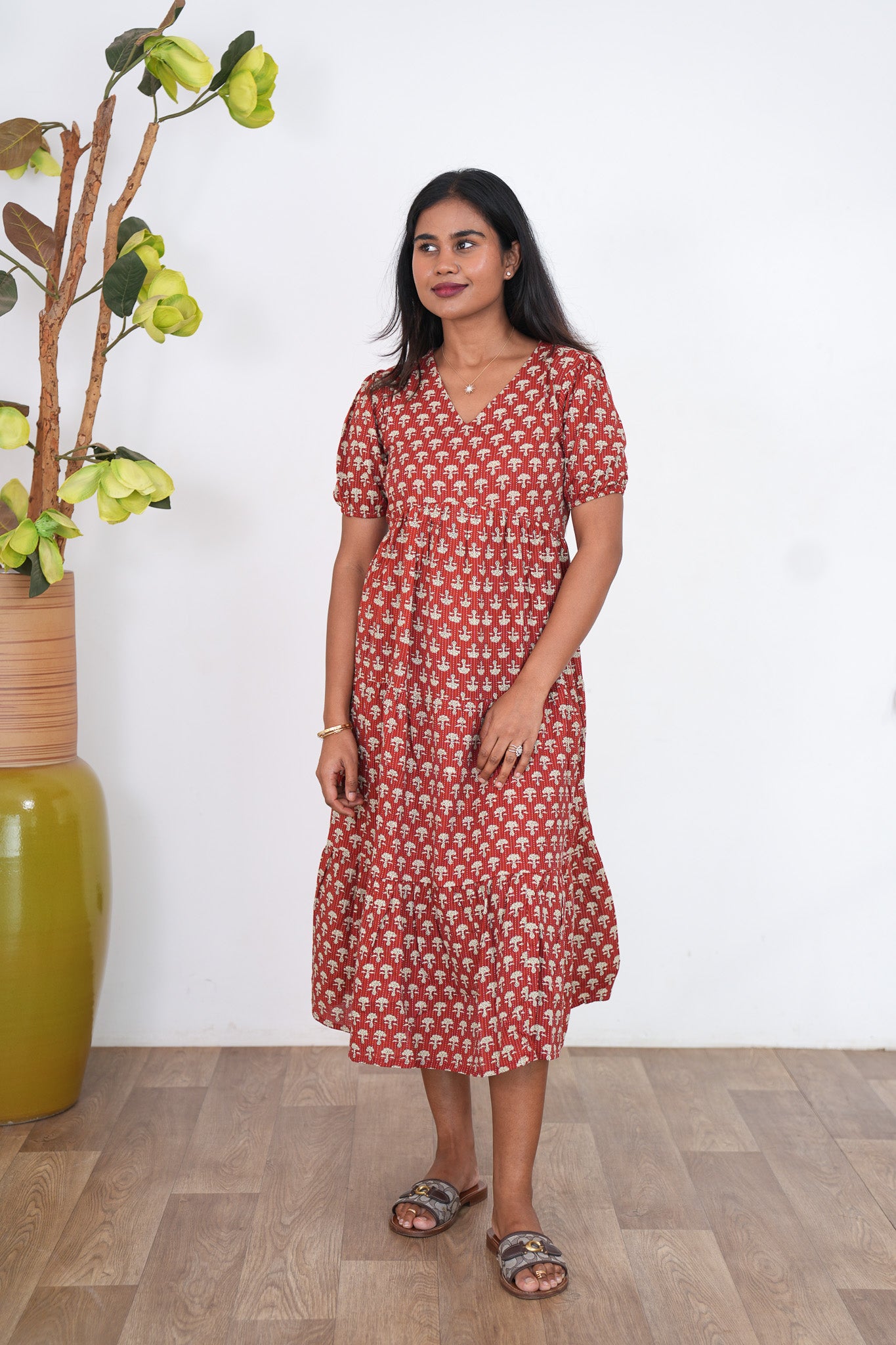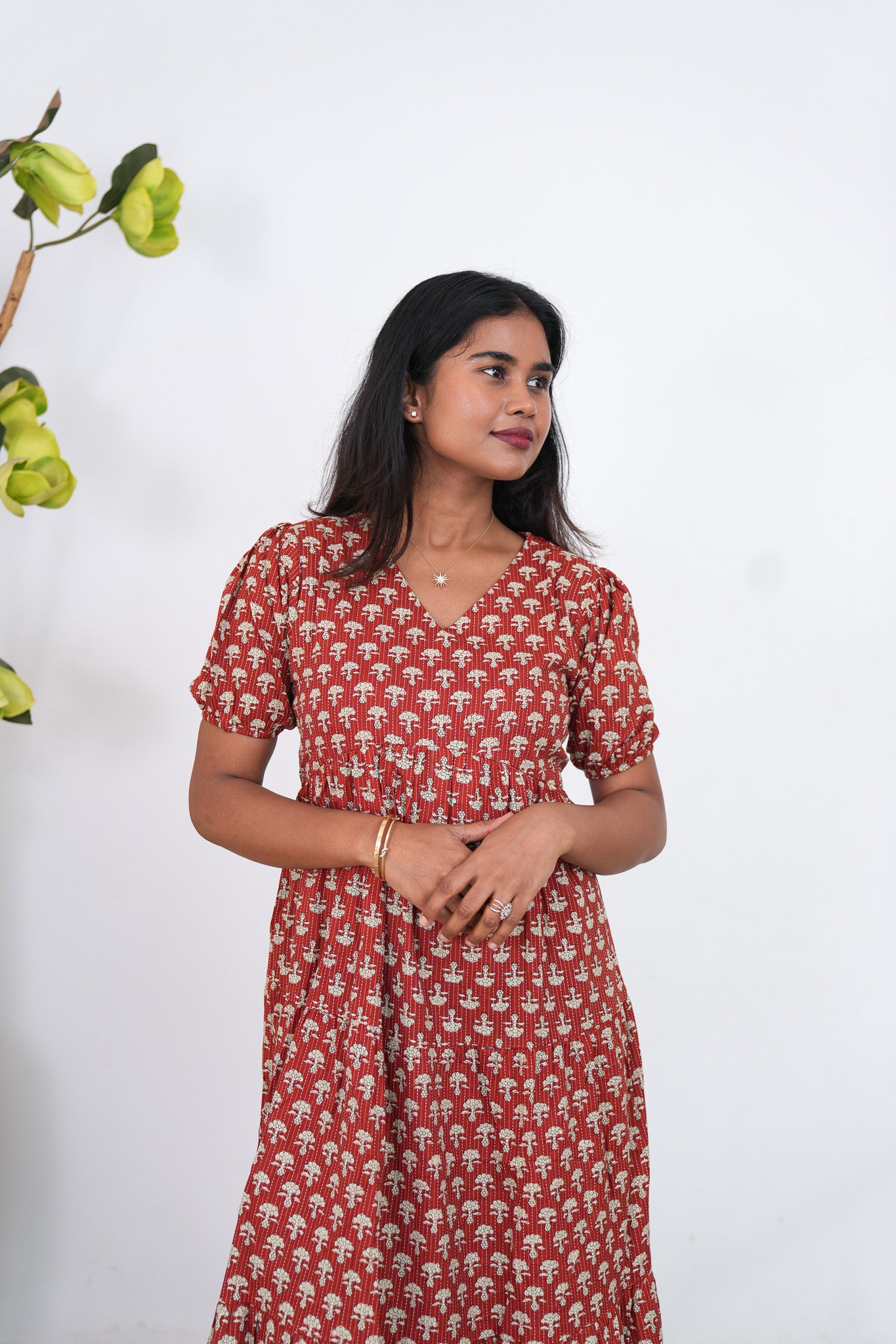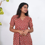 Red katha cotton dress with V neck and balloon sleeves. It has floral print all over the dress.