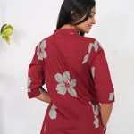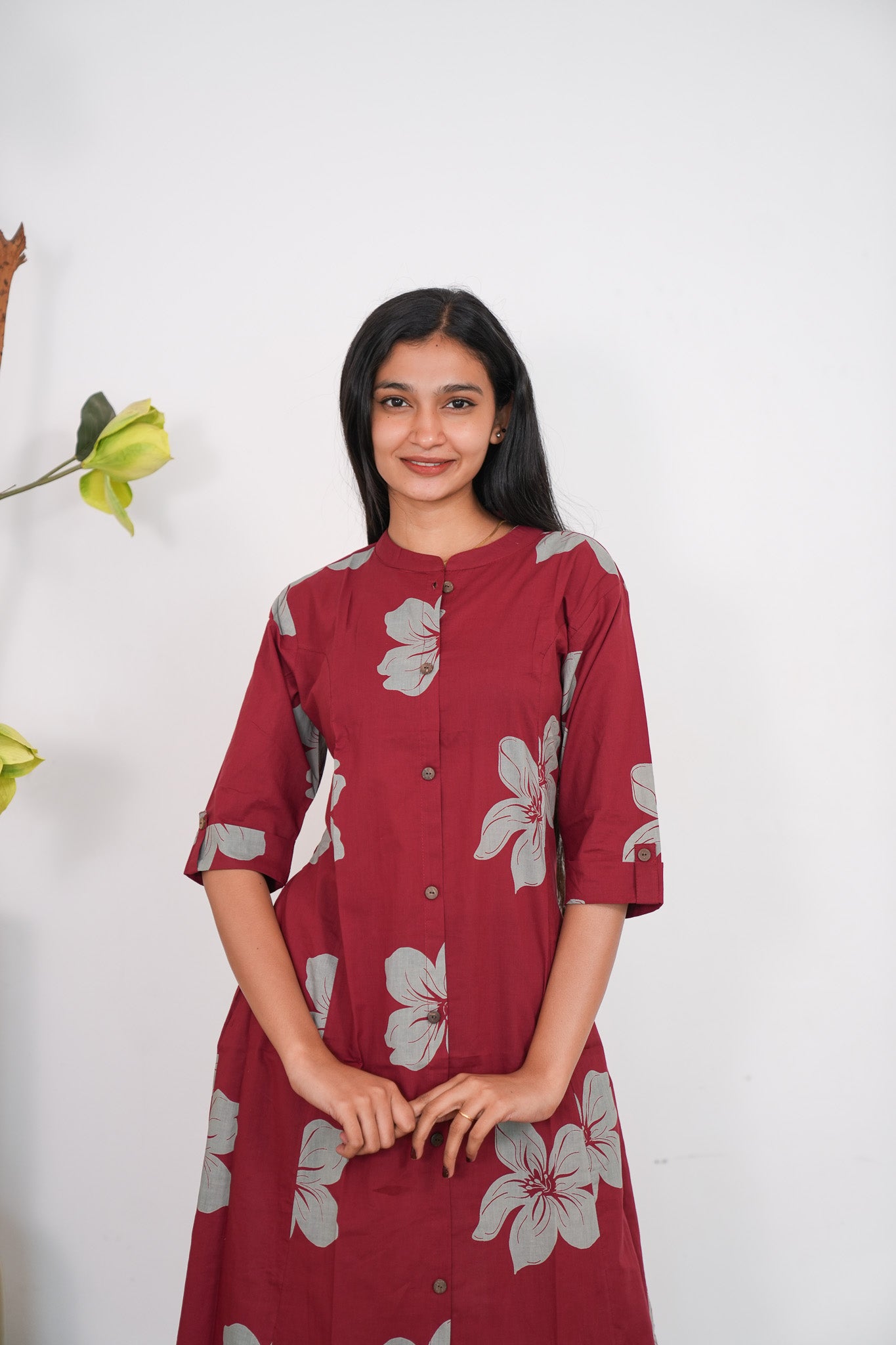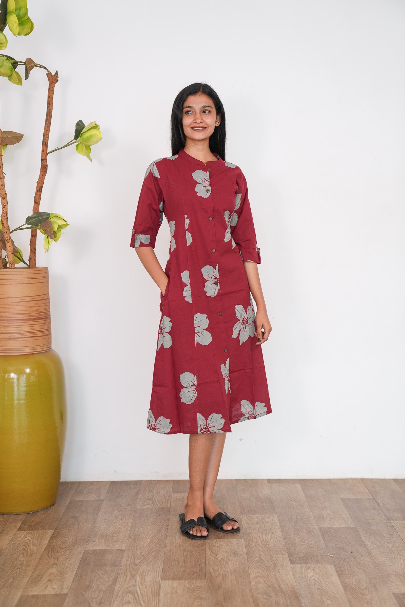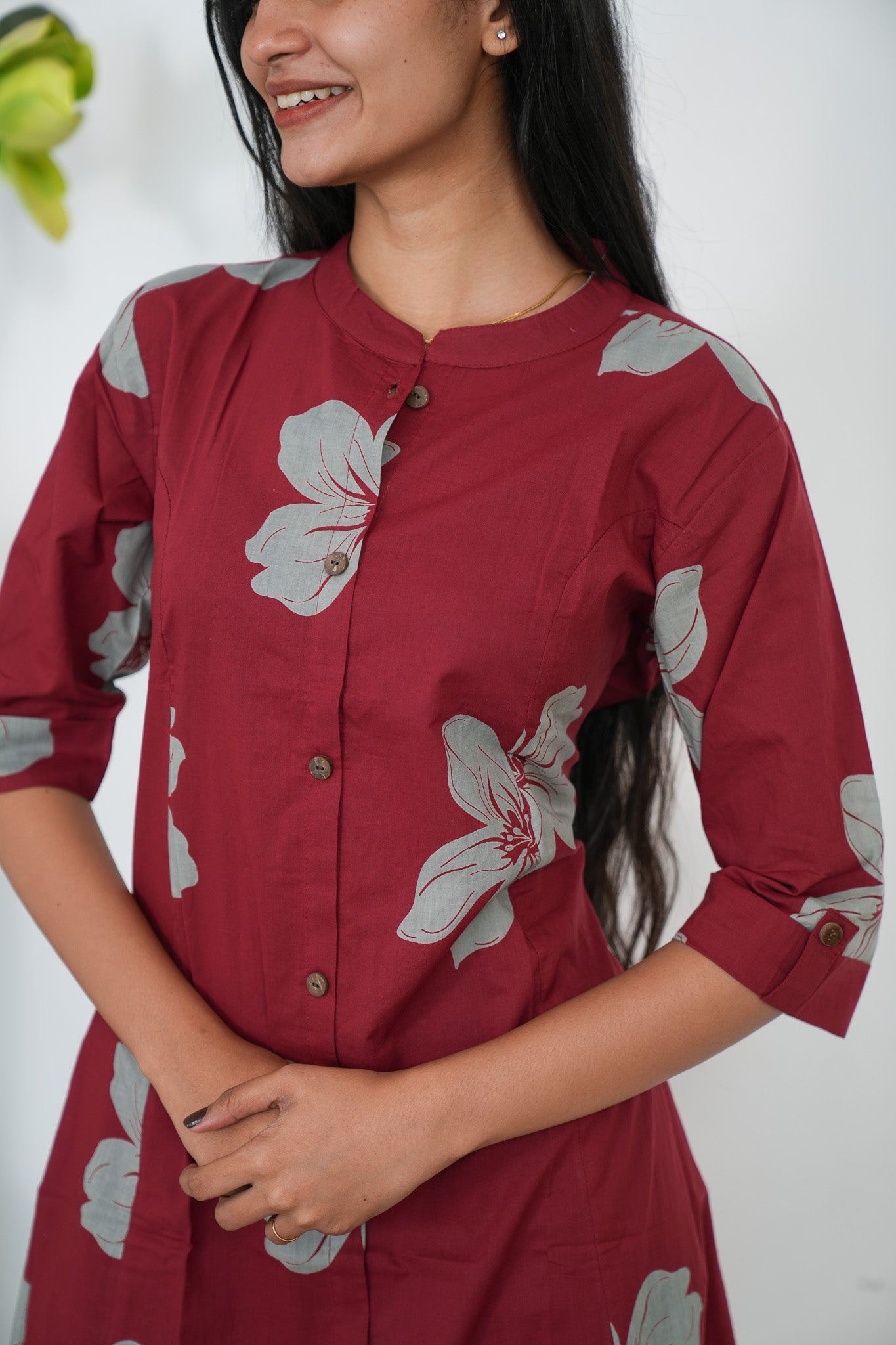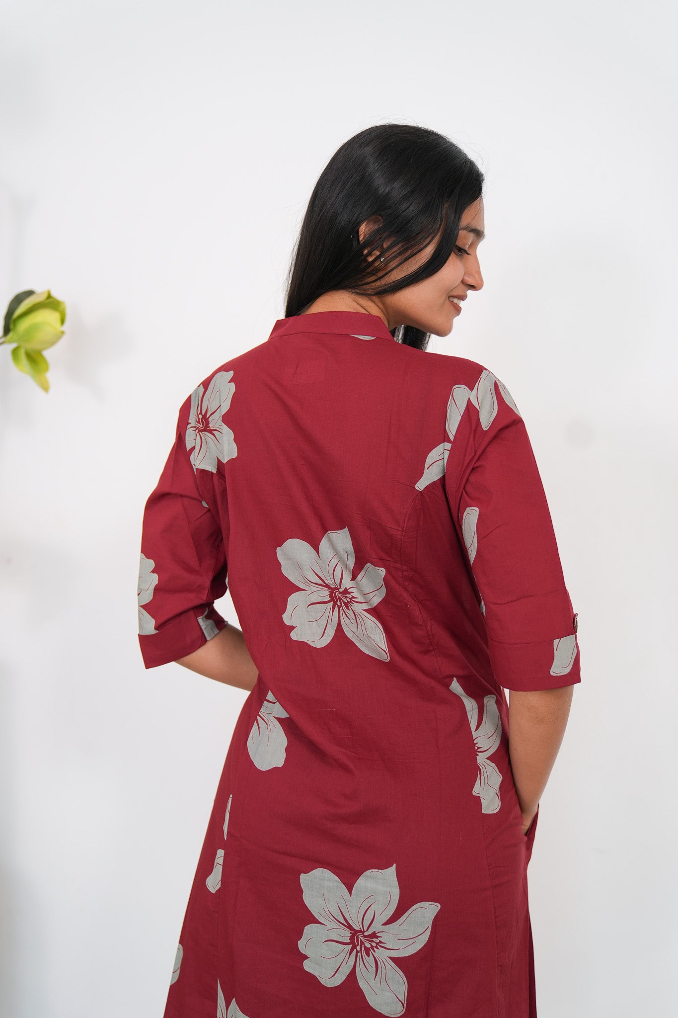 Red mandarin cotton  shirt dress that exudes elegance and sophistication. It has buttons running down which cannot be opened.