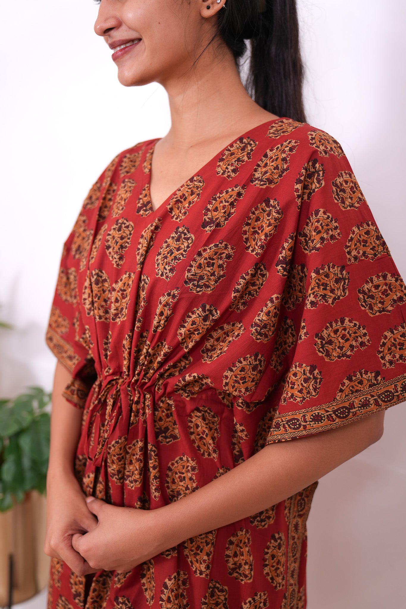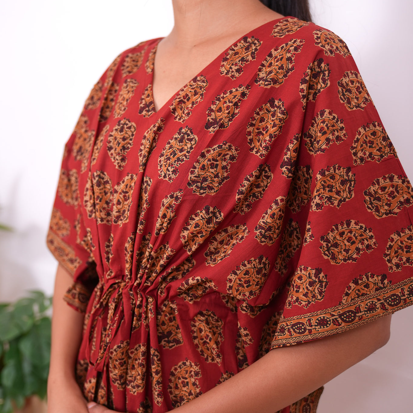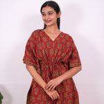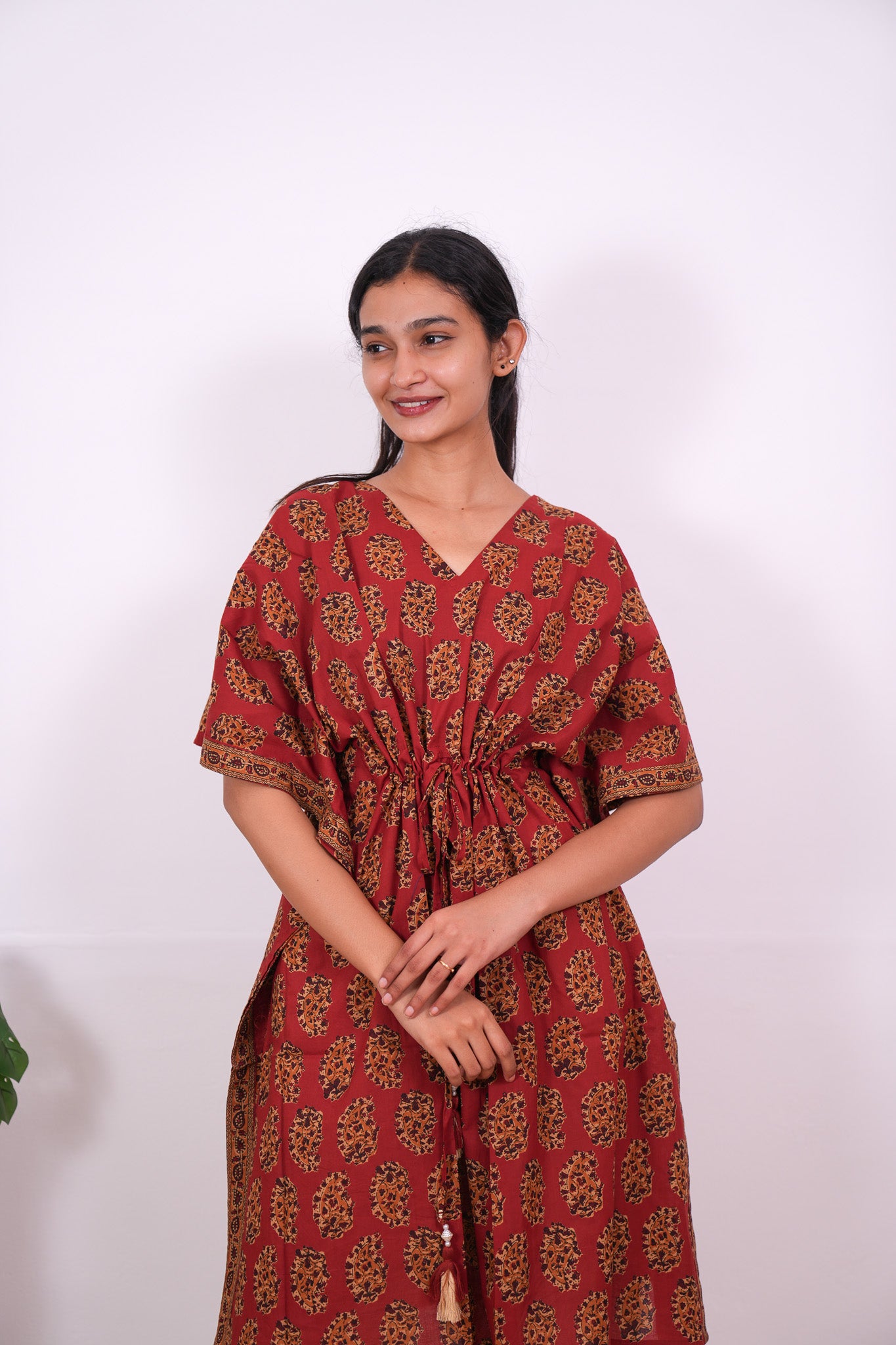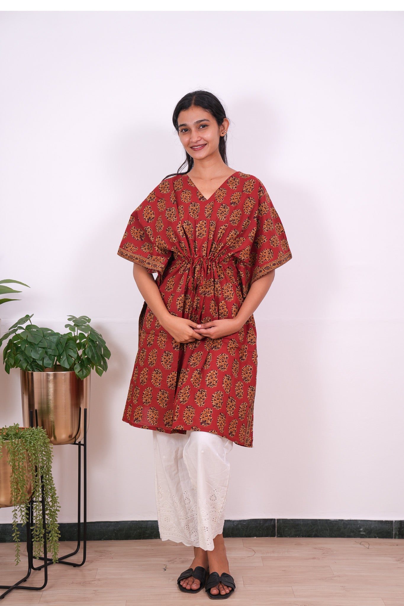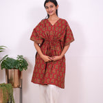 Easy breezy cotton kaftan made for you to feel absolute comfort, elegance and a total stunner at the same time. It comes V neck and tie in the centre with flowy silhouette and floral prints all over.