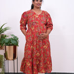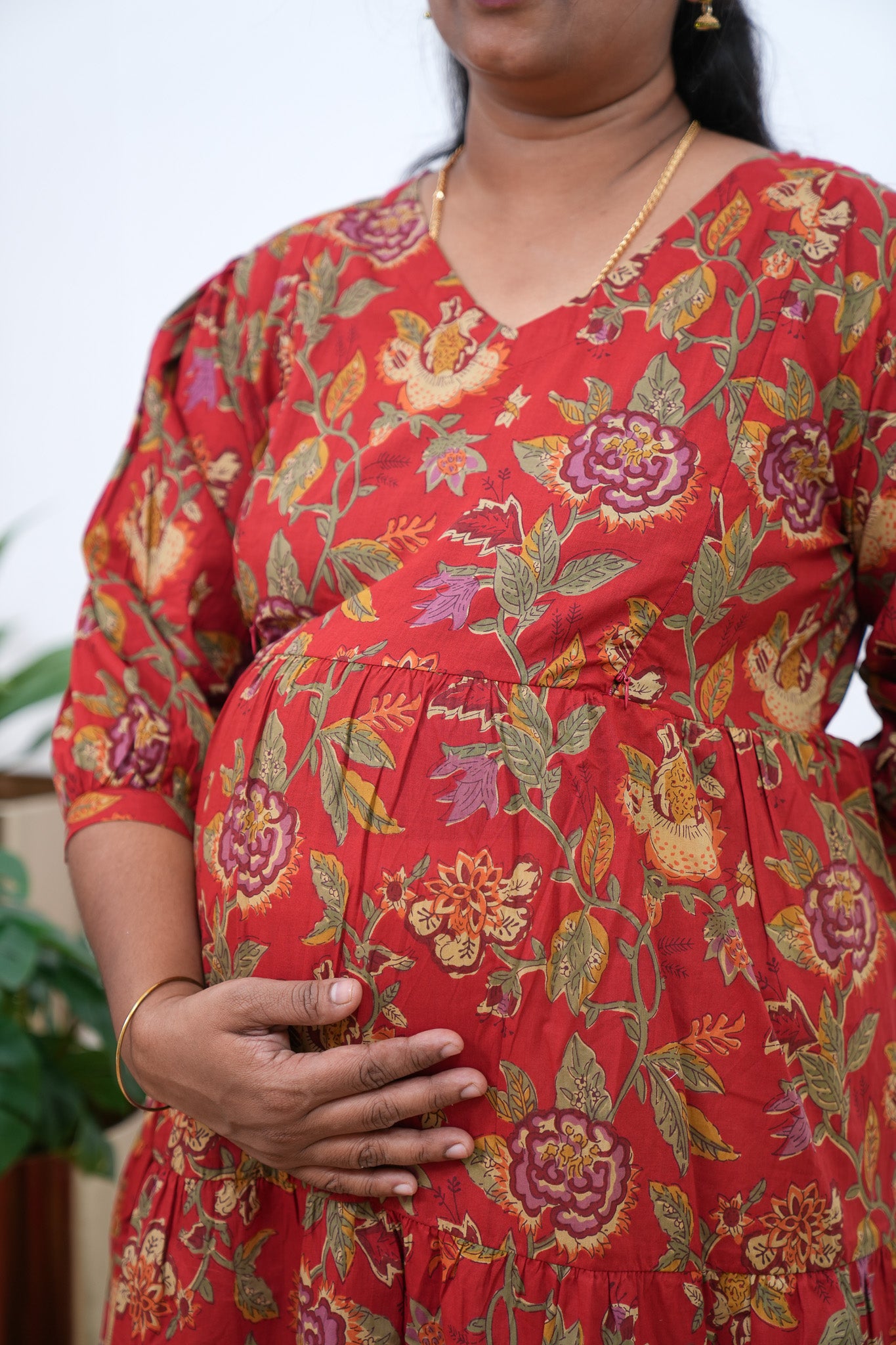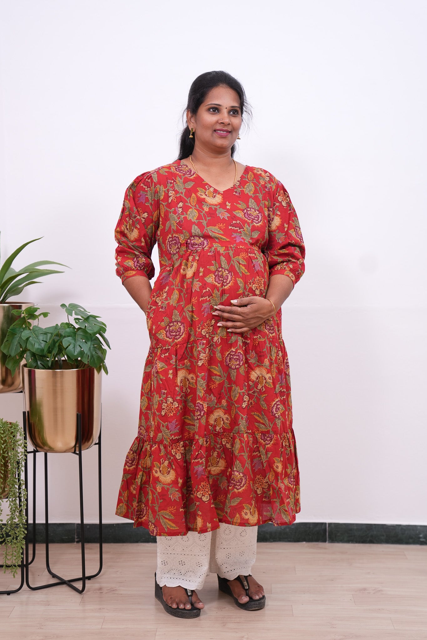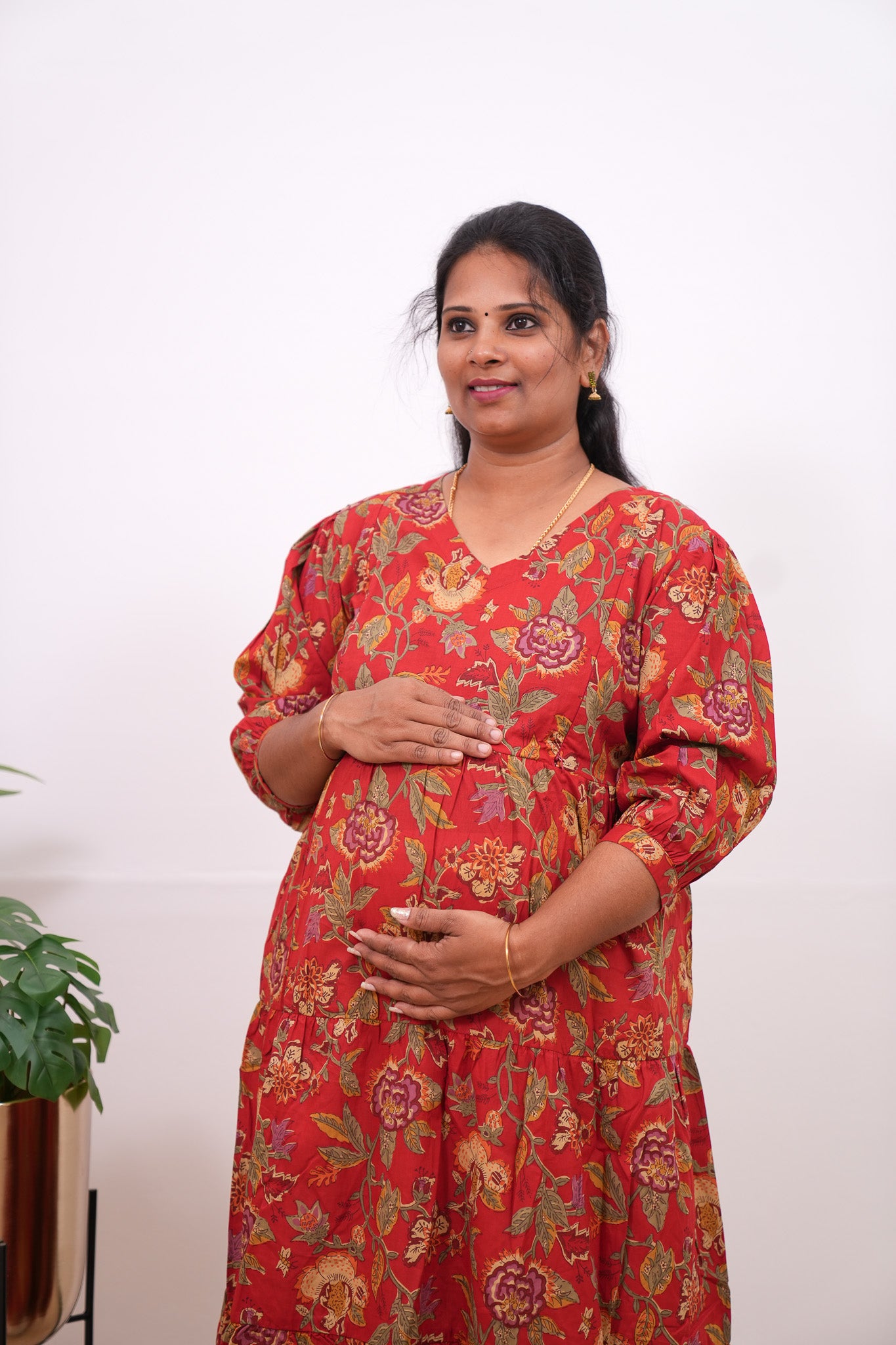 Red puff sleeve cotton maternity nursing wear with V neck and 3/4 sleeves that accomodates the bump throughout nine months and has invisible zip on both sides to carefully feed baby. It is light weight and soft to help you get through pregnancy and breastfeeding journey with ease.