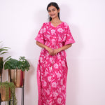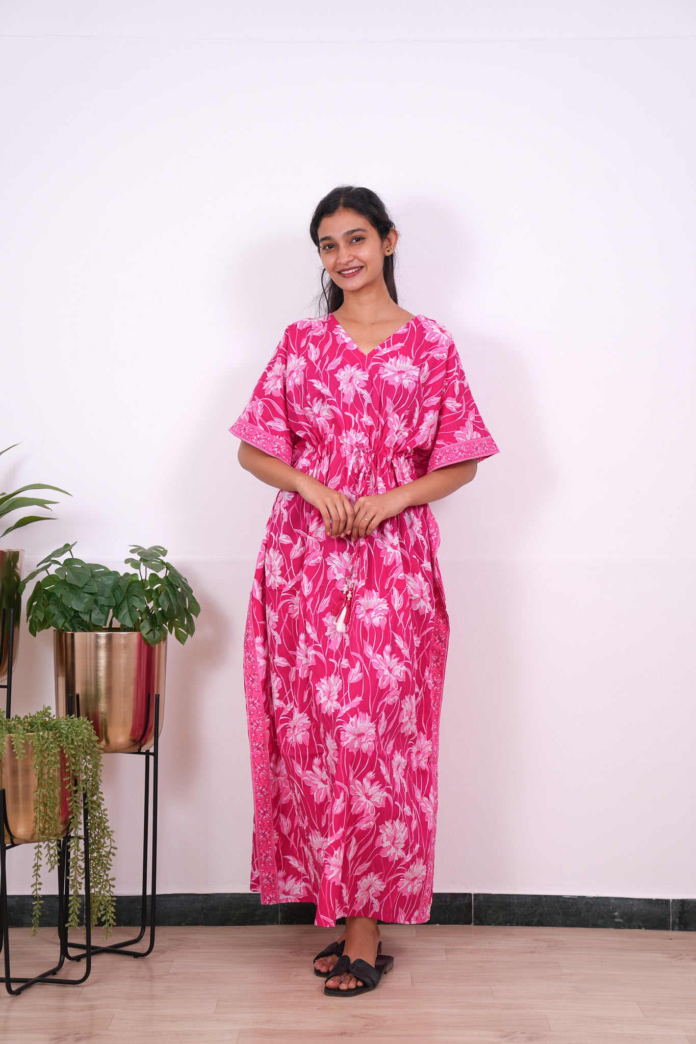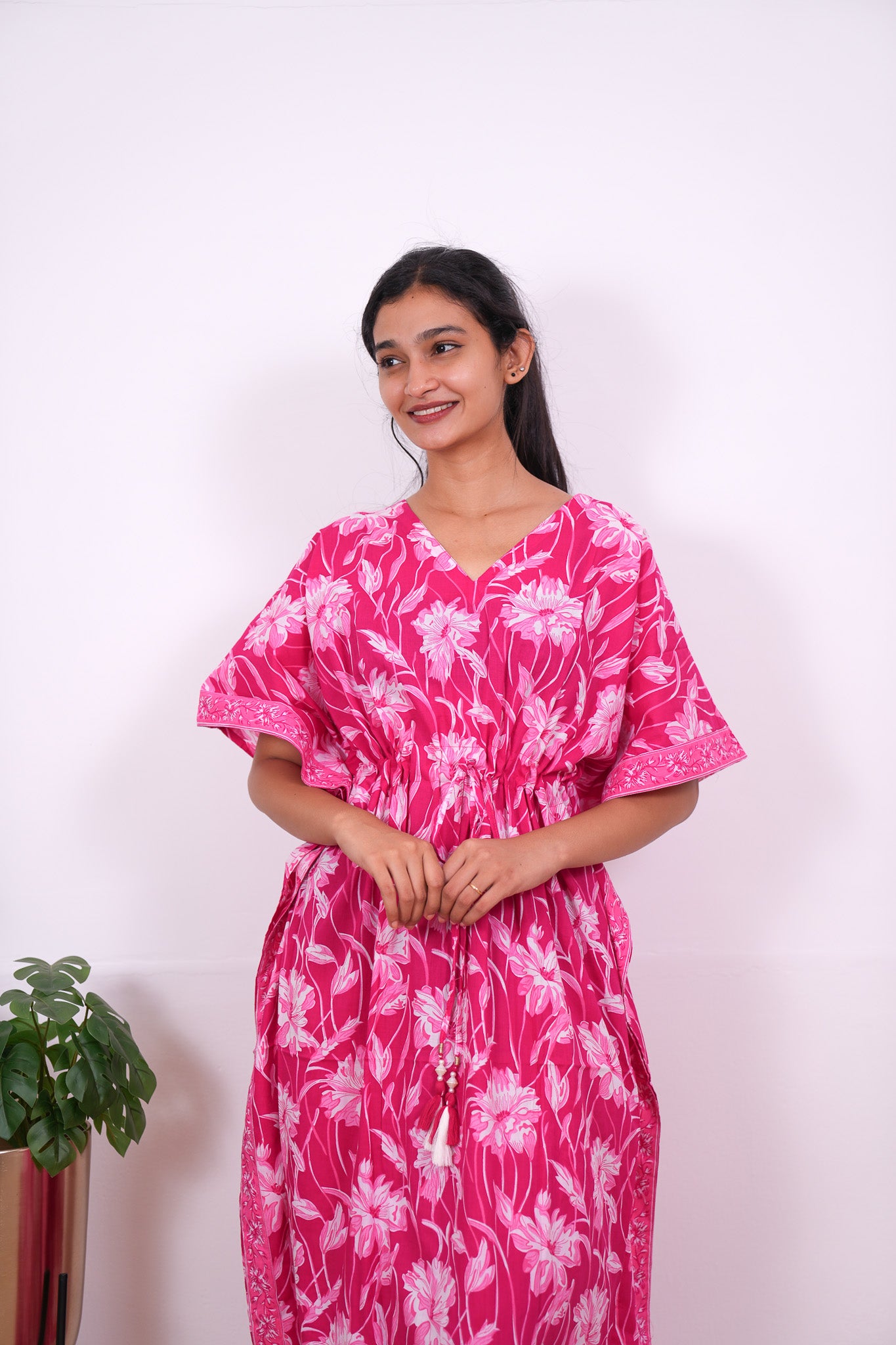 Easy breezy cotton kaftan made for you to feel absolute comfort, elegance and a total stunner at the same time. It comes V neck and tie in the centre with flowy silhouette and floral prints all over.