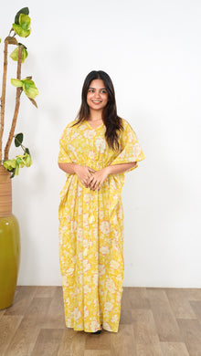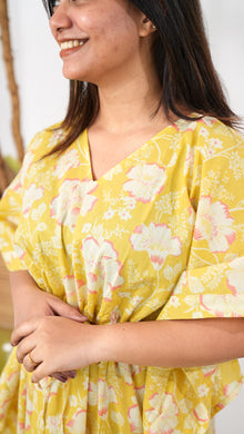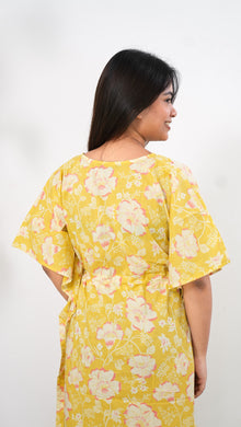 Easy breezy cotton kaftan made for you to feel absolute comfort, elegance and a total stunner at the same time. It comes V neck and tie in the centre with flowy silhouette and floral prints all over.