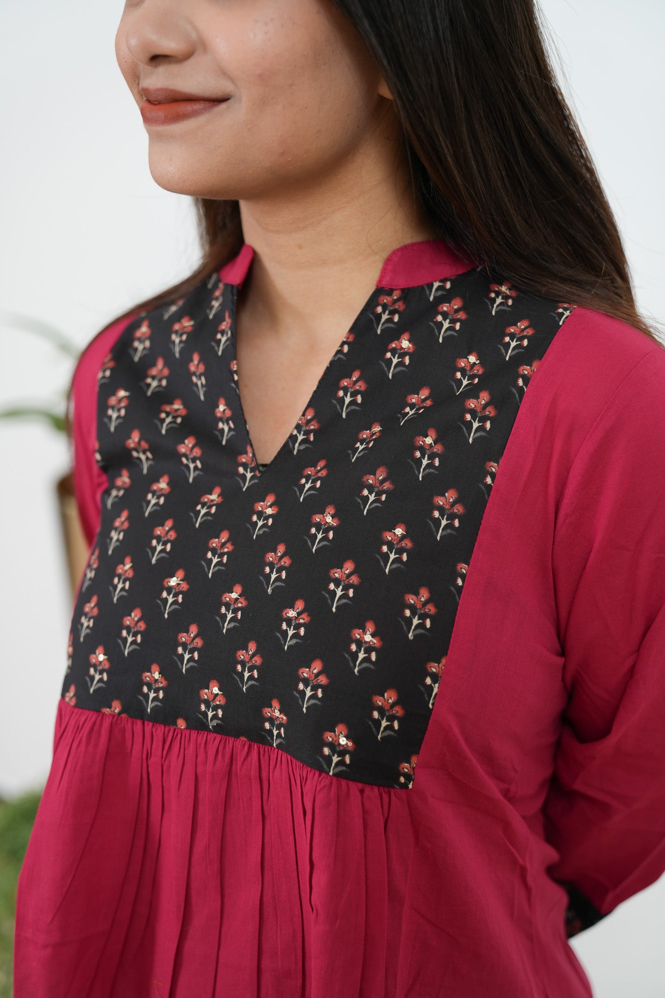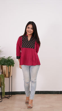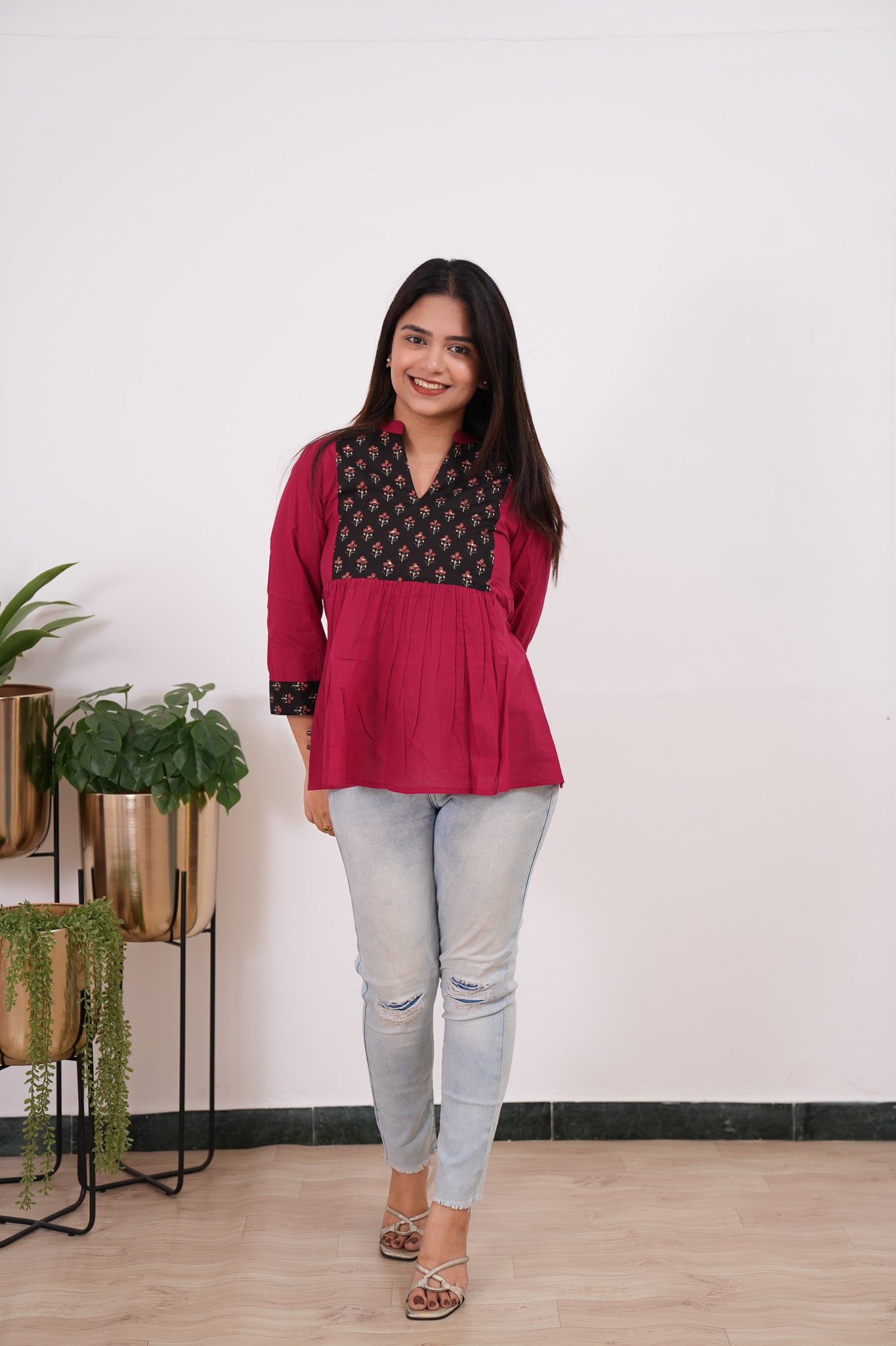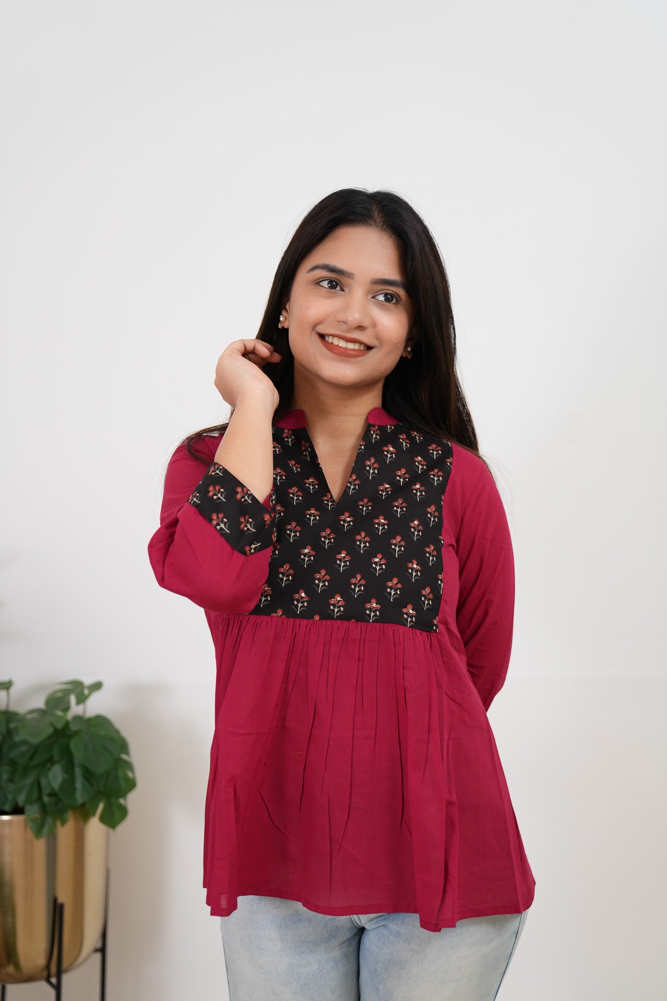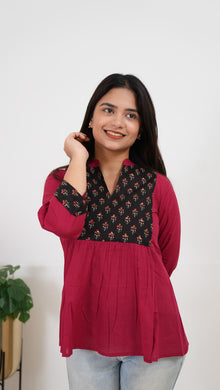 This cotton top with contrast hand block prints on the neck with mandarin collar and elbow length sleeves. There is a flare from the waist region to accentuate the style. These tops are definitely to be a part of your essential wardrobe.