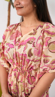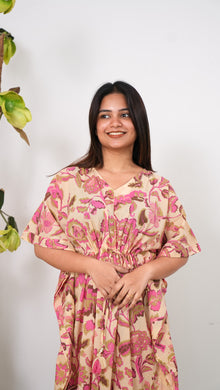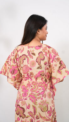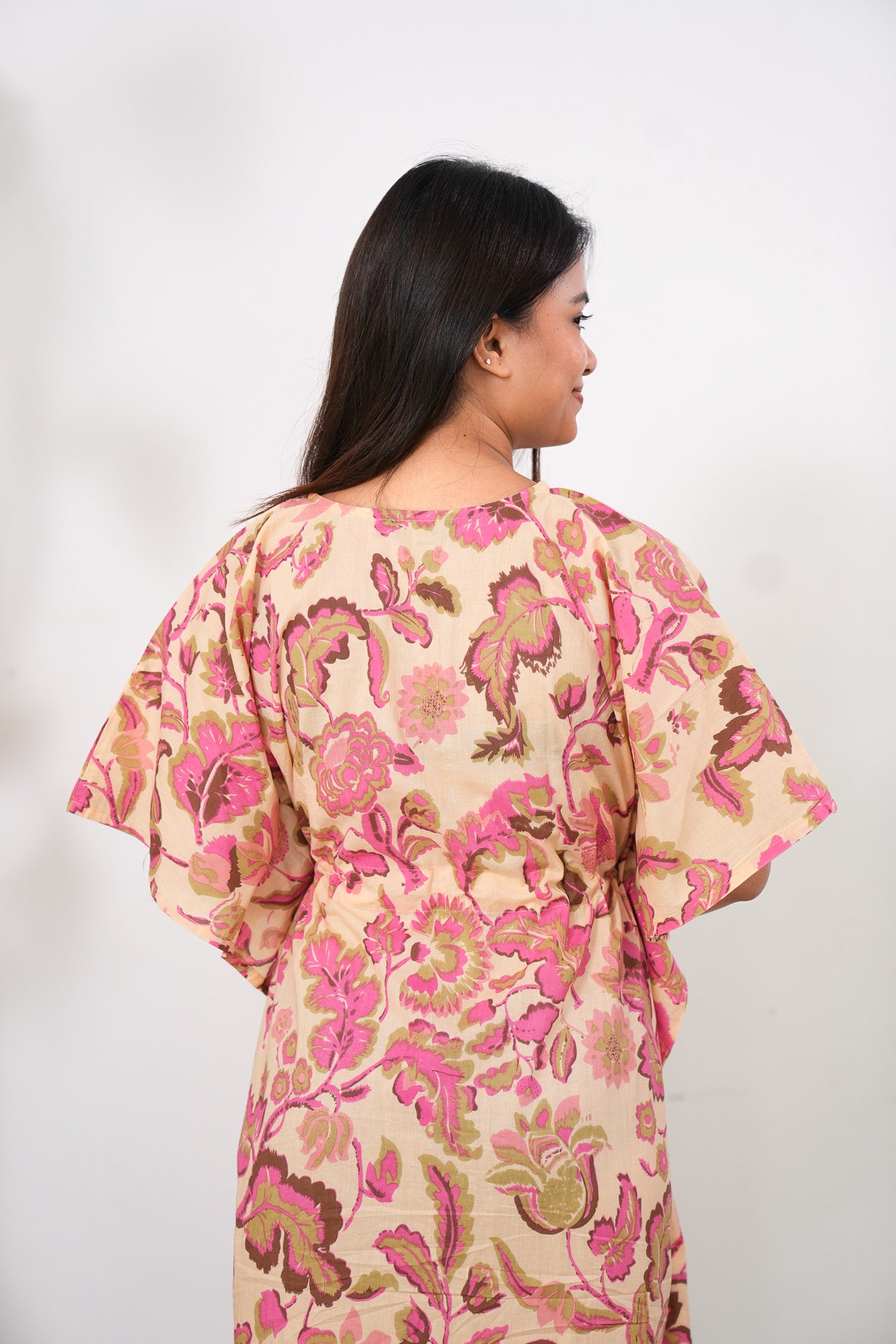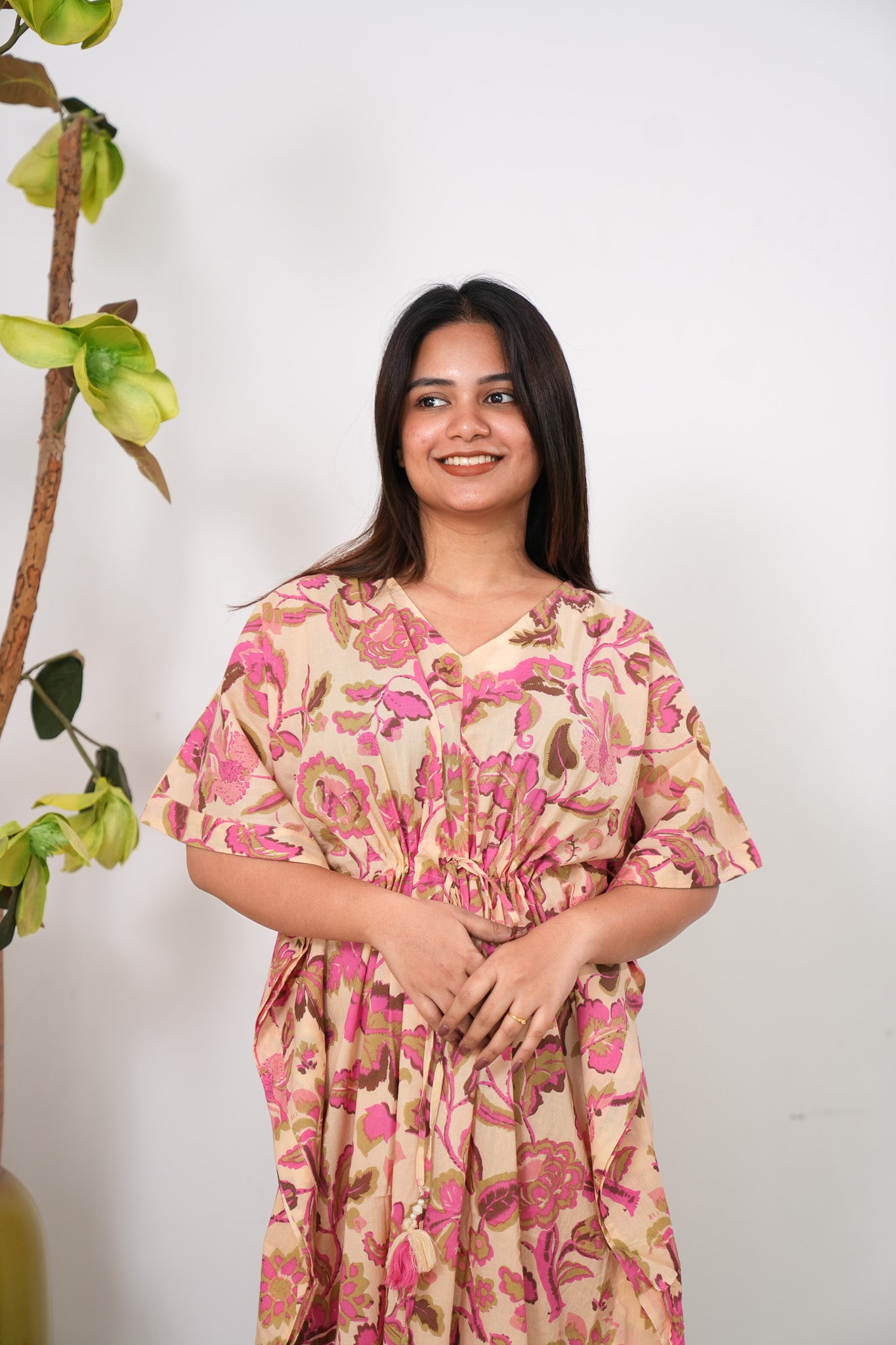 Easy breezy cotton kaftan made for you to feel absolute comfort, elegance and a total stunner at the same time. It comes V neck and tie in the centre with flowy silhouette and floral prints all over.