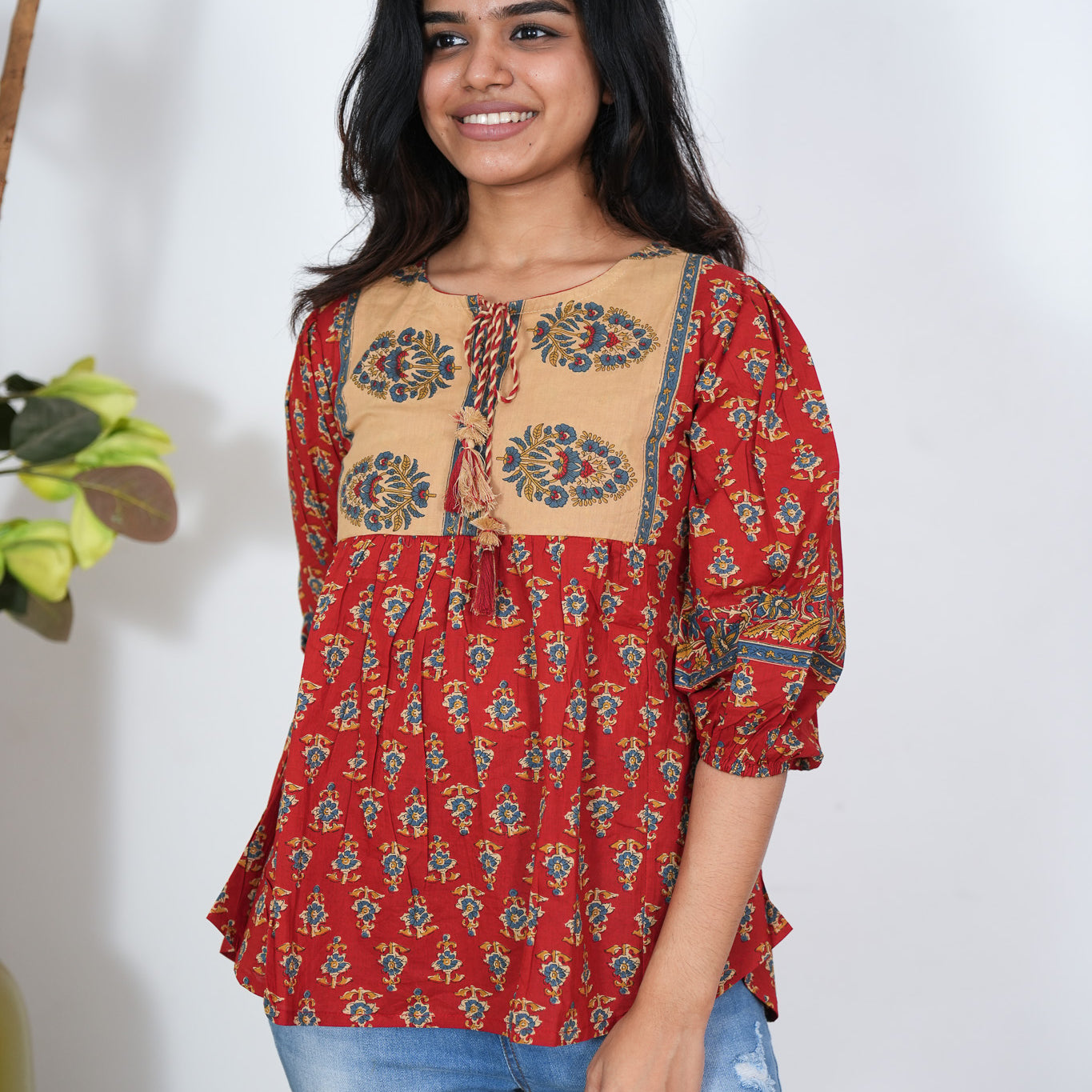 The top has round neck with tie detailing and elbow length sleeves. It has beautiful floral pattern all over the top with peplum style. It can be paired with jeans or skirt to complete the look.