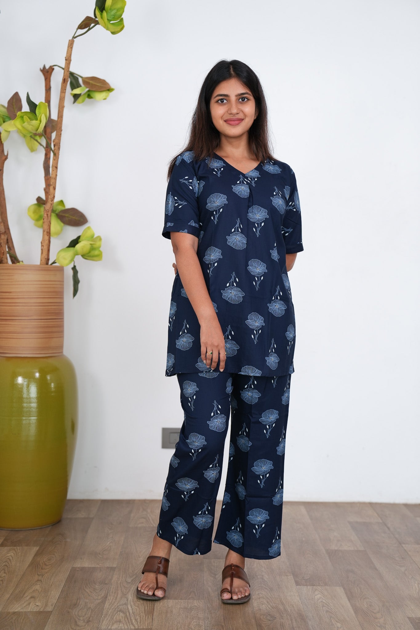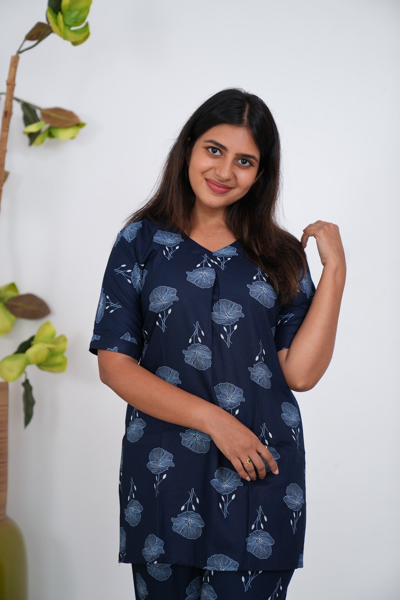 These Co-ords are so cozy, comfortable and chic making it perfect to relax at home or sleep in them. The top has a V neck with short length sleeves. Pant comes with elastic and it has a straight fit.