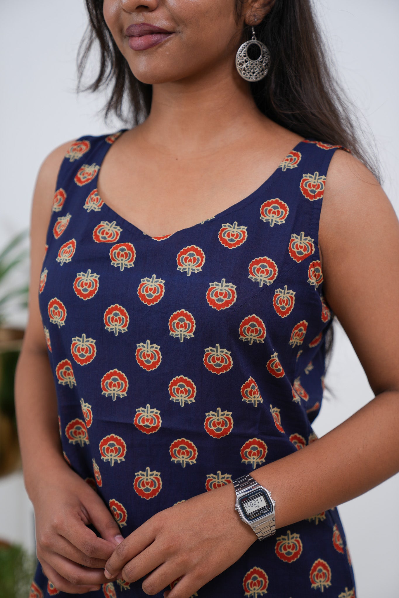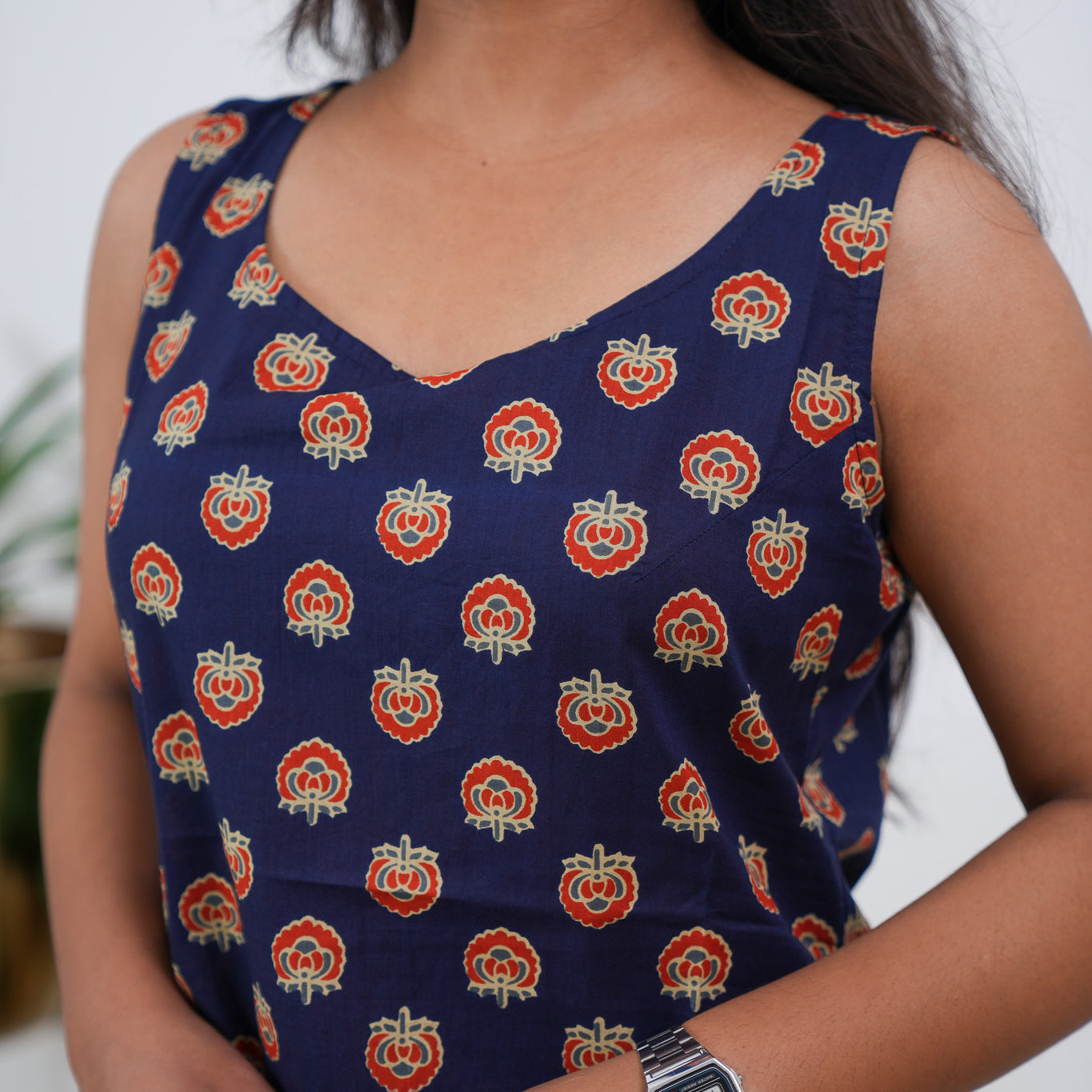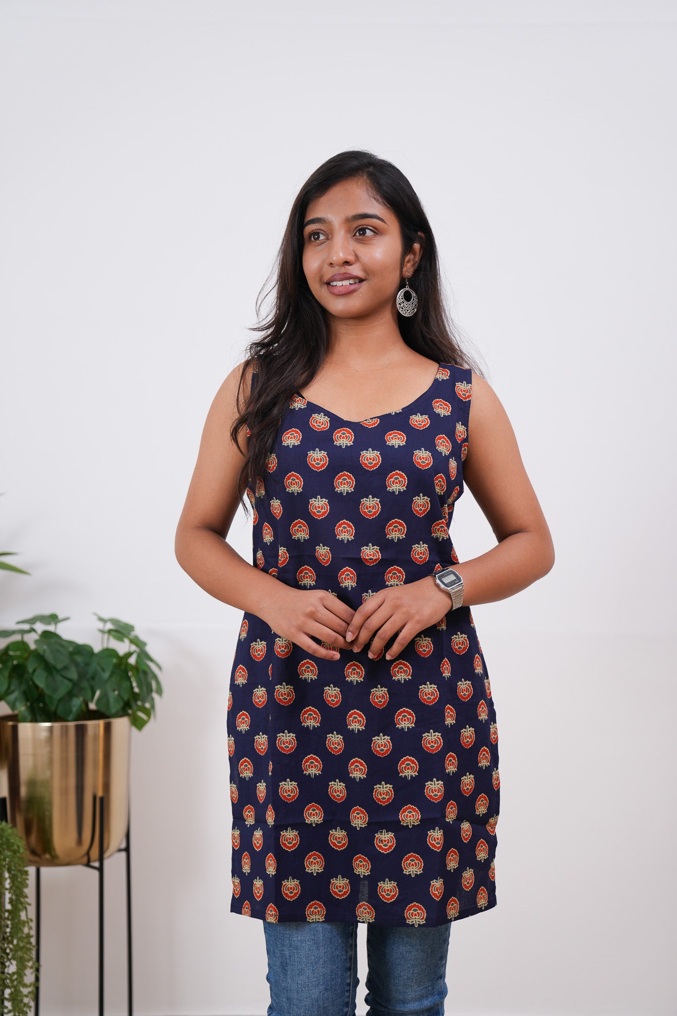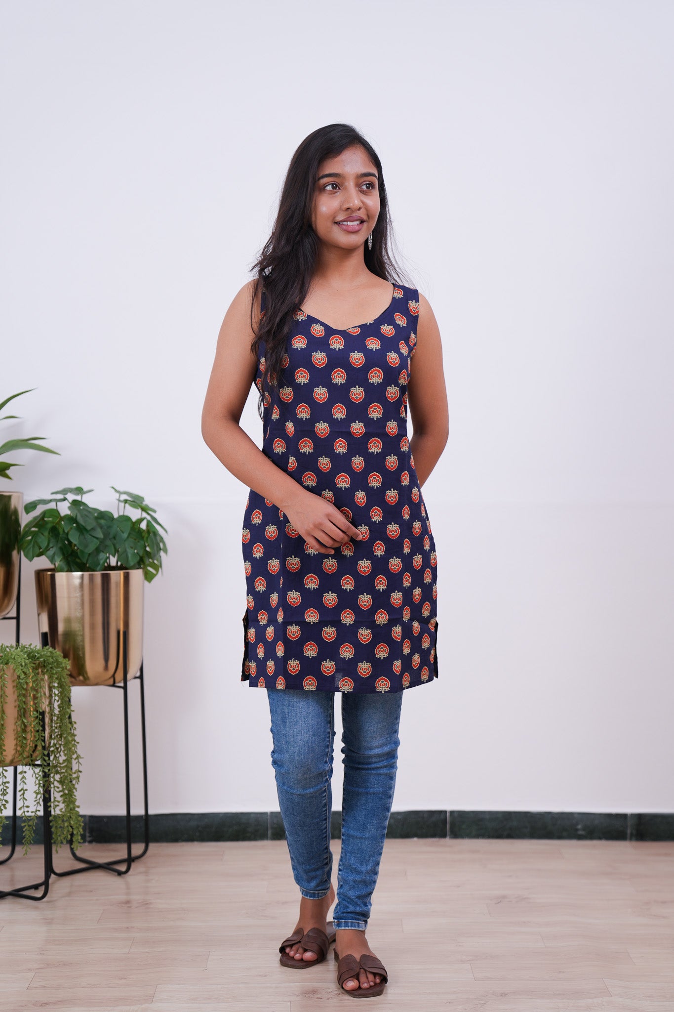 The tunic has round neck and it is sleeveless. It has beautiful floral pattern all over the top.  It can be paired with jeans or skirt to complete the look.