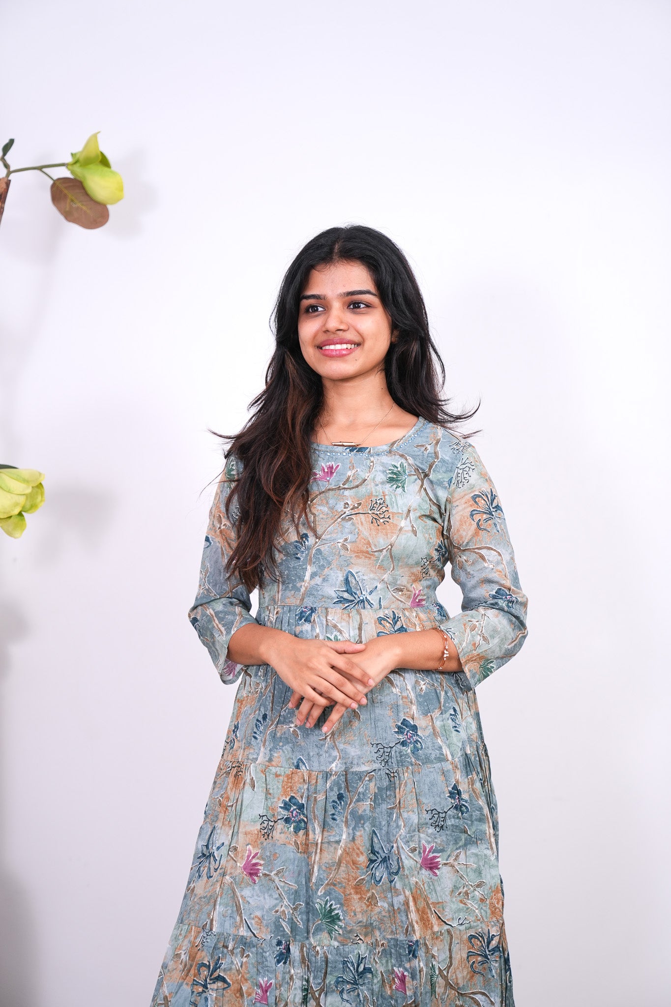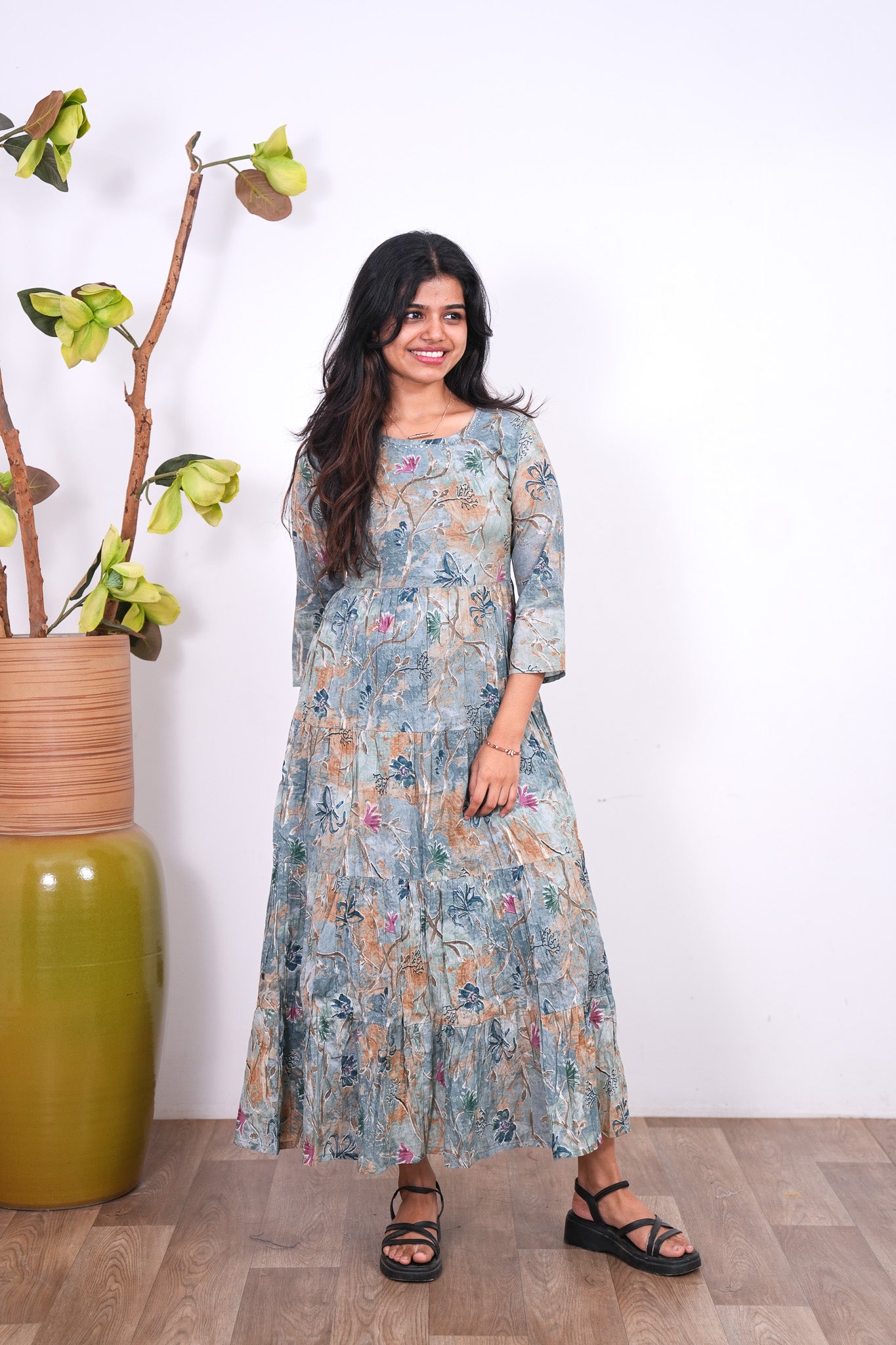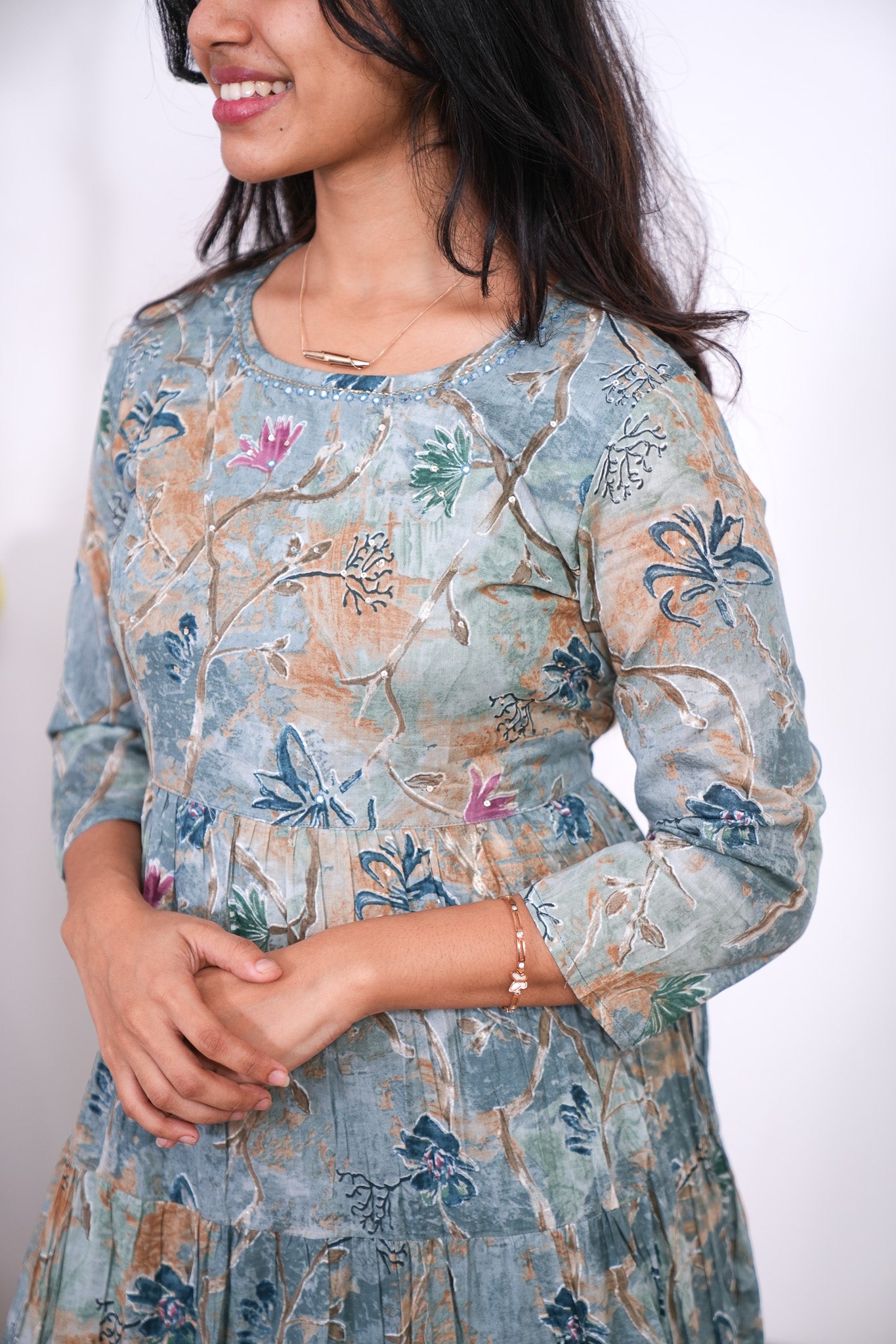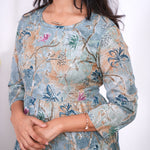 Sea blue cotton long gown that exudes elegance and sophistication. It has floral print throughout the gown with sequin detailing at the neck.