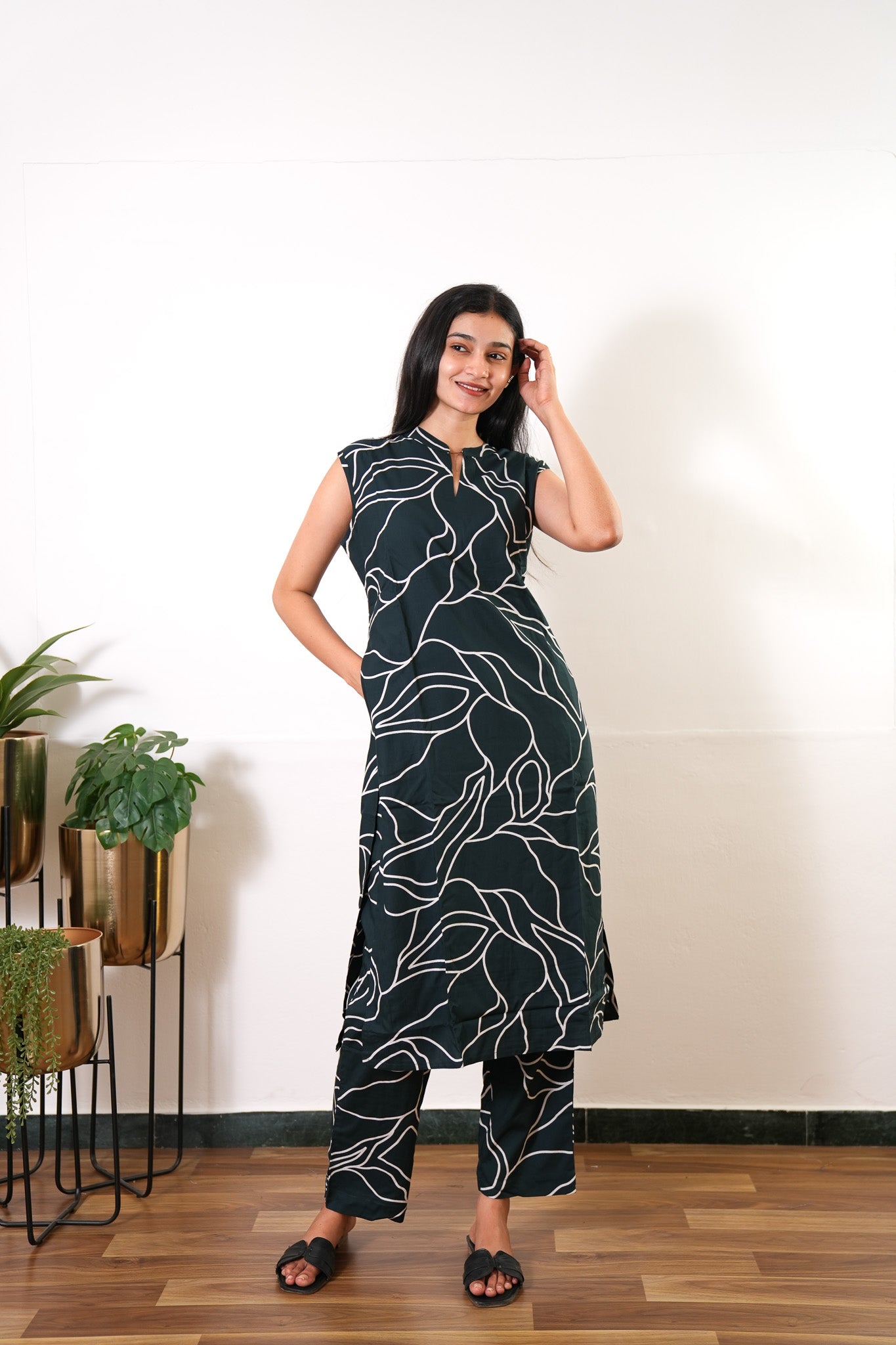 These Co-ords are so cozy, comfortable and chic making it perfect for brunch and a girl's day out! The kurta has a mandarin collar with attached sleeves. Pant comes with elastic and has a palazzo fit.