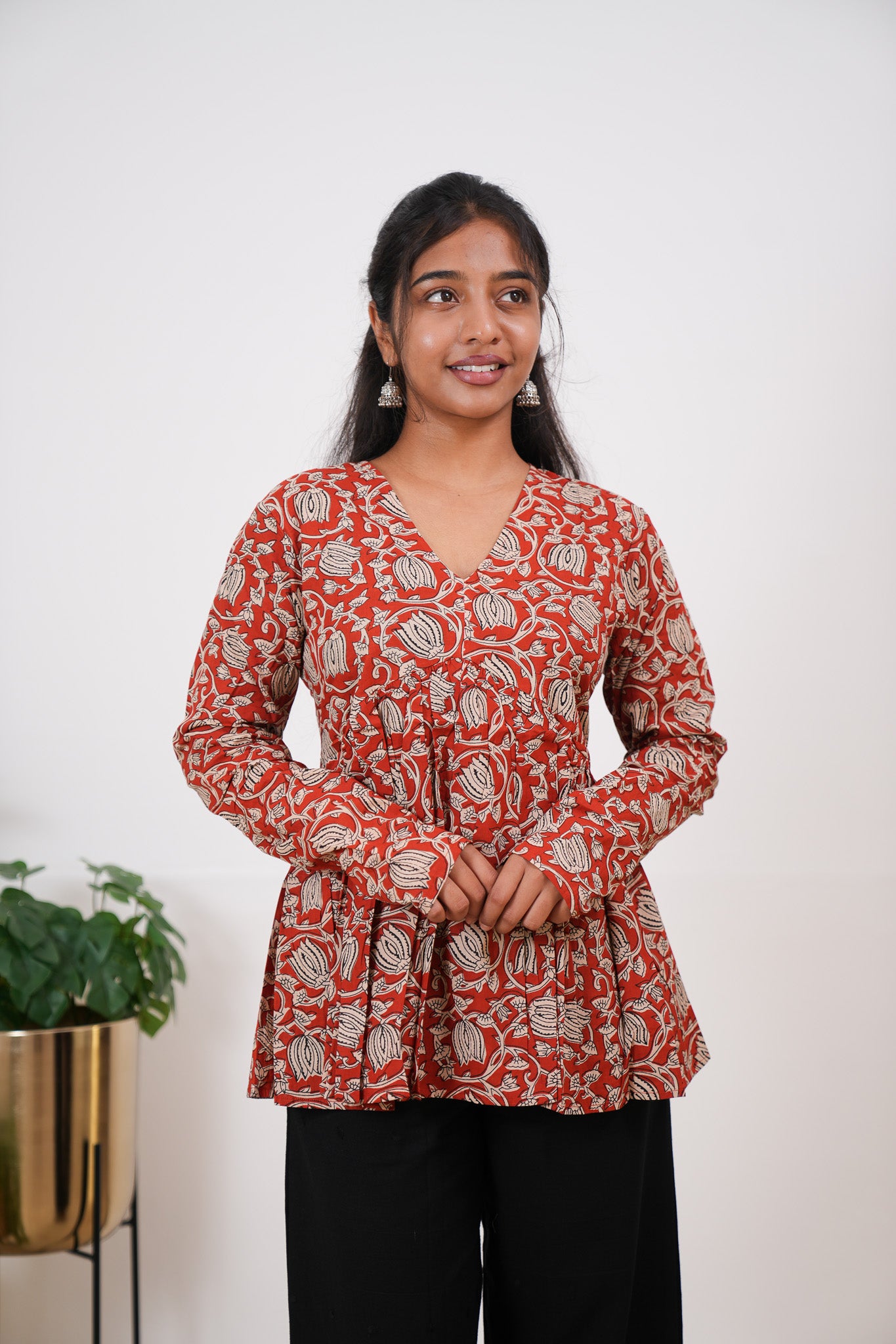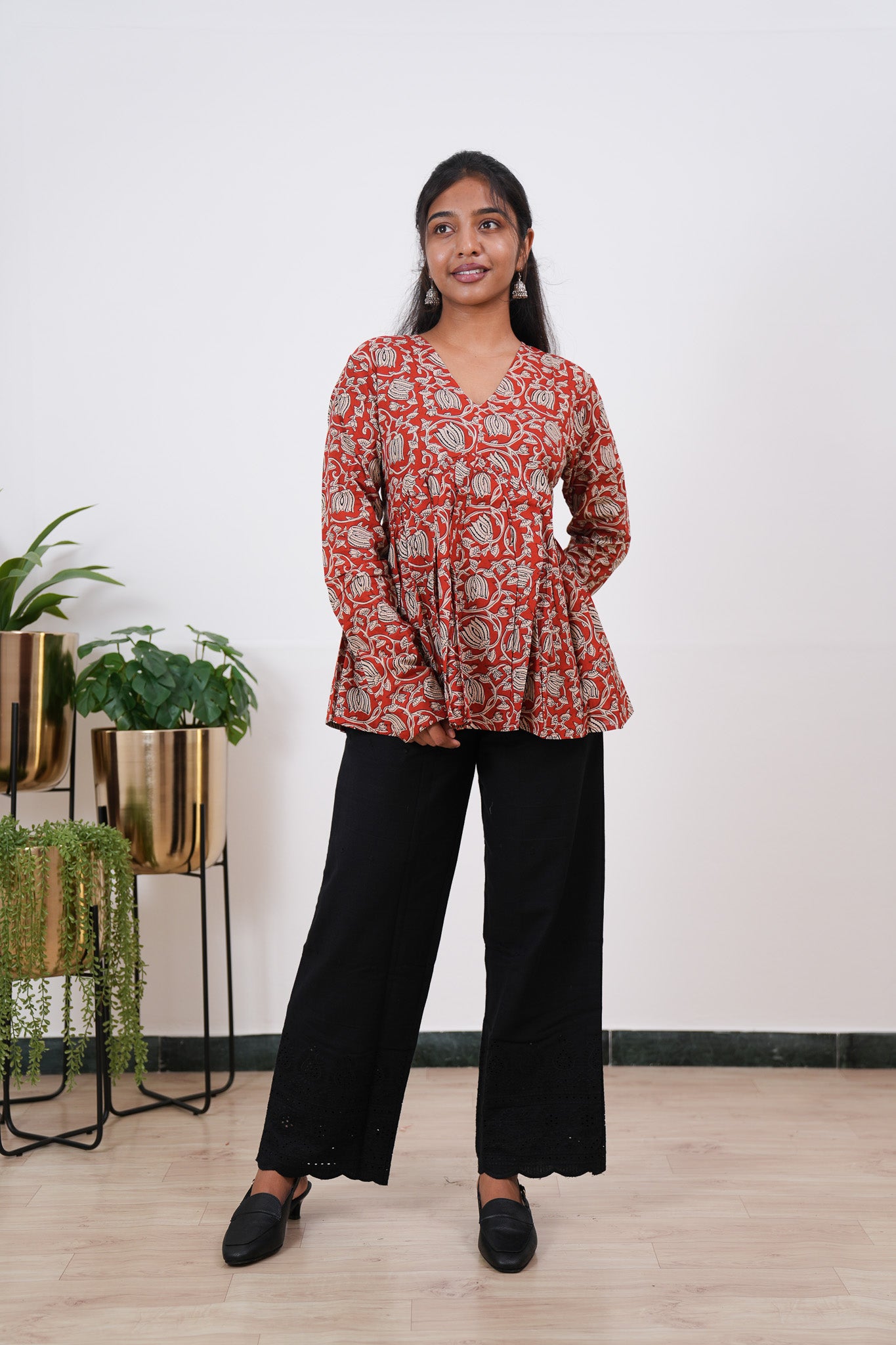 This cotton short kurti has V neck and full length sleeves they are extremely breathable and light weight making it perfect for all day comfort. They can be paired with jeans , skirt or even cotton pants.