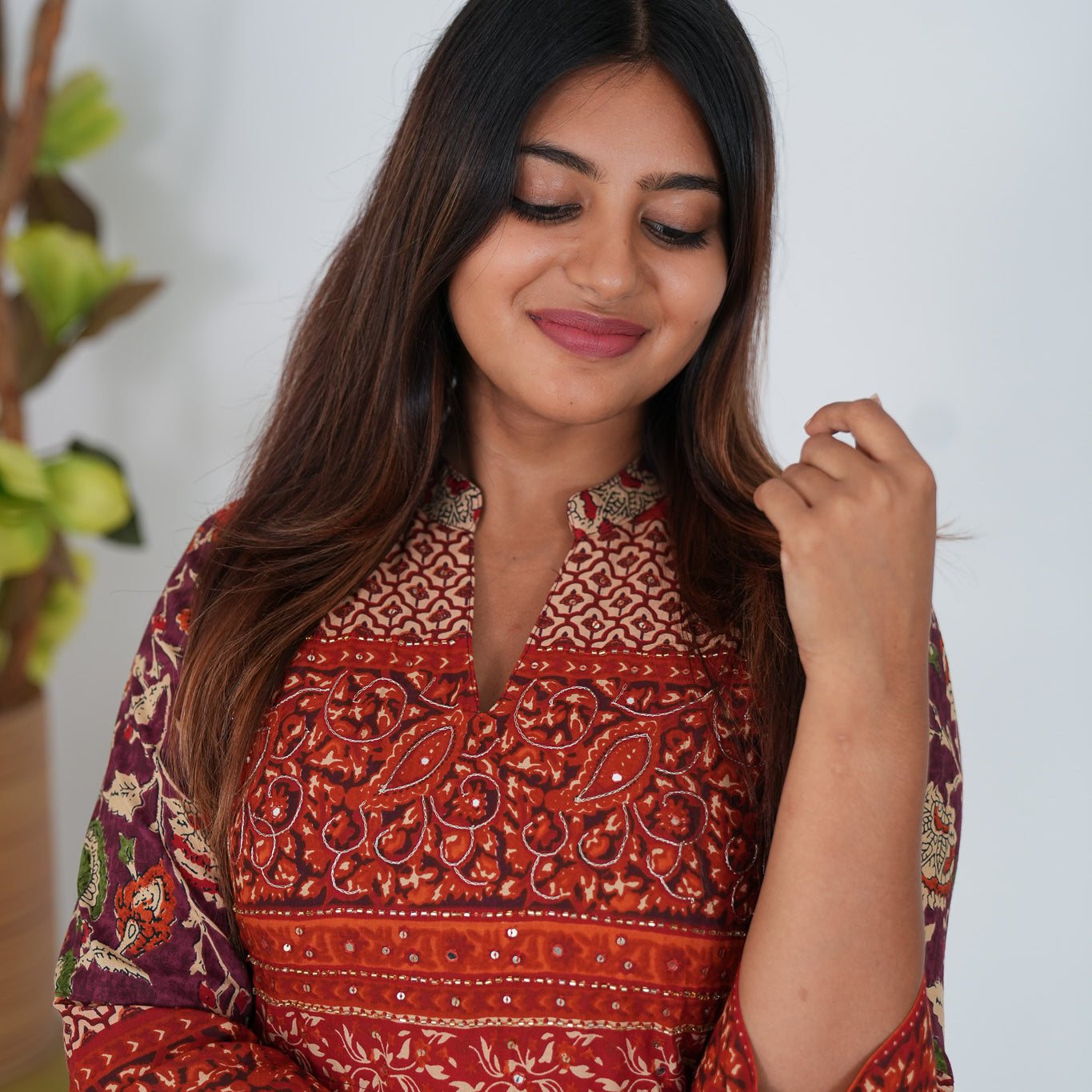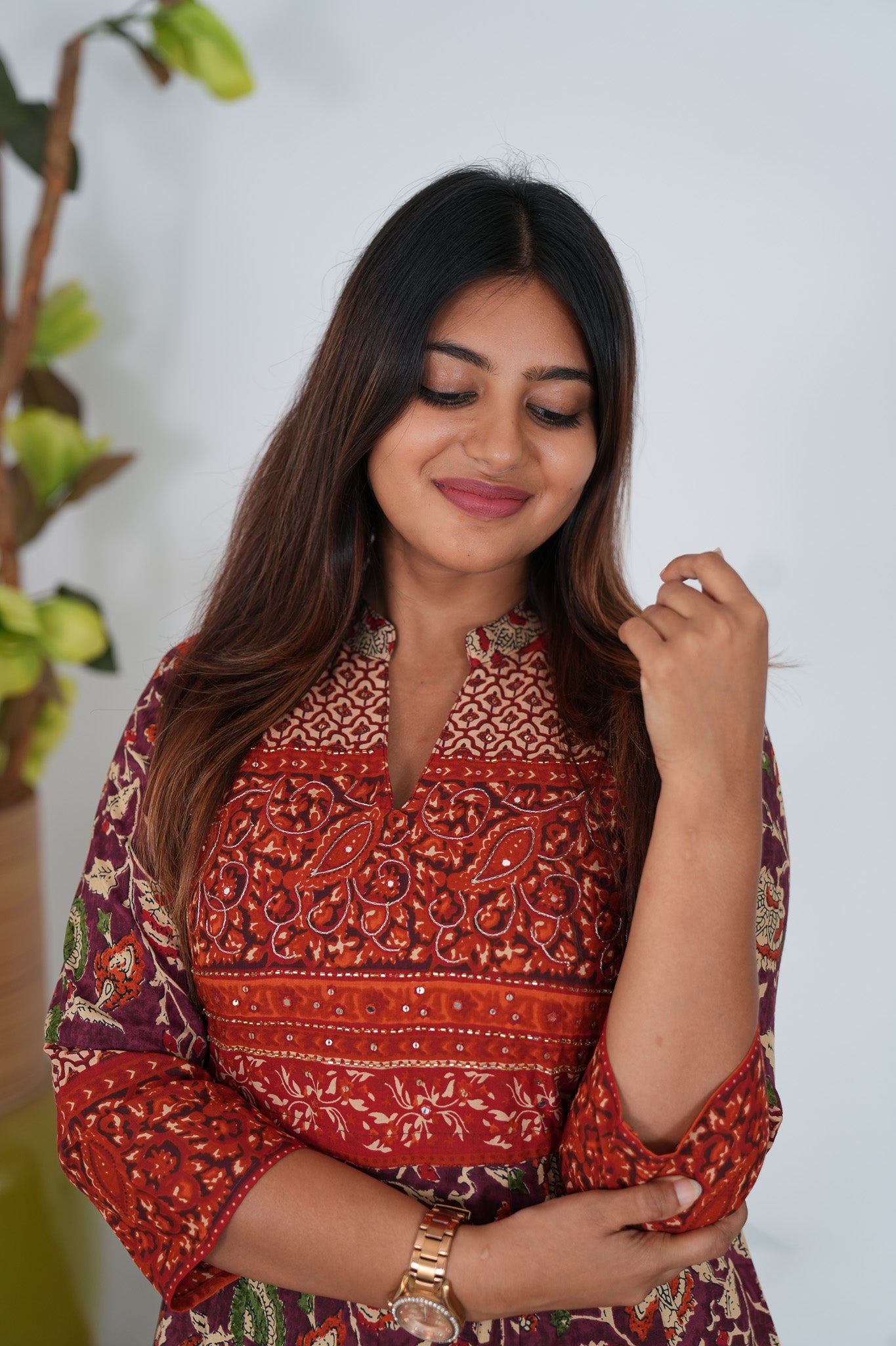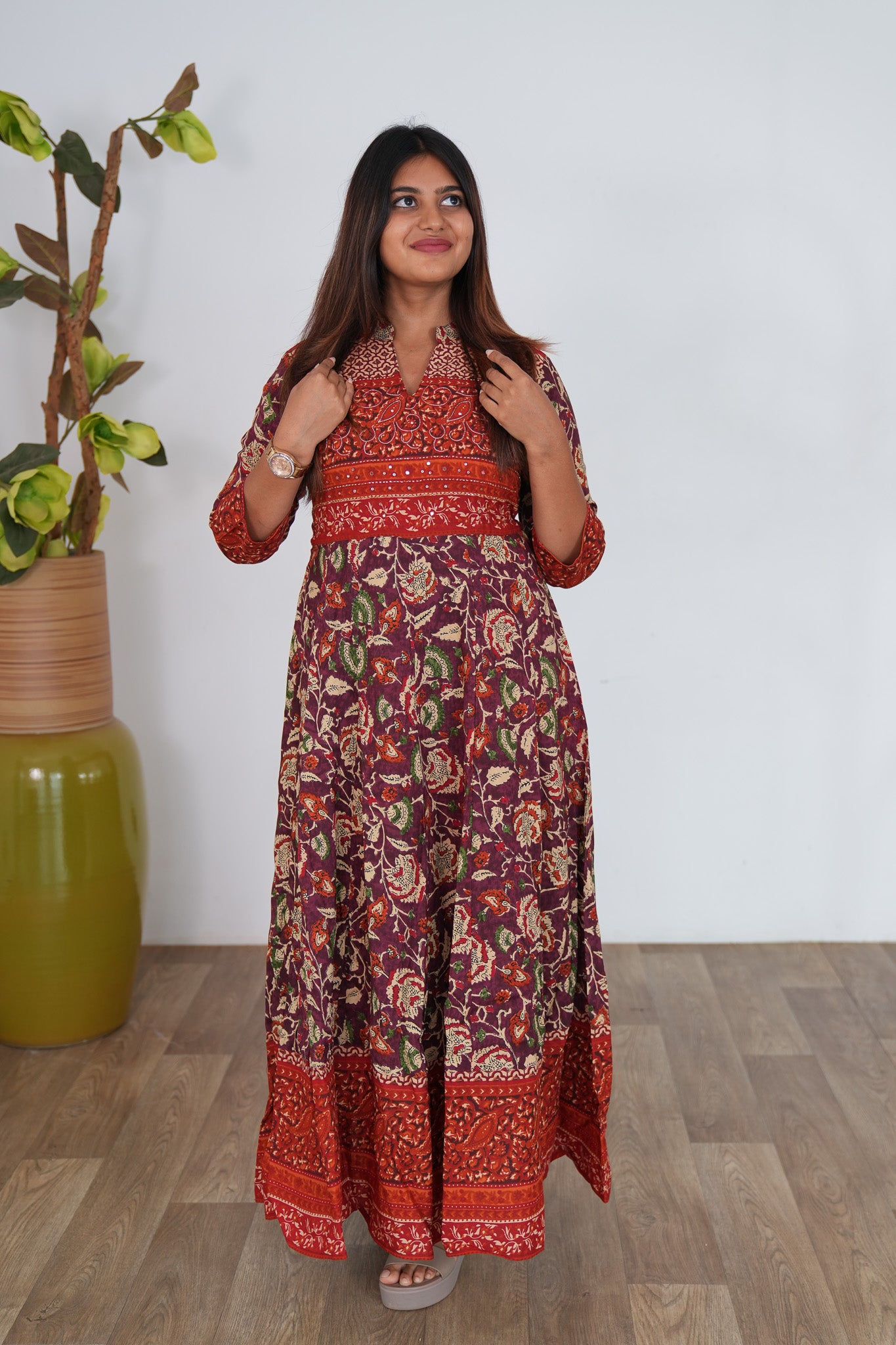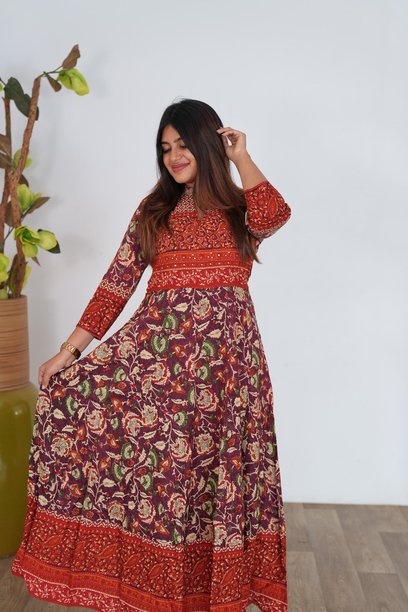Rust orange long gown that exudes elegance and sophistication. It has floral print throughout the gown.