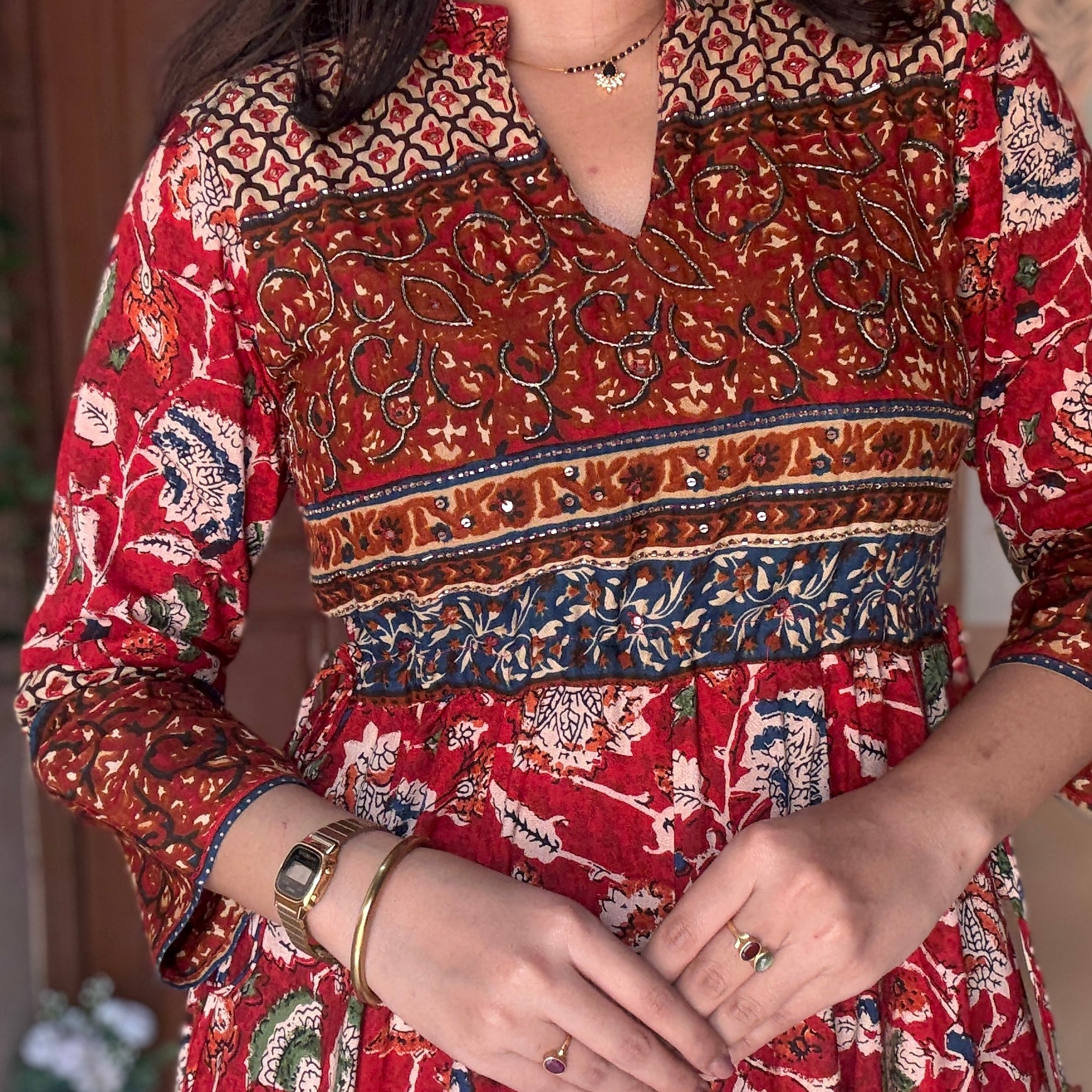 Crimson long gown that exudes elegance and sophistication. It has floral print throughout the gown.