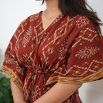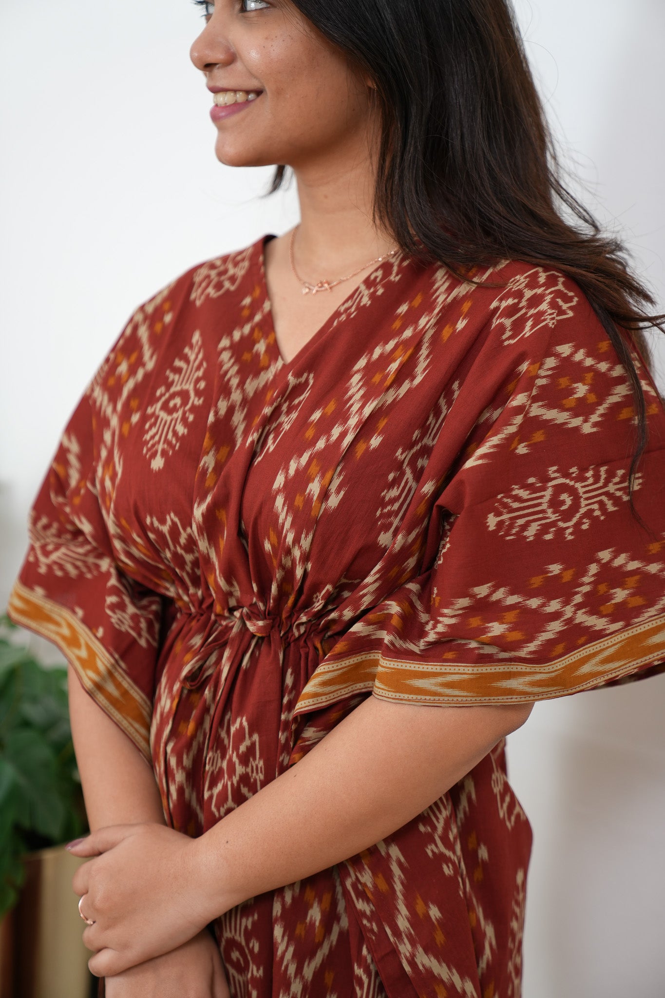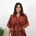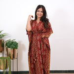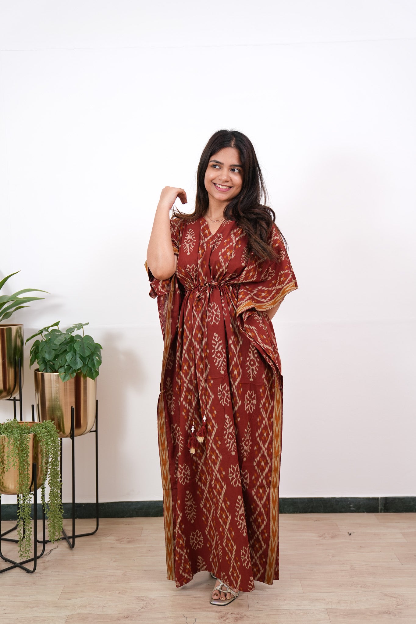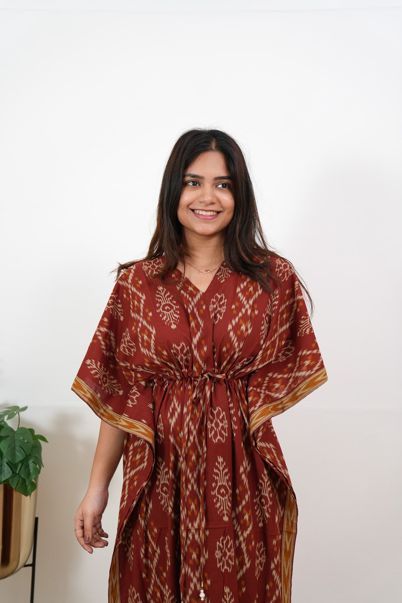 Easy breezy cotton kaftan made for you to feel absolute comfort, elegance and a total stunner at the same time. It comes V neck and tie in the centre with flowy silhouette and floral prints all over.