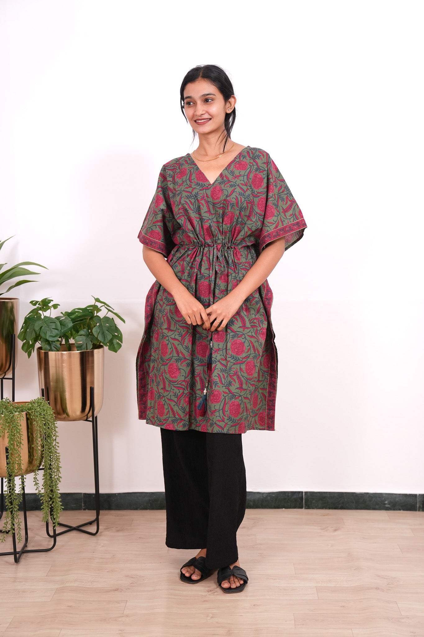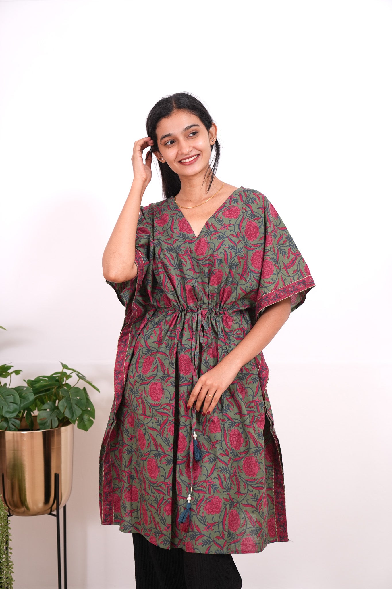 Easy breezy cotton kaftan made for you to feel absolute comfort, elegance and a total stunner at the same time. It comes V neck and tie in the centre with flowy silhouette and floral prints all over.