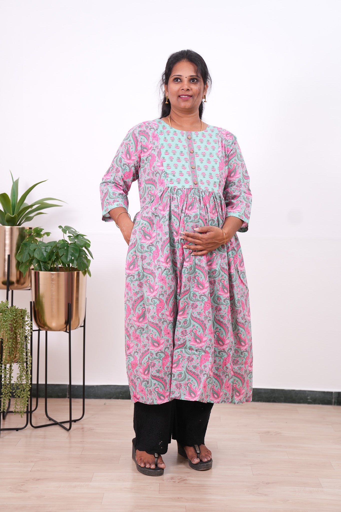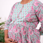 Sea green floral  maternity nursing wear with round neck and 3/4 sleeves that accomodates the bump throughout nine months and has invisible zip on both sides to carefully feed baby. It is light weight and soft to help you get through pregnancy and breastfeeding journey with ease.