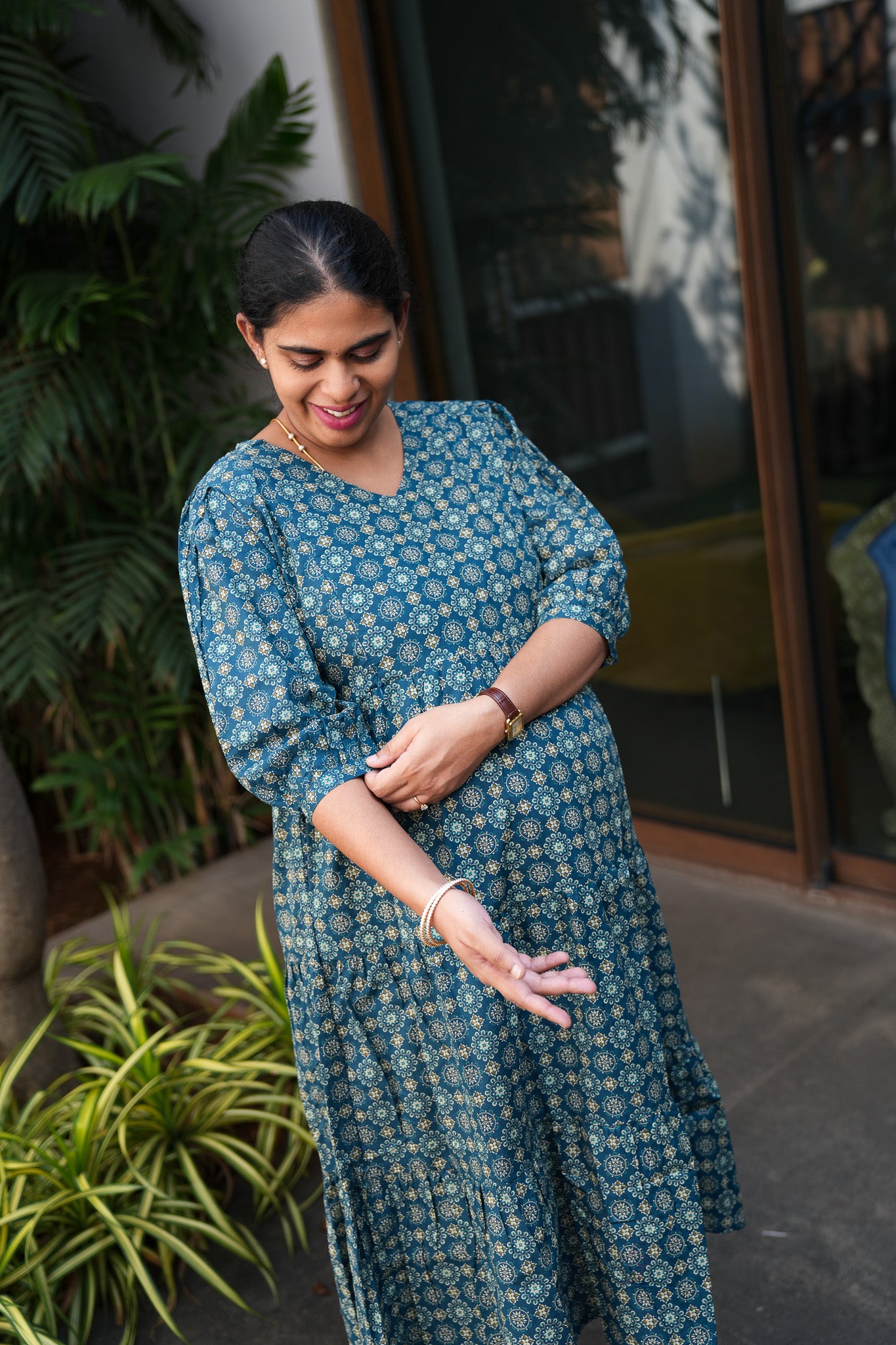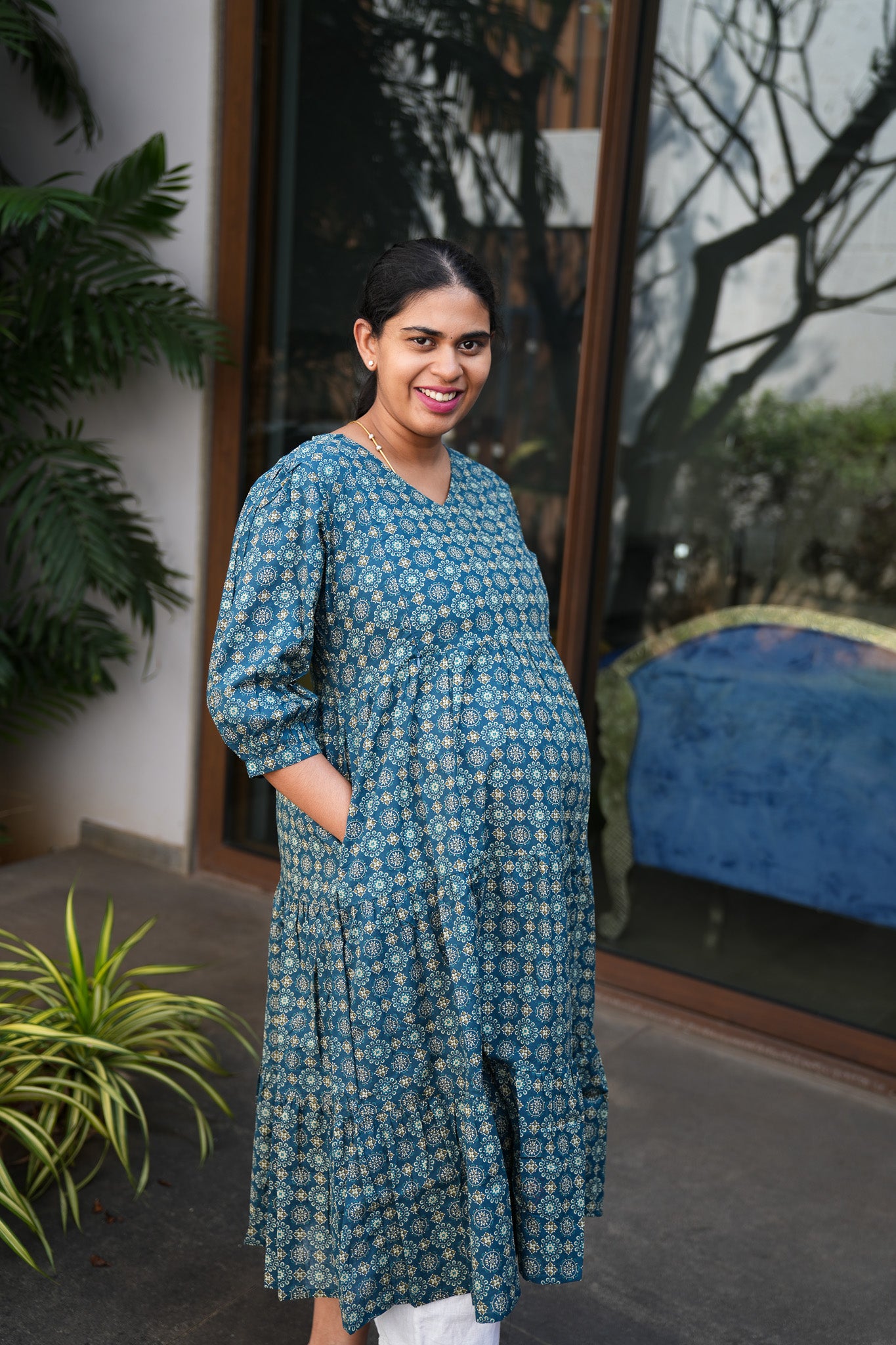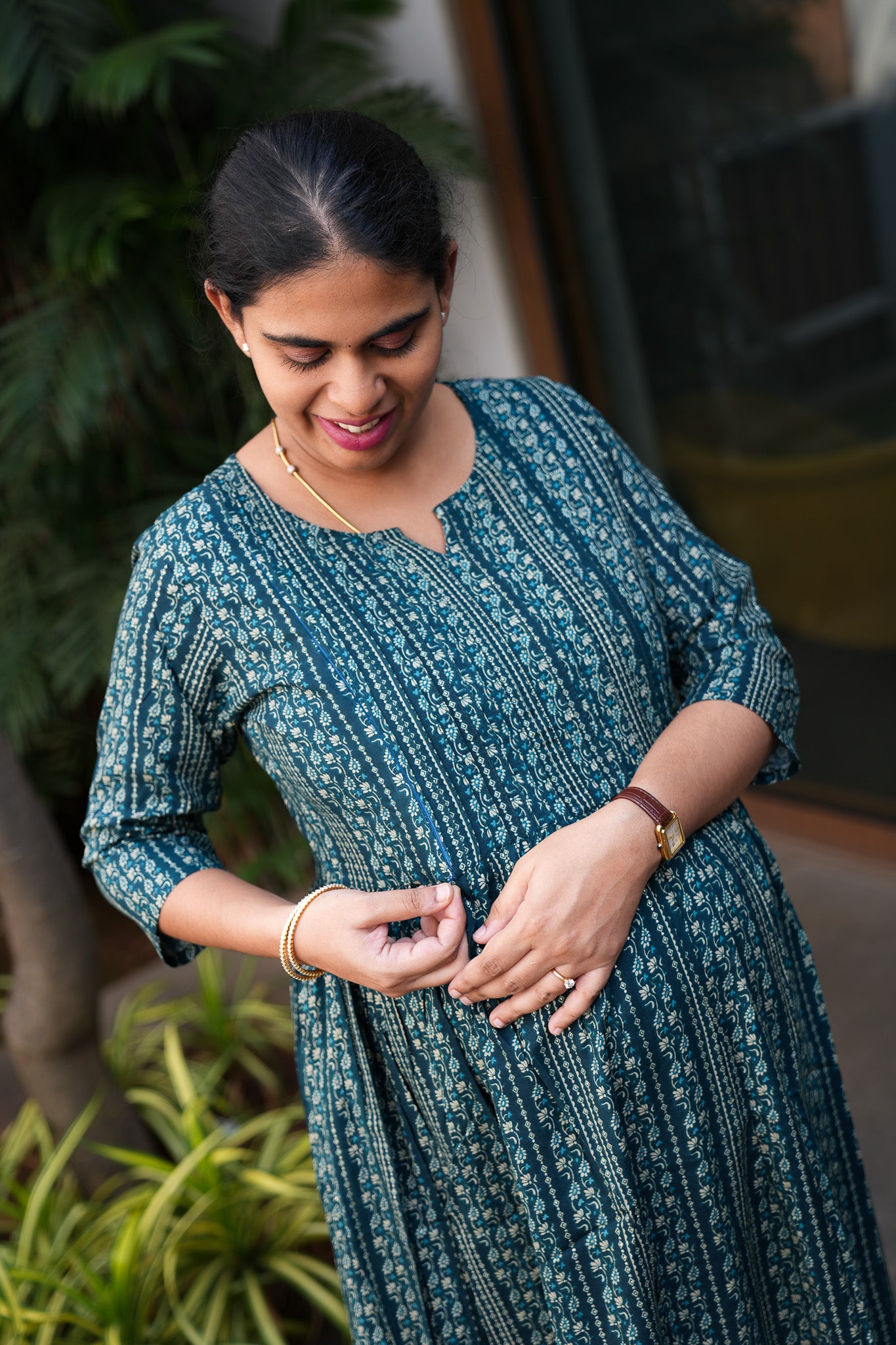 Sea green maternity nursing wear with round neck and 3/4 sleeves that accomodates the bump throughout nine months and has invisible zip on both sides to carefully feed baby. It is light weight and soft to help you get through pregnancy and breastfeeding journey with ease.
