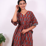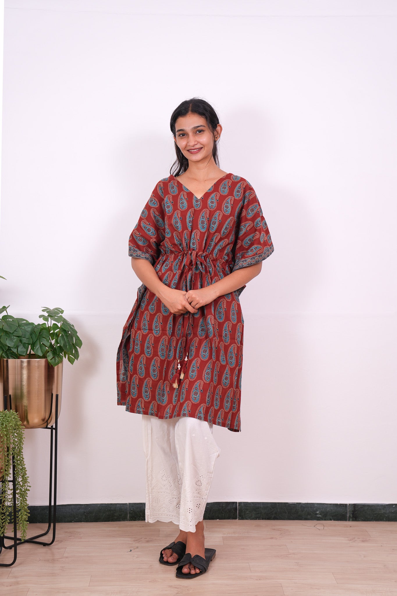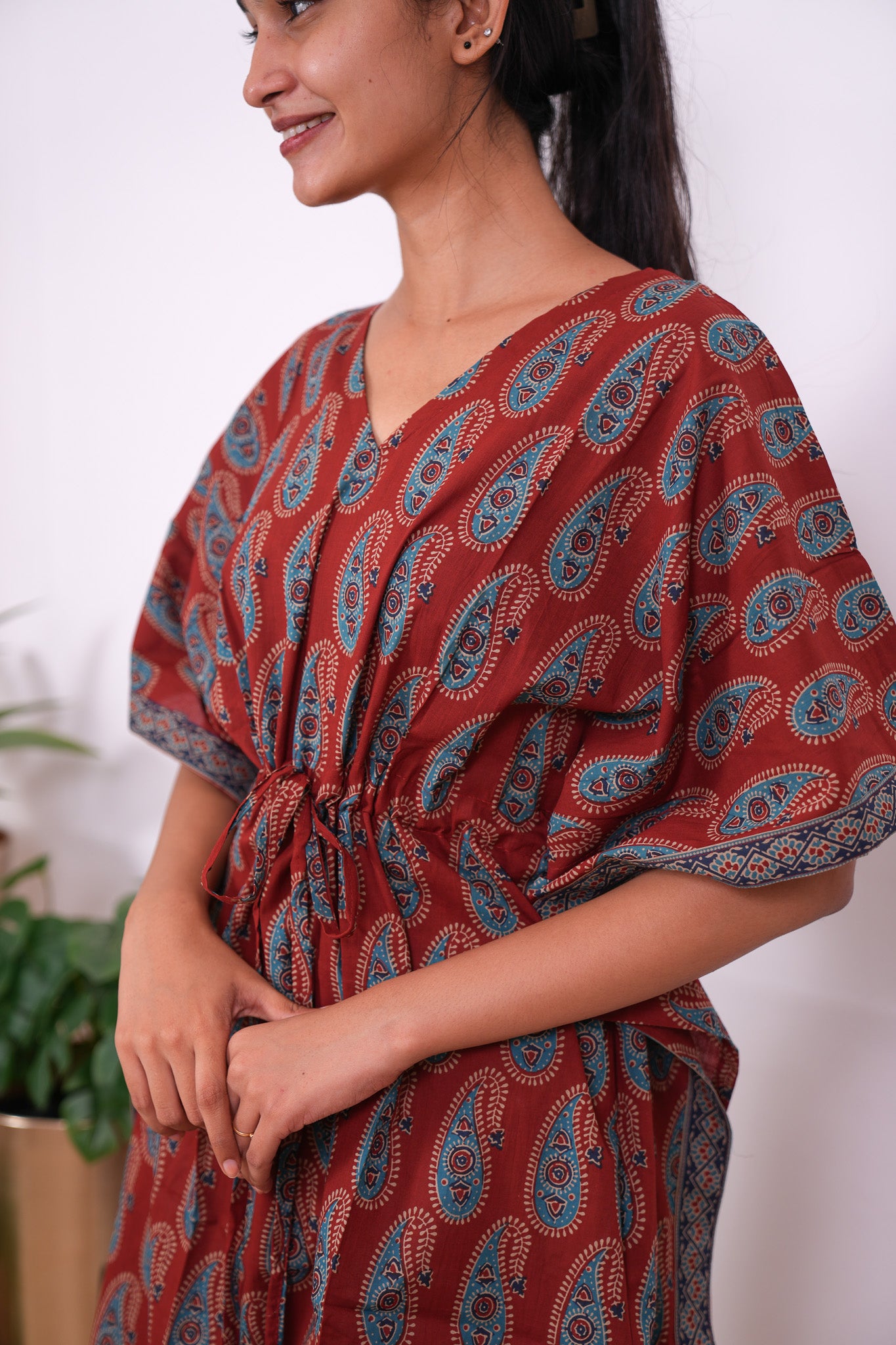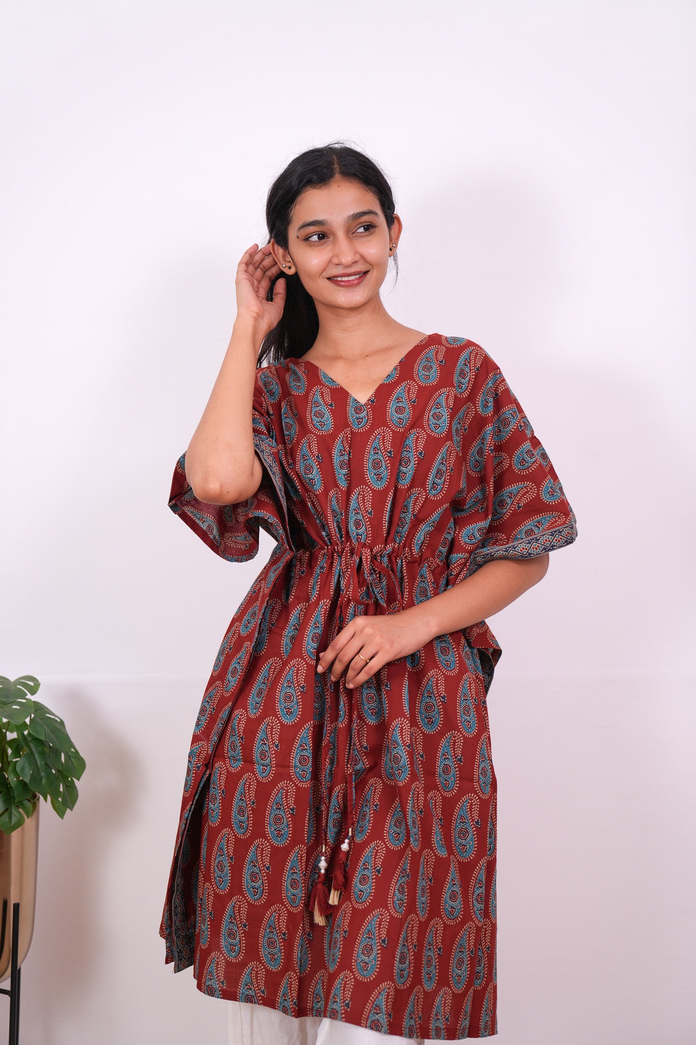 Easy breezy cotton kaftan made for you to feel absolute comfort, elegance and a total stunner at the same time. It comes V neck and tie in the centre with flowy silhouette and floral prints all over.