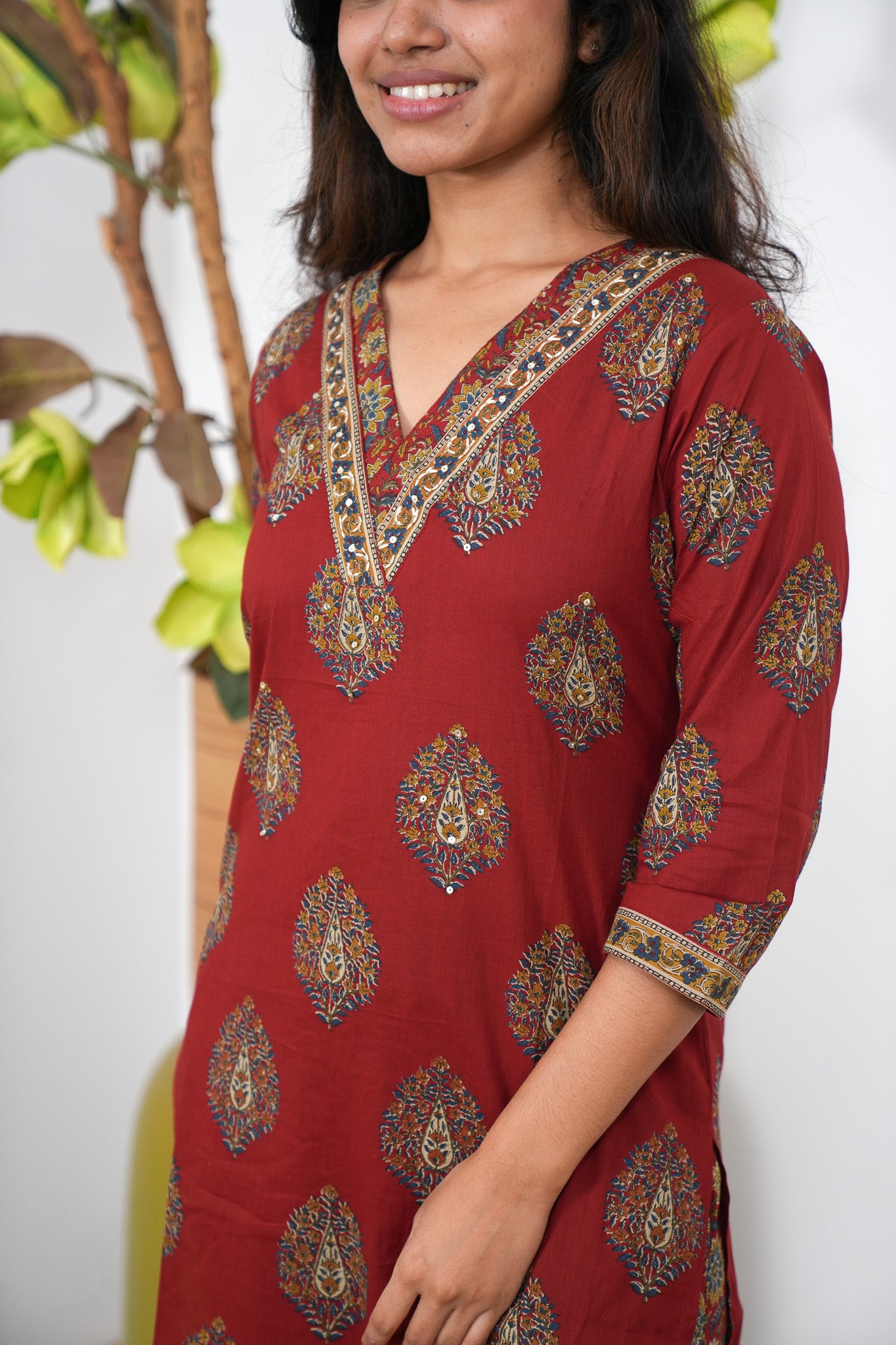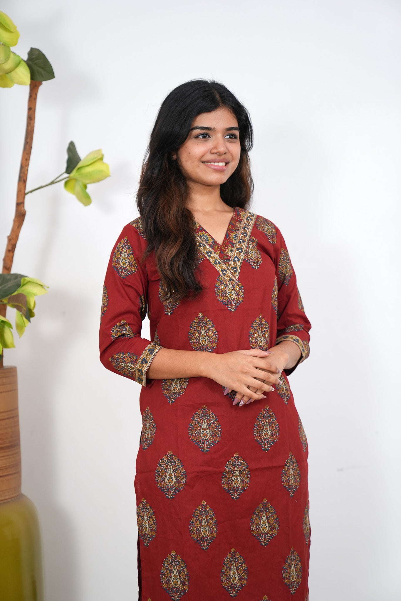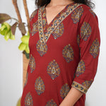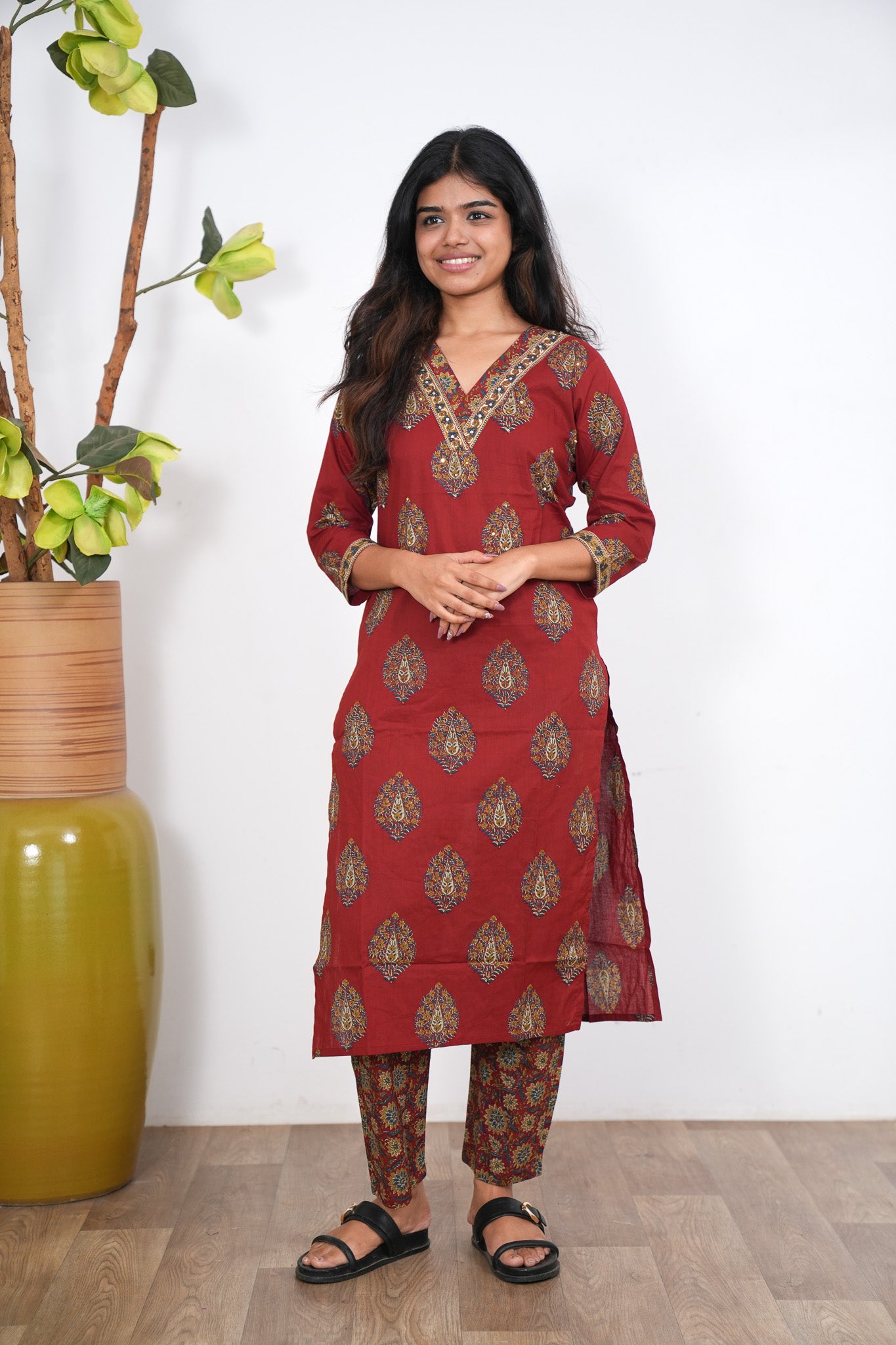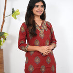 Sindoor v neck cotton co-ords set which can be paired together or with jeans for a easy breezy summer outfit. It comes with round neck and elbow length sleeves with straight pants