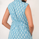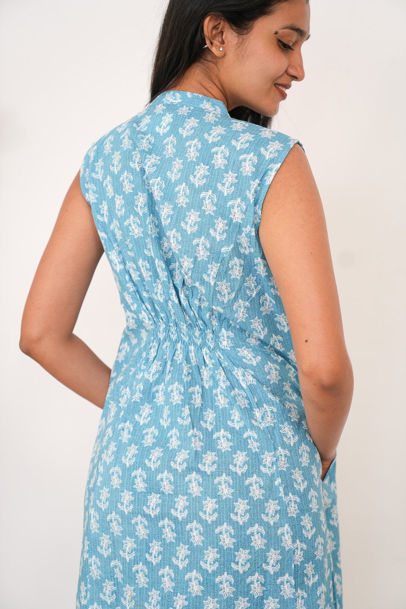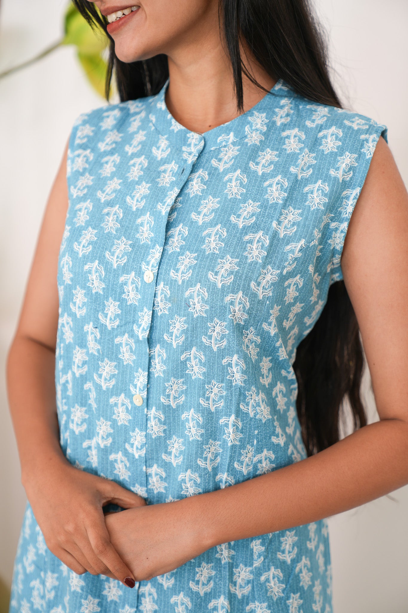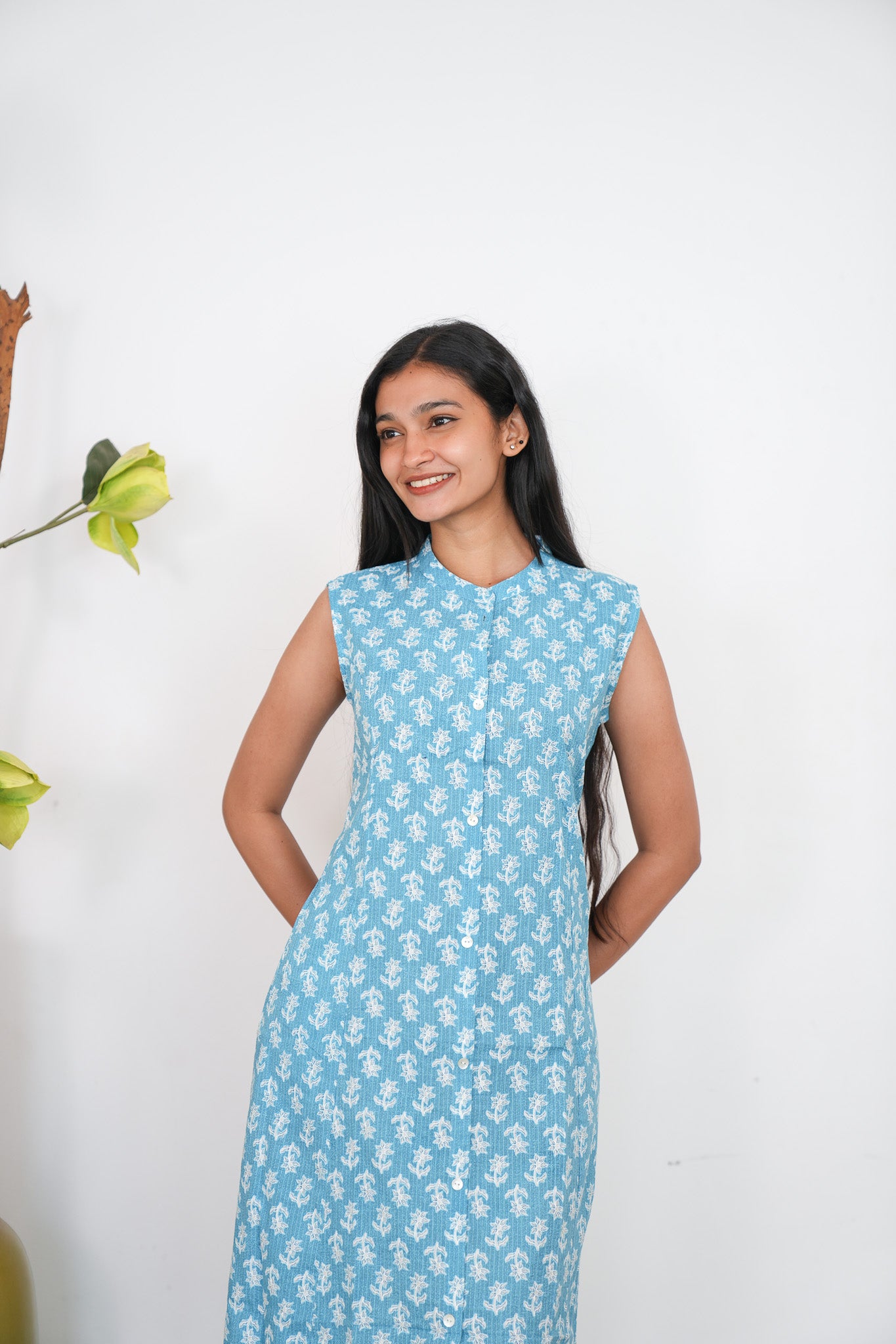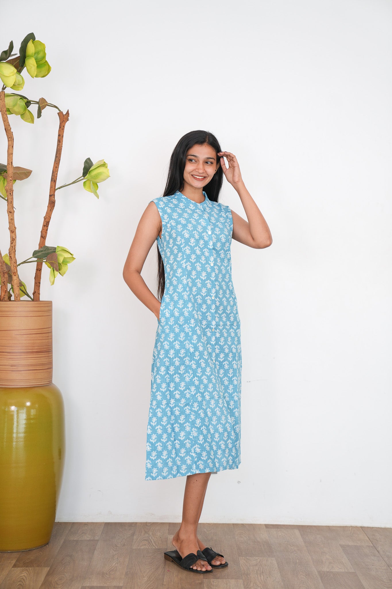 Sky blue  mandarin cotton shirt dress that exudes elegance and sophistication. It has buttons running down. Buttons cannot be opened.