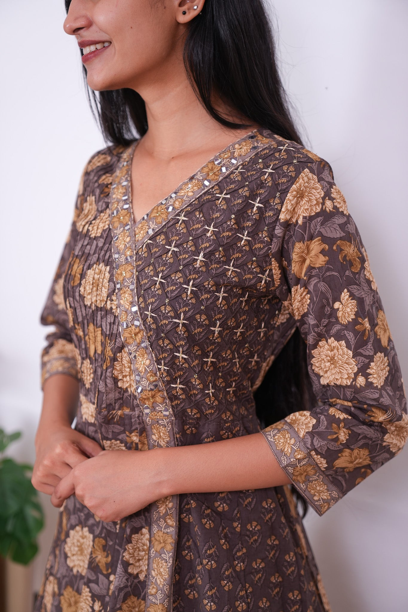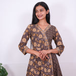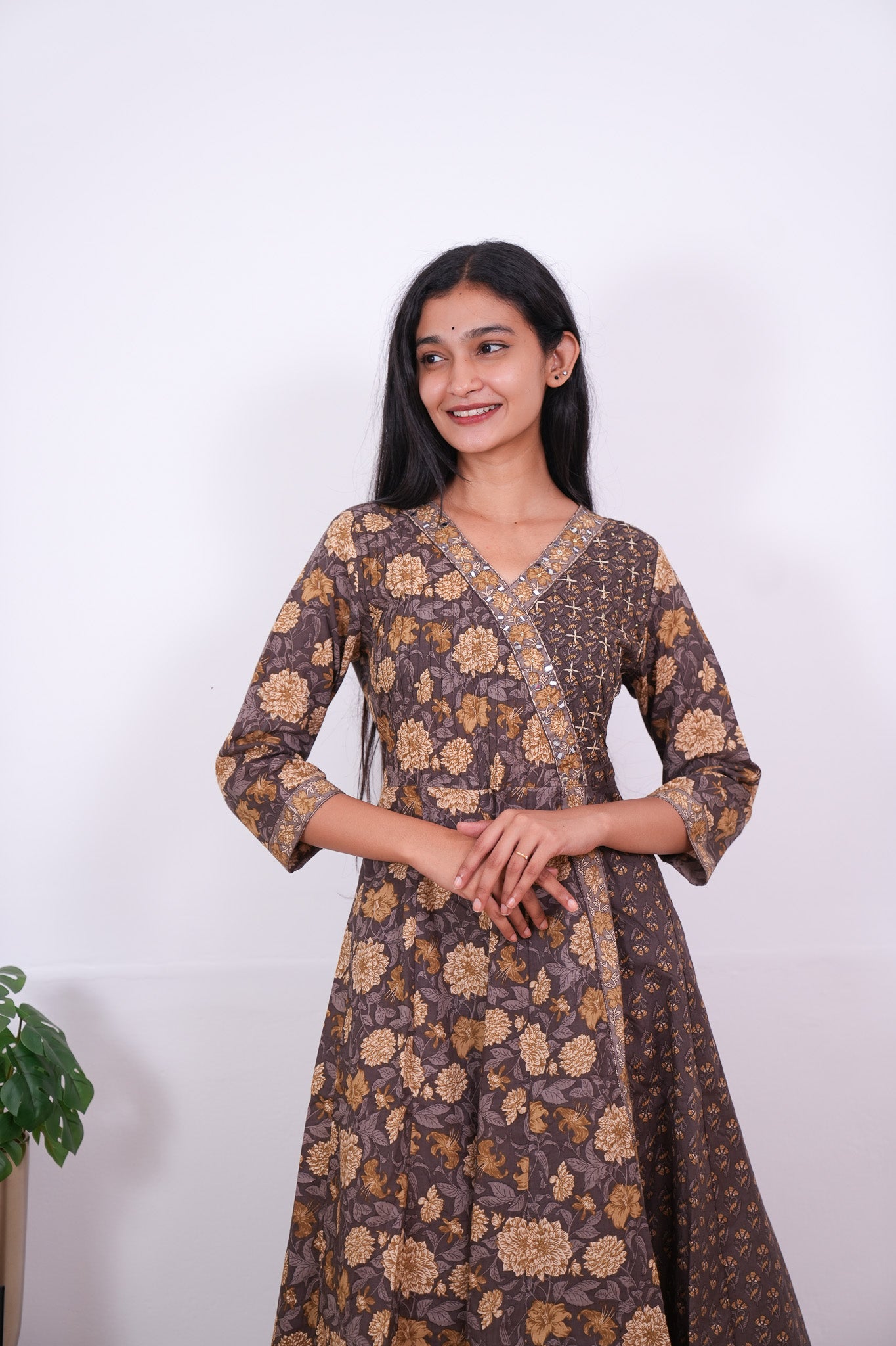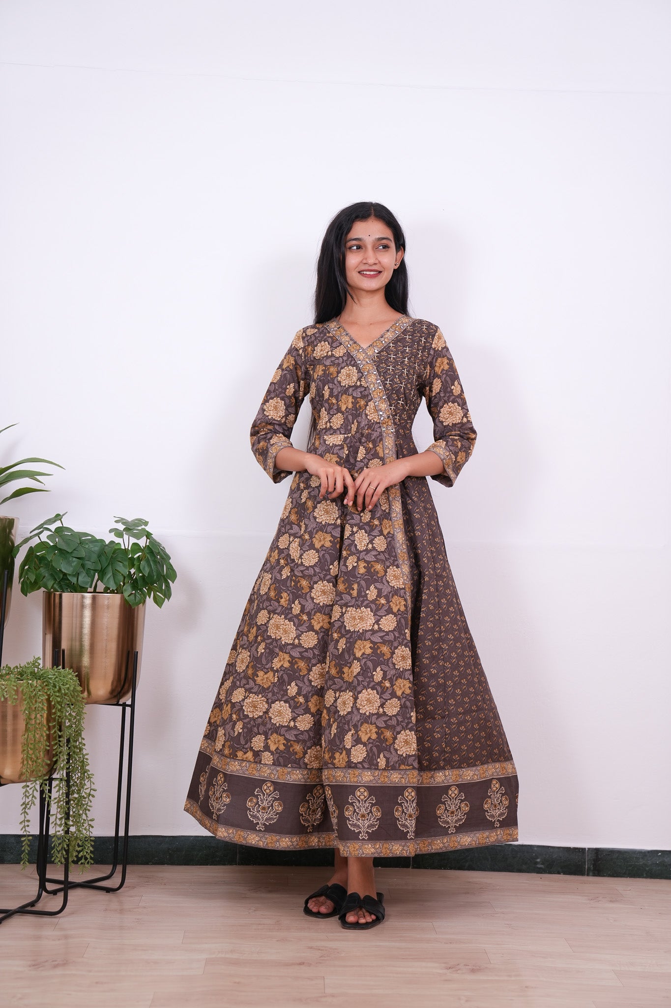 Brown cotton long gown that exudes elegance and sophistication. It has floral print throughout the gown.
