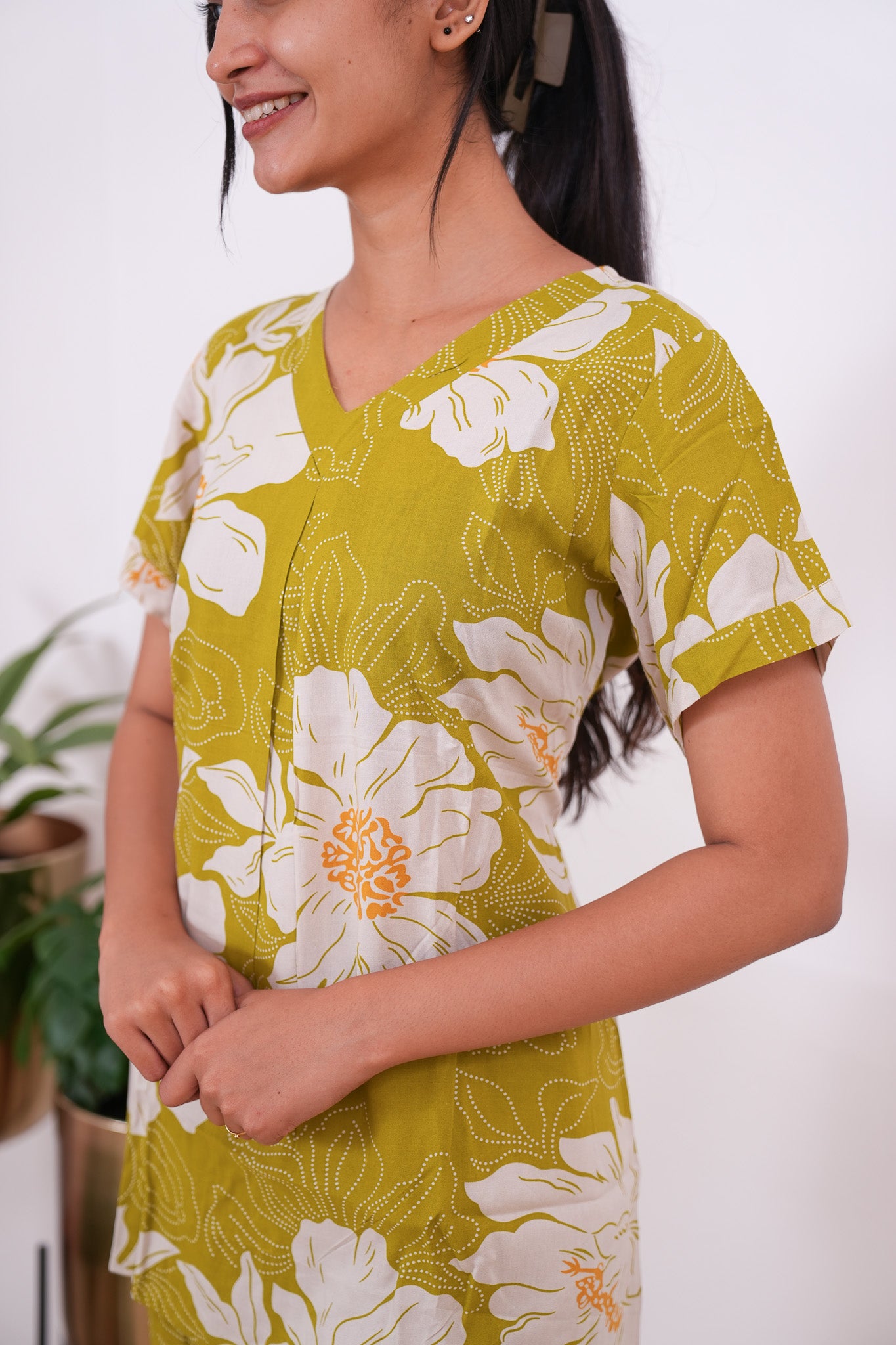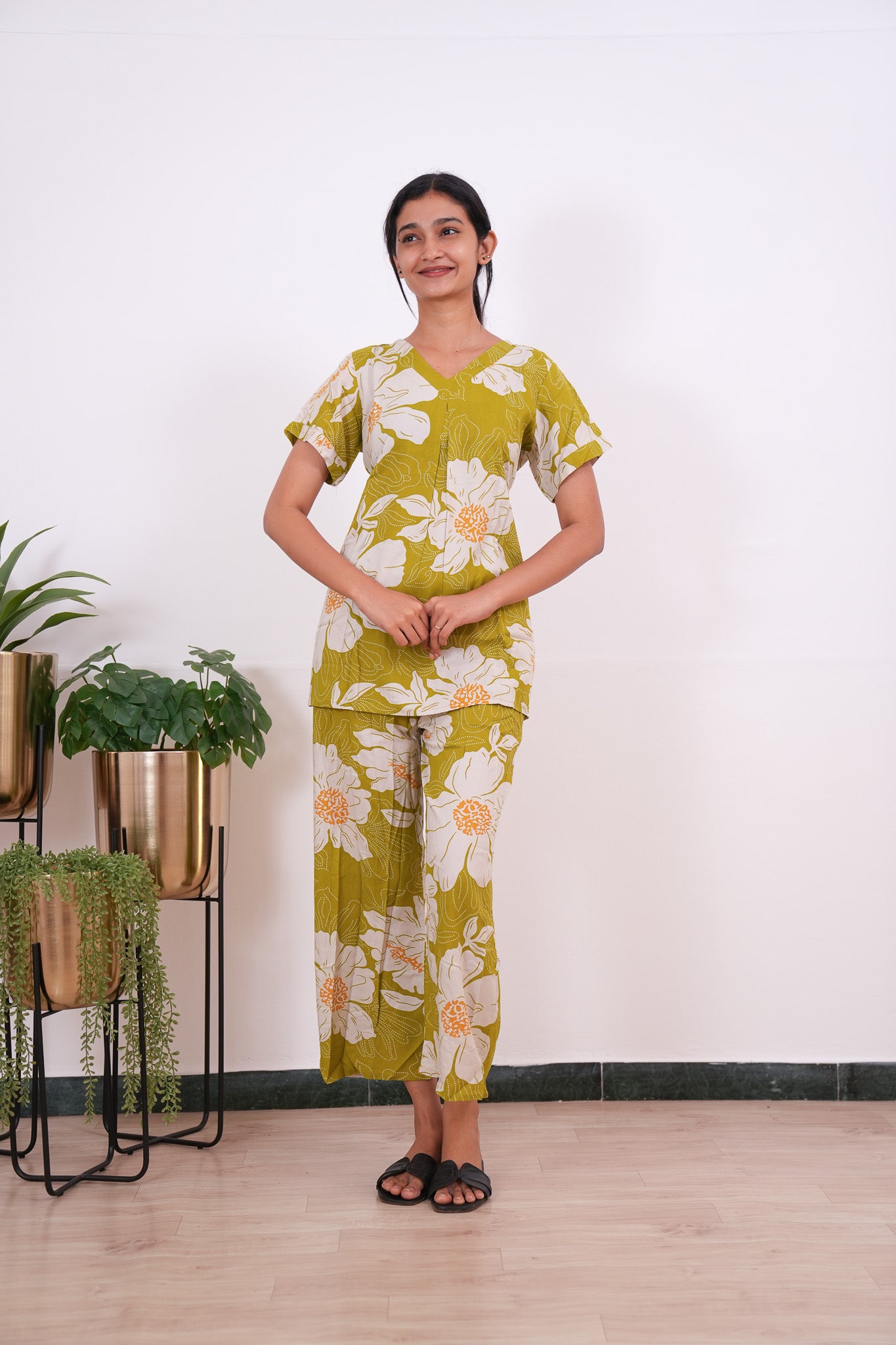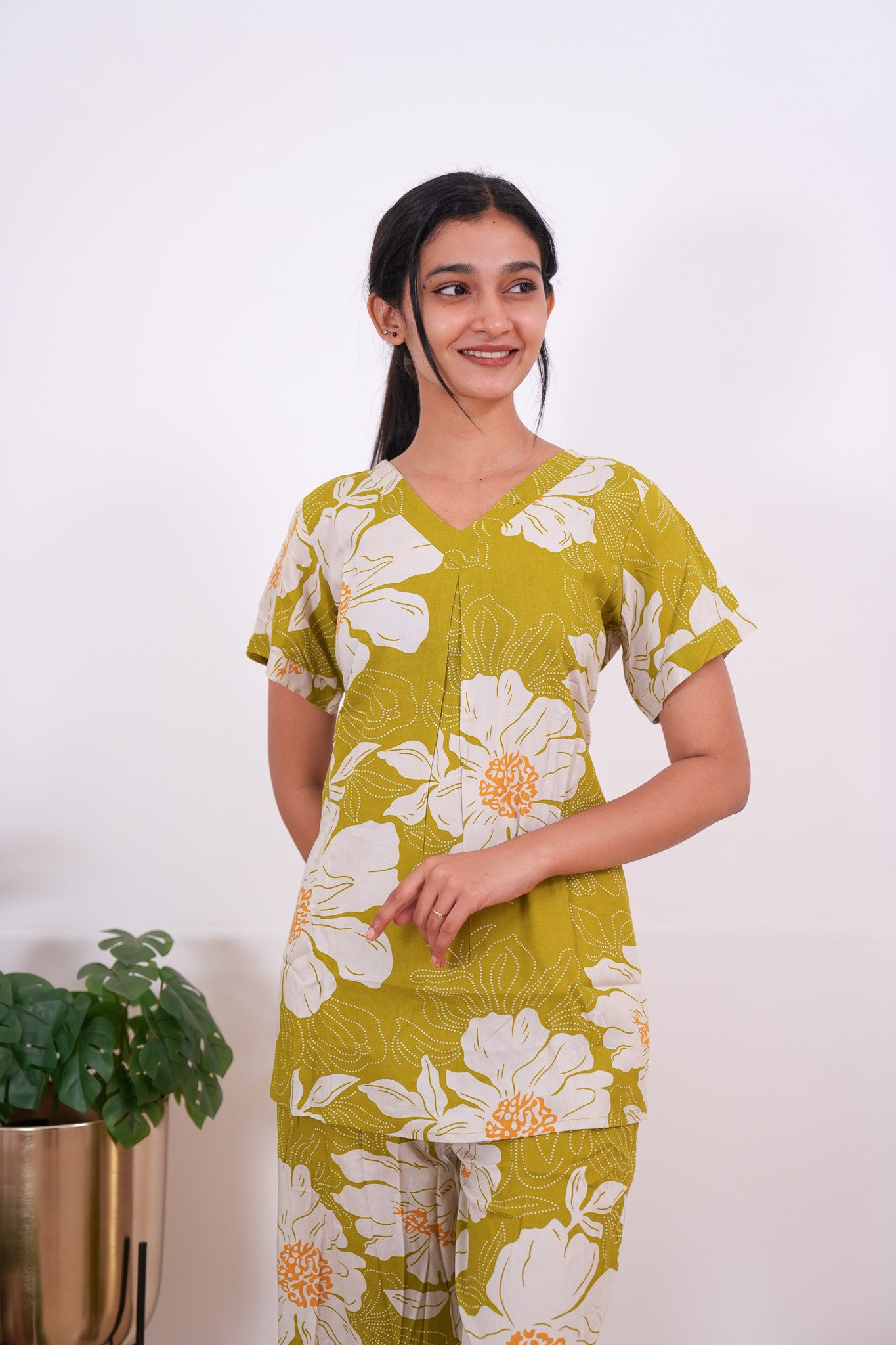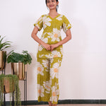 These Co-ords are so cozy, comfortable and chic making it perfect to relax at home or sleep in them. The top has a V neck with short length sleeves. Pant comes with elastic and it has a straight fit.