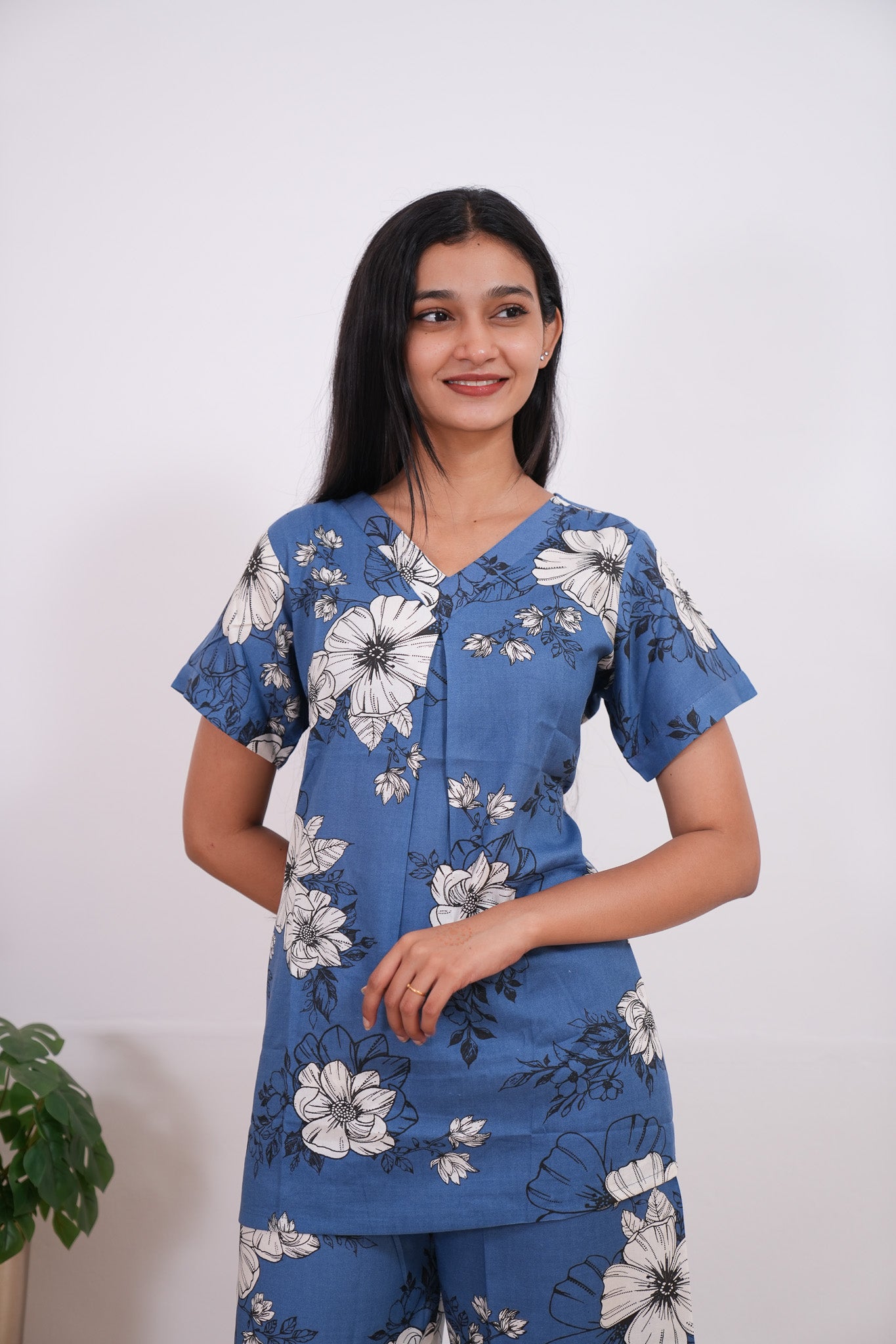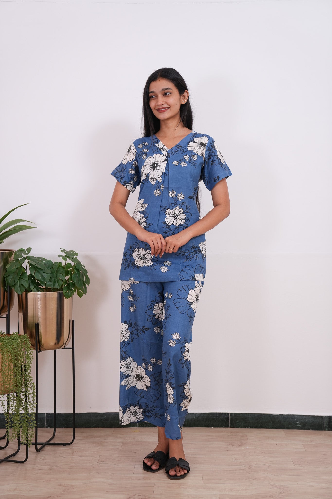 These Co-ords are so cozy, comfortable and chic making it perfect to relax at home or sleep in them. The top has a V neck with short length sleeves. Pant comes with elastic and it has a straight fit.