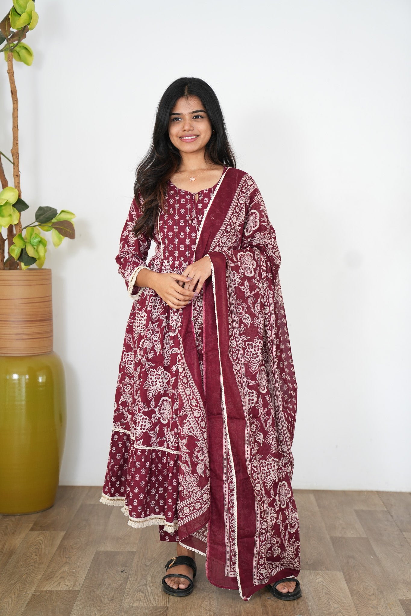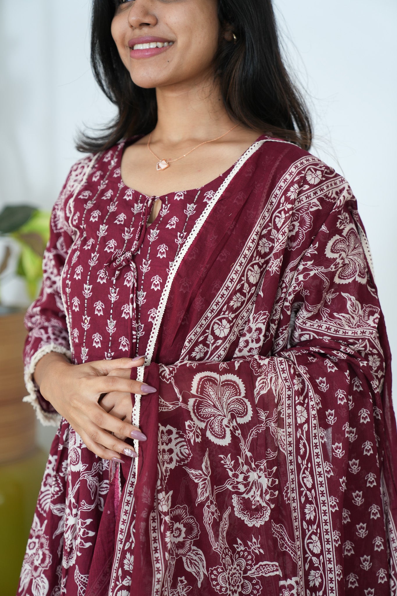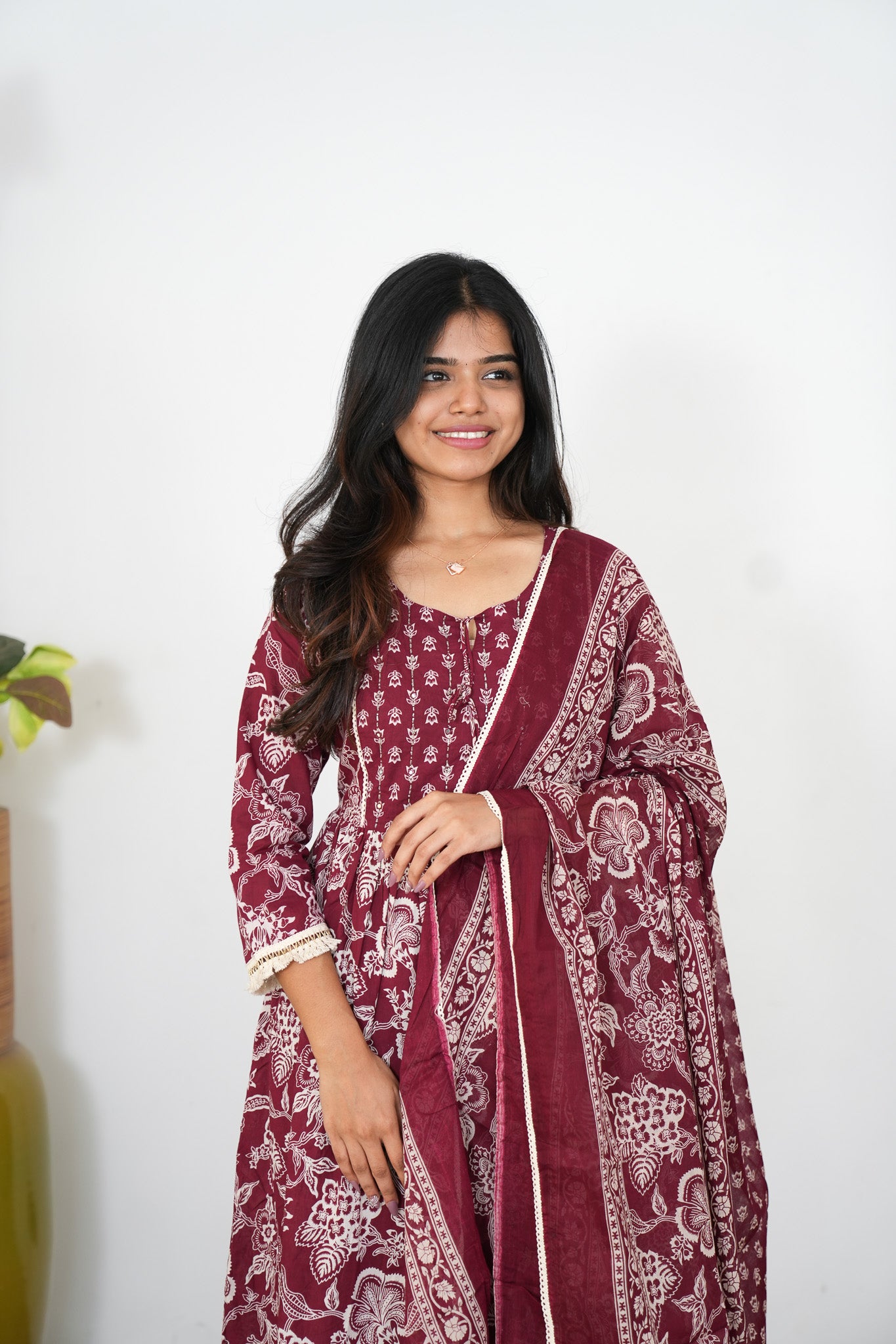 This stunning, vibrant cotton suit set has round neck with floral pattern allover kurta. The pant comes with an elastic and straight cut. It is paired with matching cotton dupatta.