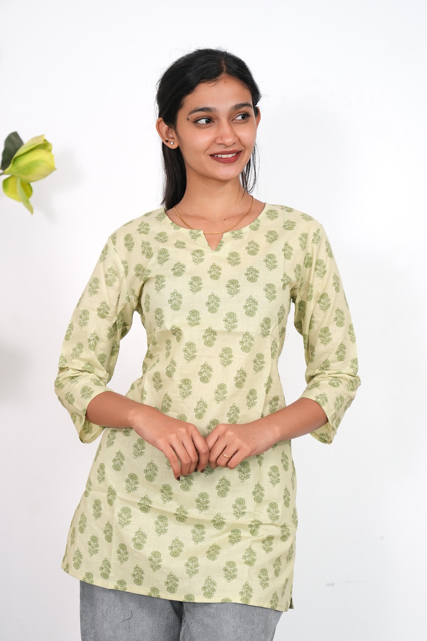 This cotton short kurti has round neck and 3/4 length sleeves they are extremely breathable and light weight making it perfect for all day comfort. They can be paired with jeans , skirt or even cotton pants.