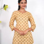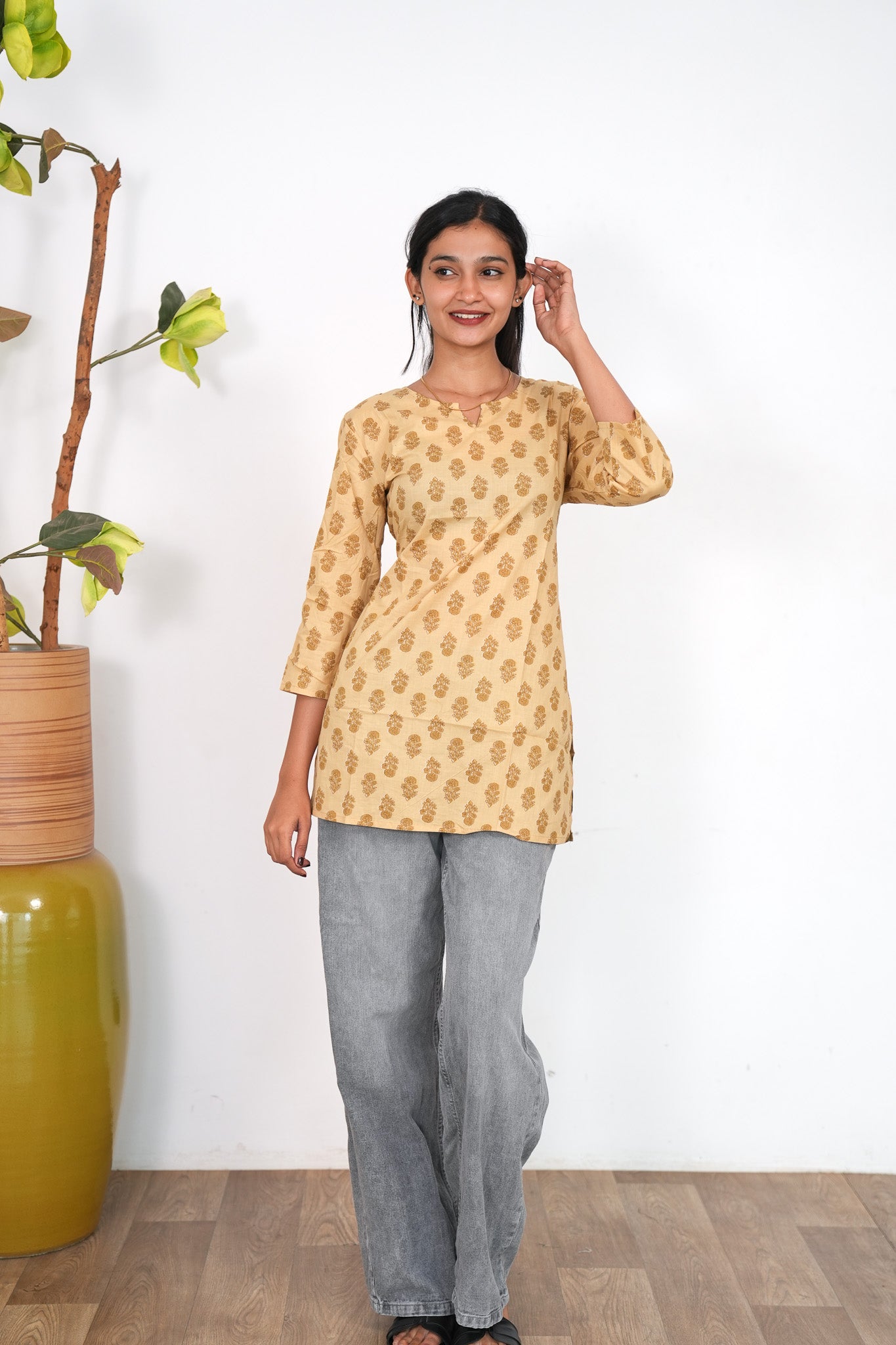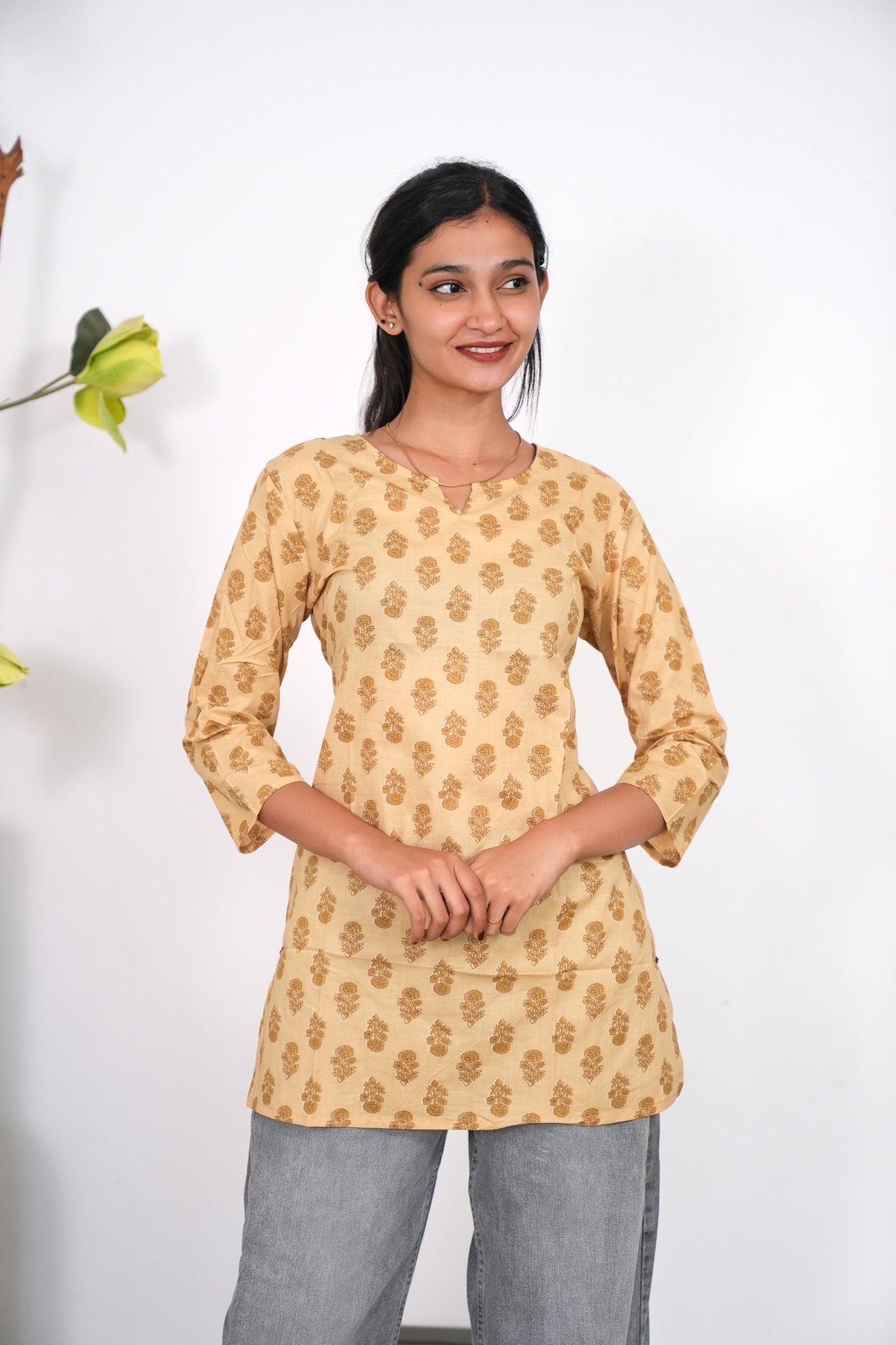 This cotton short kurti has round neck and 3/4 length sleeves they are extremely breathable and light weight making it perfect for all day comfort. They can be paired with jeans , skirt or even cotton pants.