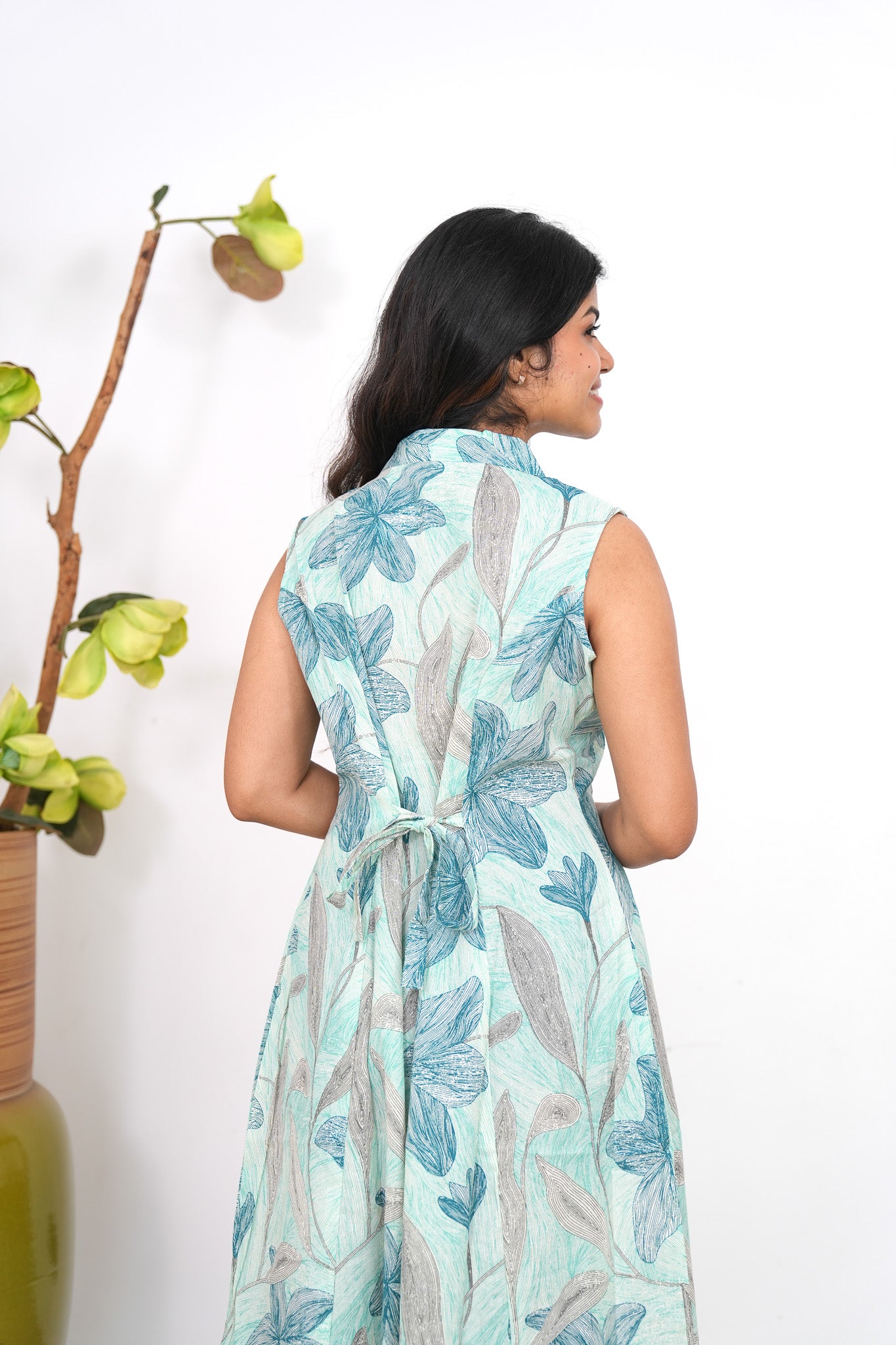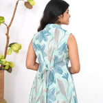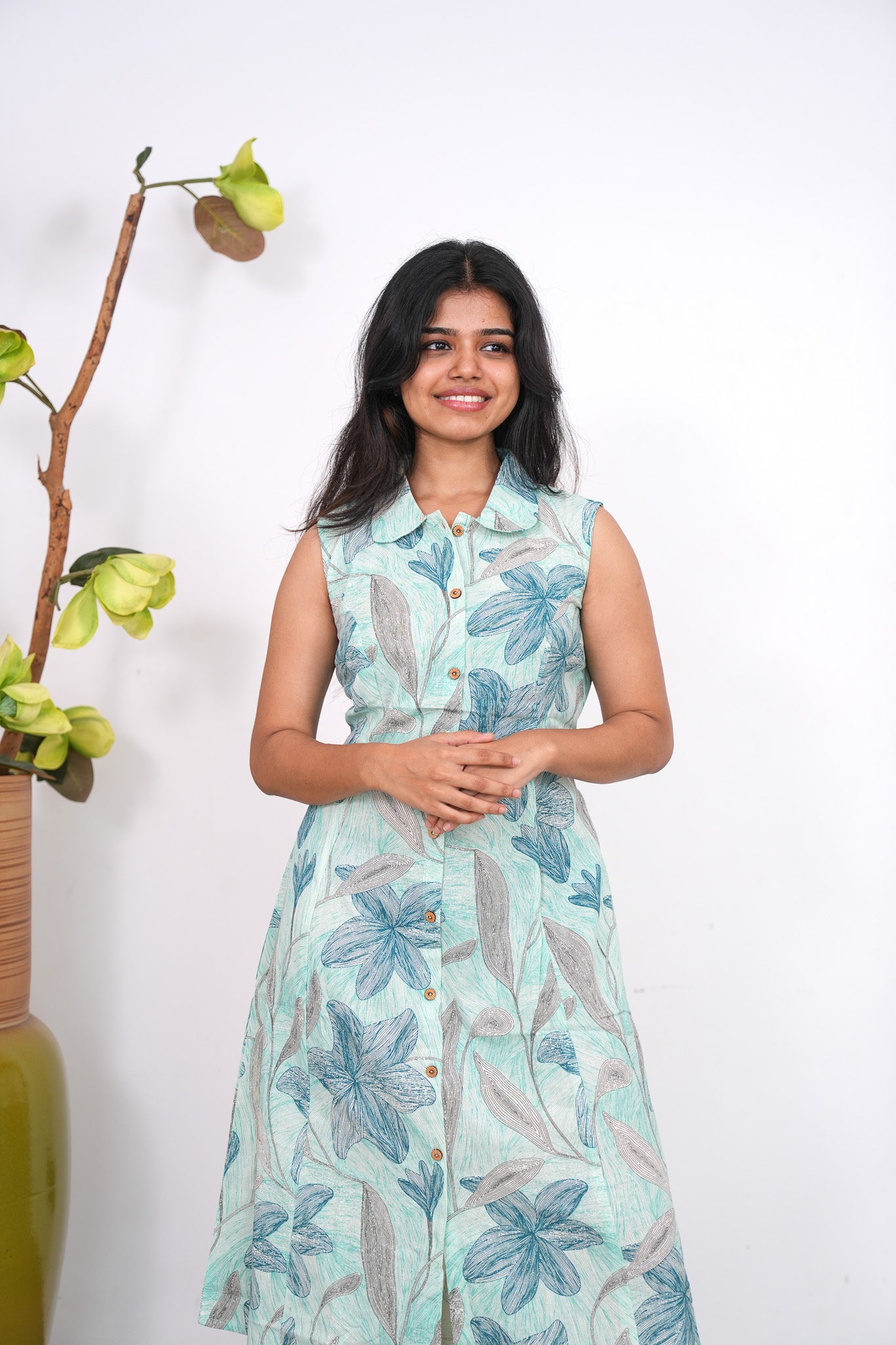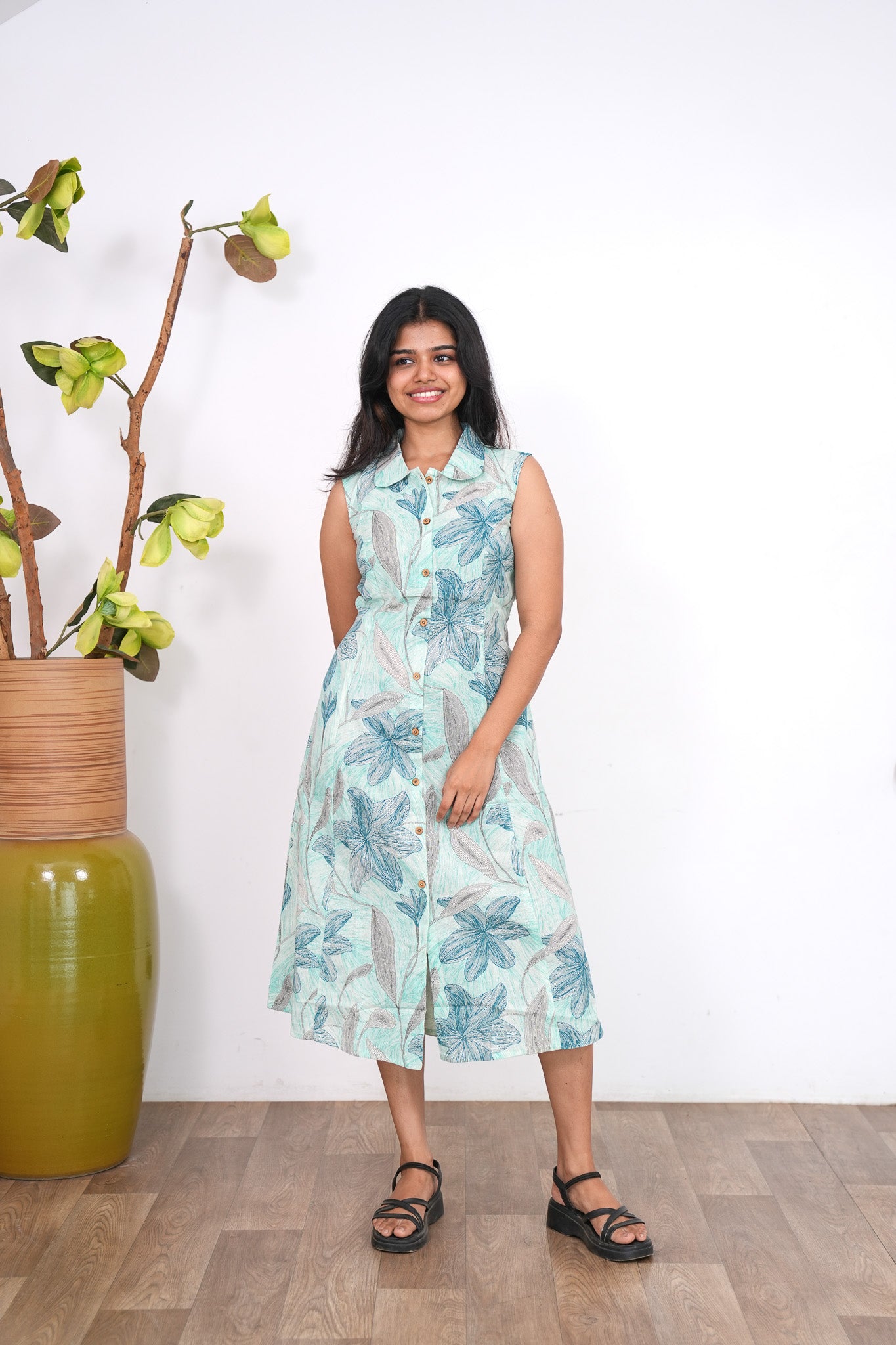 Turquoise cotton shirt dress that exudes elegance and sophistication. It has buttons running down.